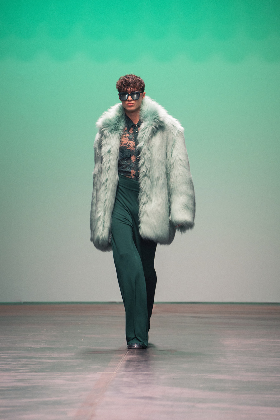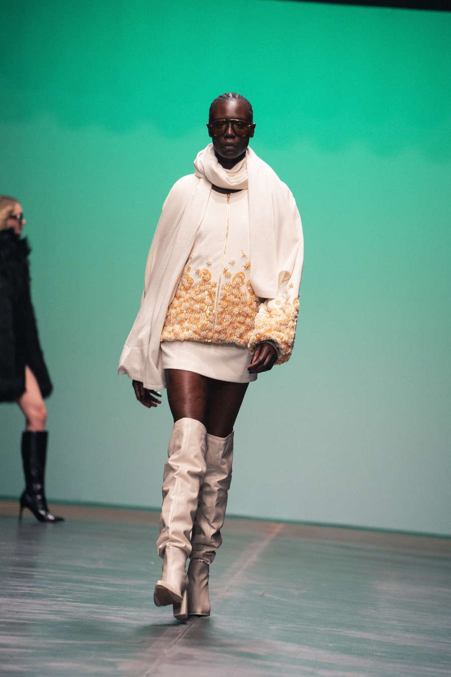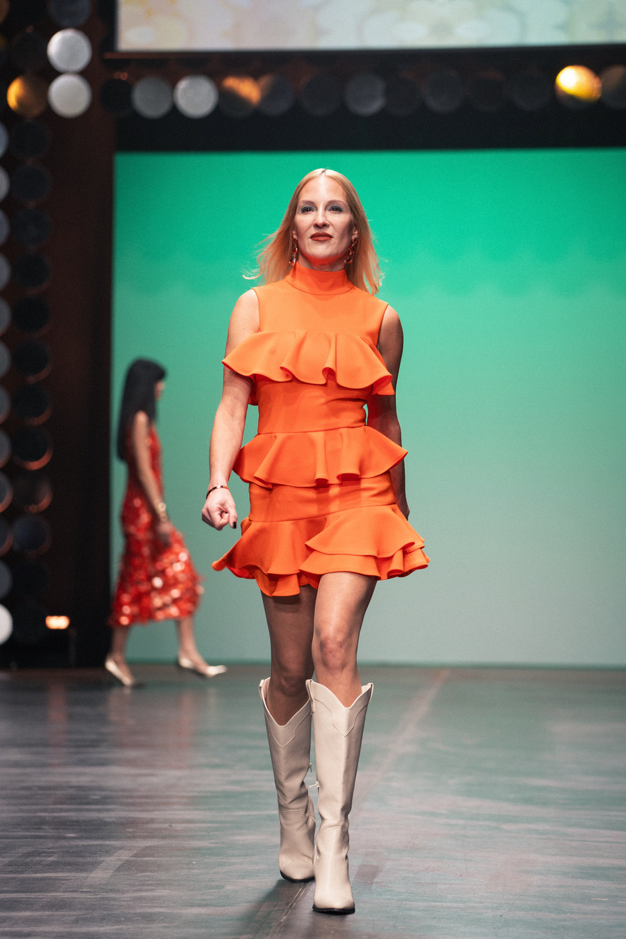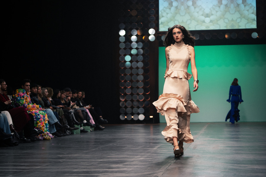 To add softness, sensuality, and a touch of sexiness to the linear prints, the designer pairs them with opulent, flowing ruffles. A palette of cream, orange, mint, silver, green, and petrol captures the energizing spirit of the night, skillfully combined with luxurious materials such as faux leather, silk, and fine knits. The creations—ranging from cocktail and evening dresses to tailored suits and flowing kaftans—radiate a rare balance between luxury and everyday wearability.