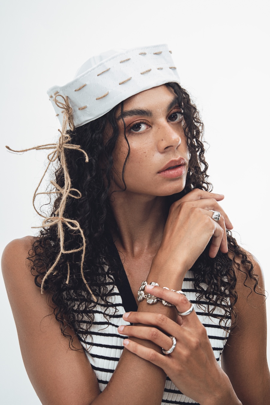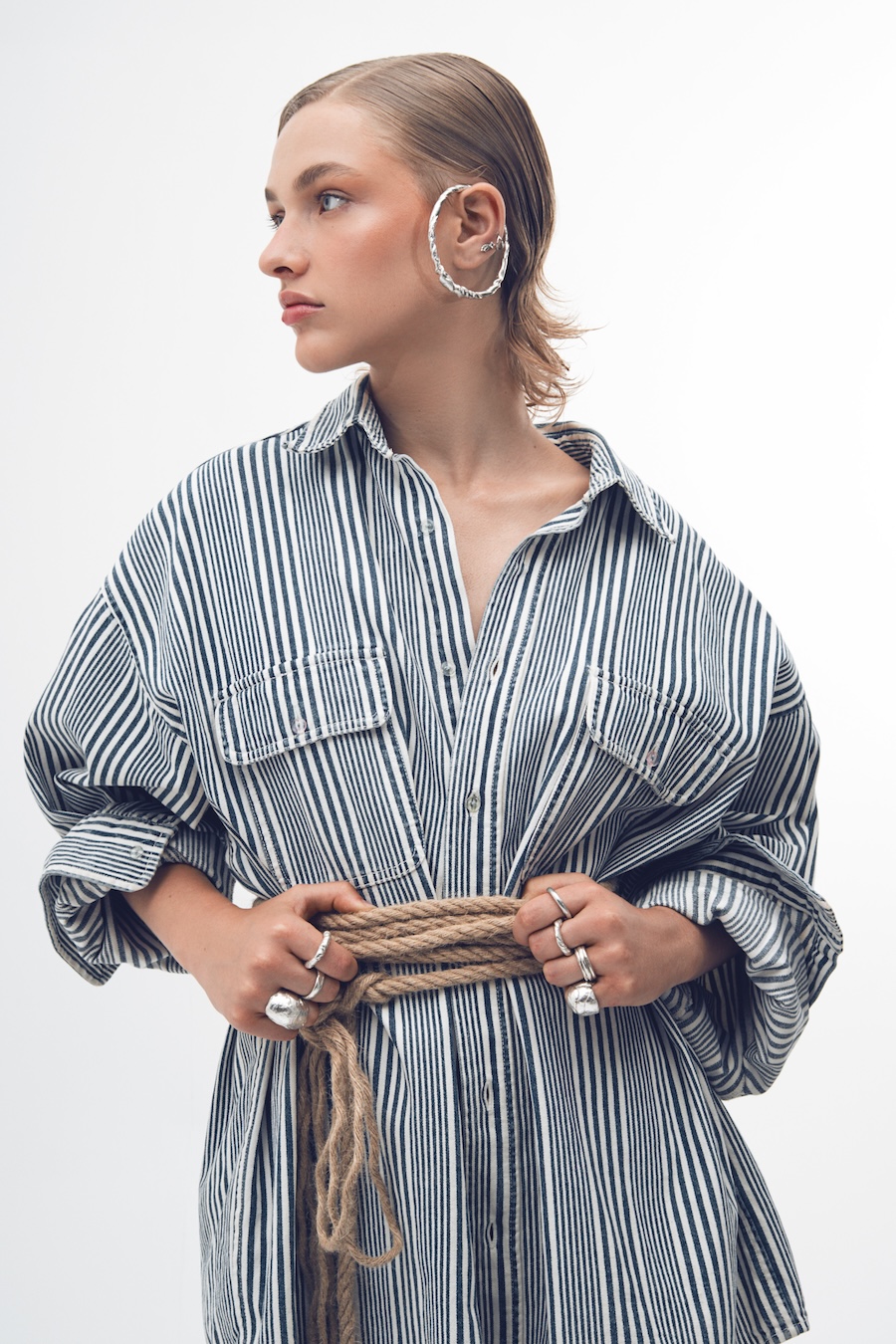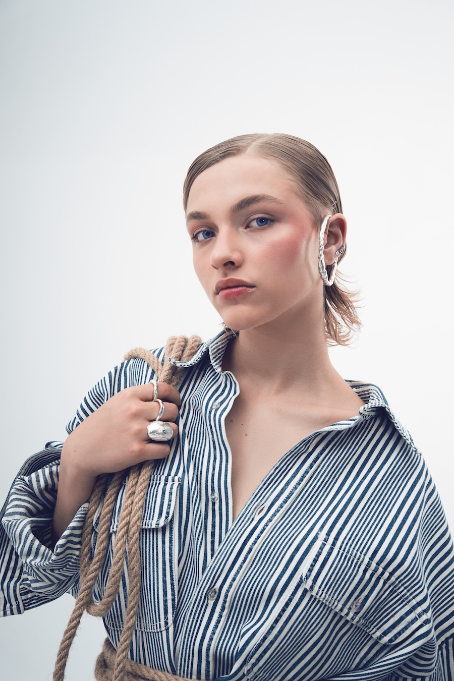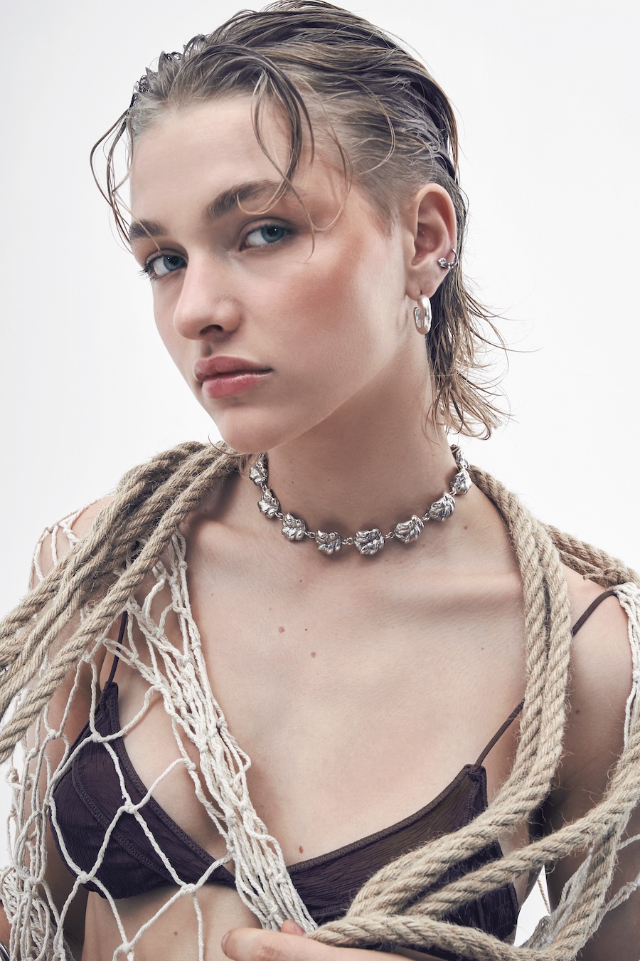 “The use of jewellery, especially earrings, among historical pirates is a fact supported by various sources. These ornaments served multiple purposes, from symbolising achievements and experiences to acting as protective amulets or even economic resources in difficult situations. However, the image of pirates overloaded with jewellery is more a myth fueled by popular culture than a historical reality. In this editorial, we draw inspiration from both the uniforms worn by sailors throughout history and the materials and surroundings that have shaped them, such as chains, fishing nets, and knots. It is an ode to the sea.”