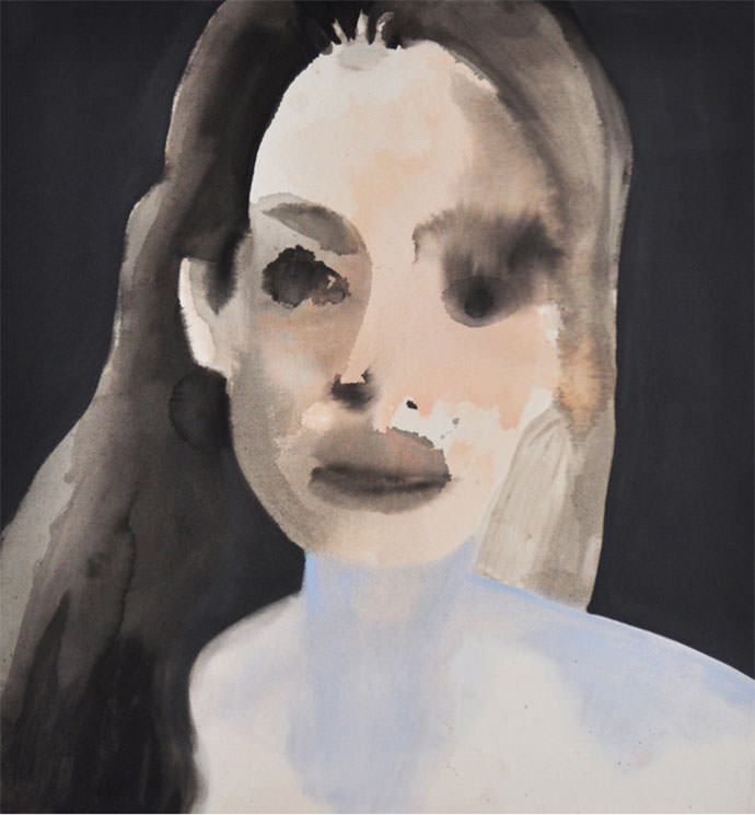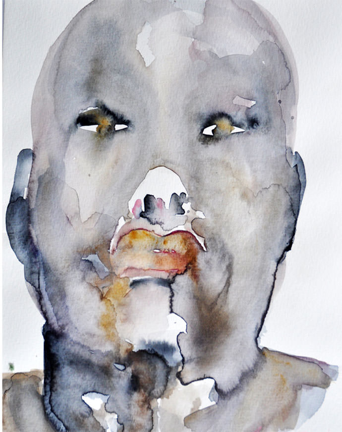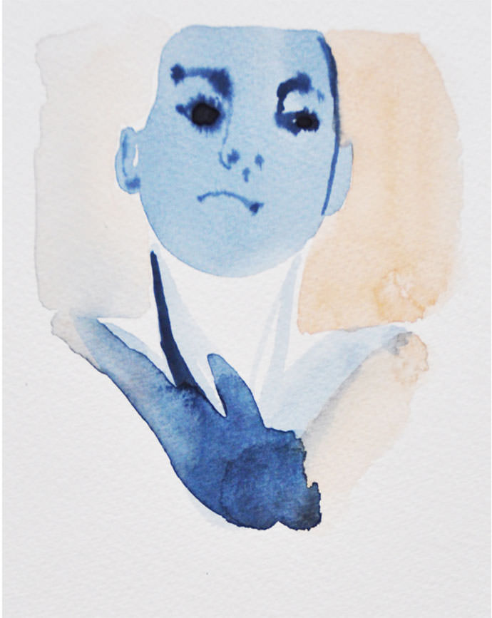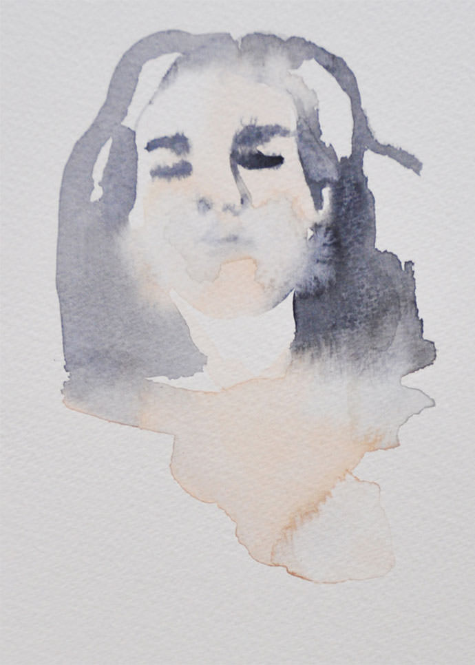 “Marie Claire is a both a girl and the embodiment of a time period. She is best described by this citation: “The futility with which Marie Claire hauls herself through the day, avenges itself in the hours of the night. She is not tired, but is haunted by the realisation that it is time for her to grow up, apprehending that she has been desperately holding on to her carefree childhood. She has been falling asleep with her eyes open and longs to dream with her eyes shut, just as they are when she laughs whole-heartedly.” During this period, I have only been painting her head, time and time again trying to get closer to the crux of her as a person epitomizing a certain period of time. Limiting myself to a small framework and using watercolours resulted in a battle with water, in which it has been key to find out to what extent I can control the medium and how I can anticipate contingencies. I am always wondering when to leave the paper alone, when it is breathing just enough.”