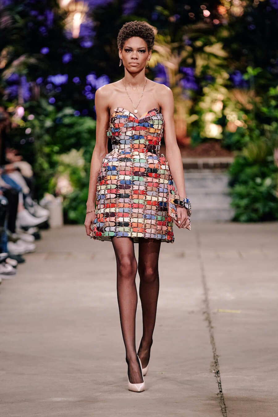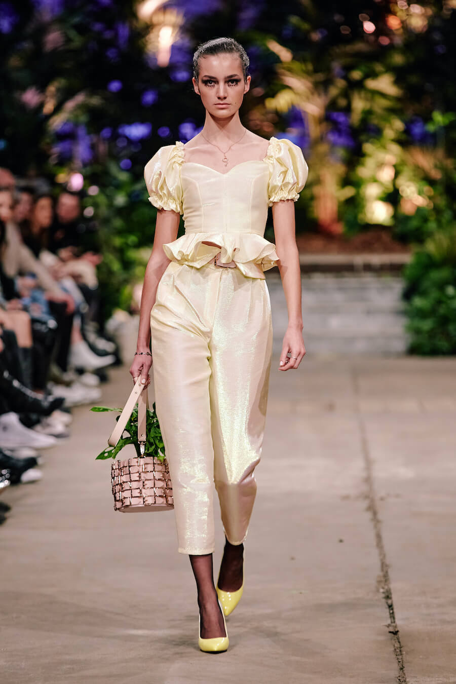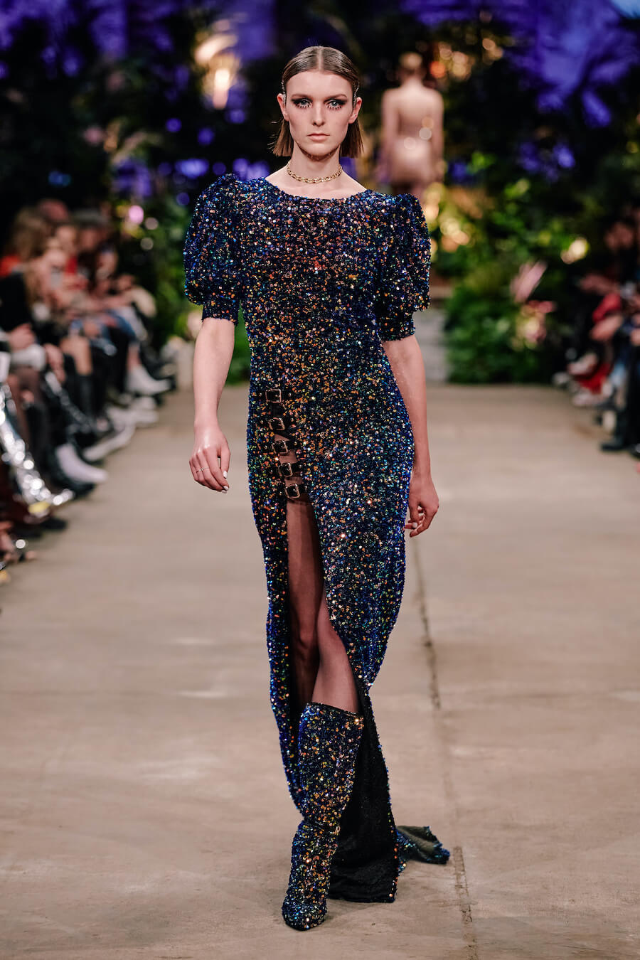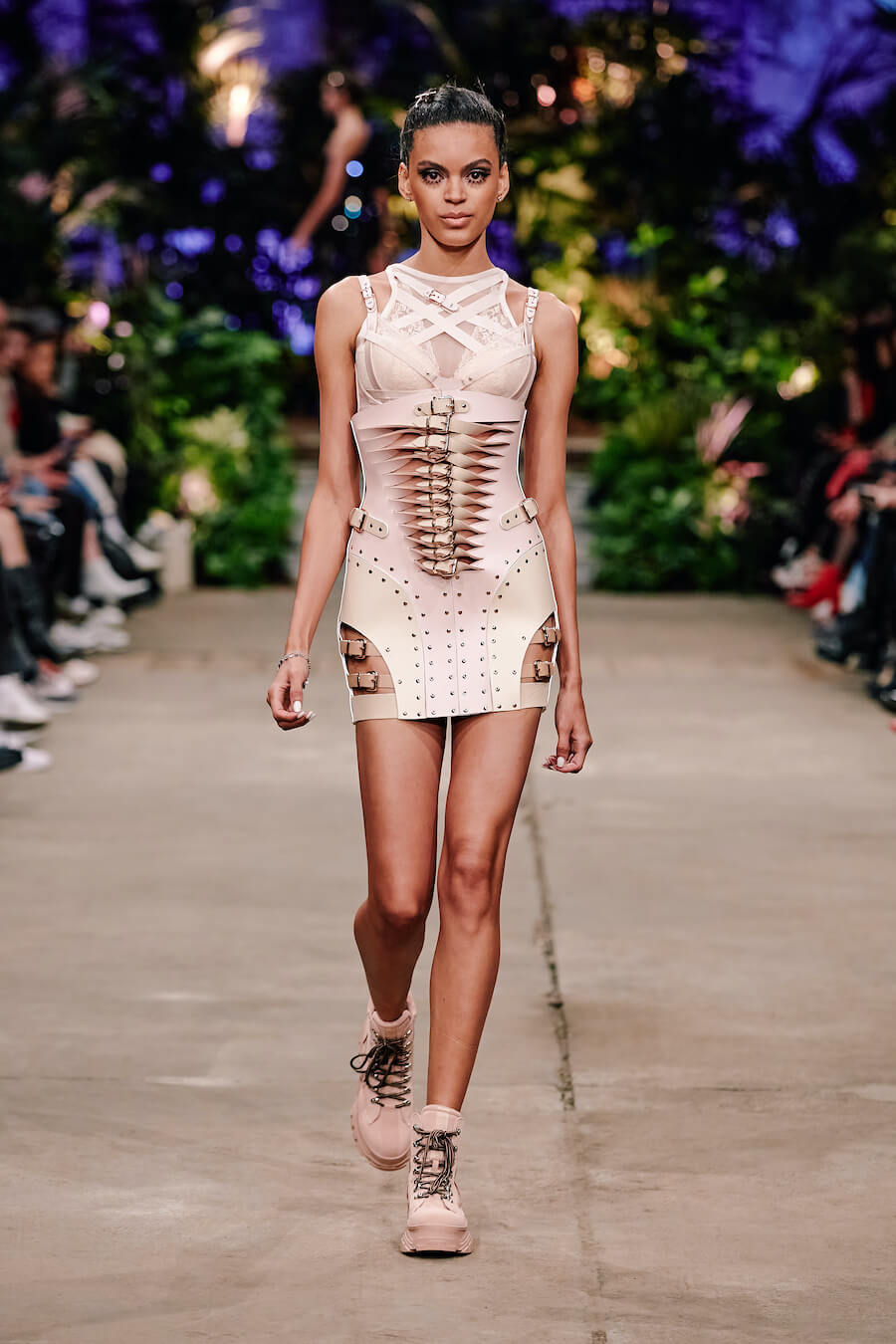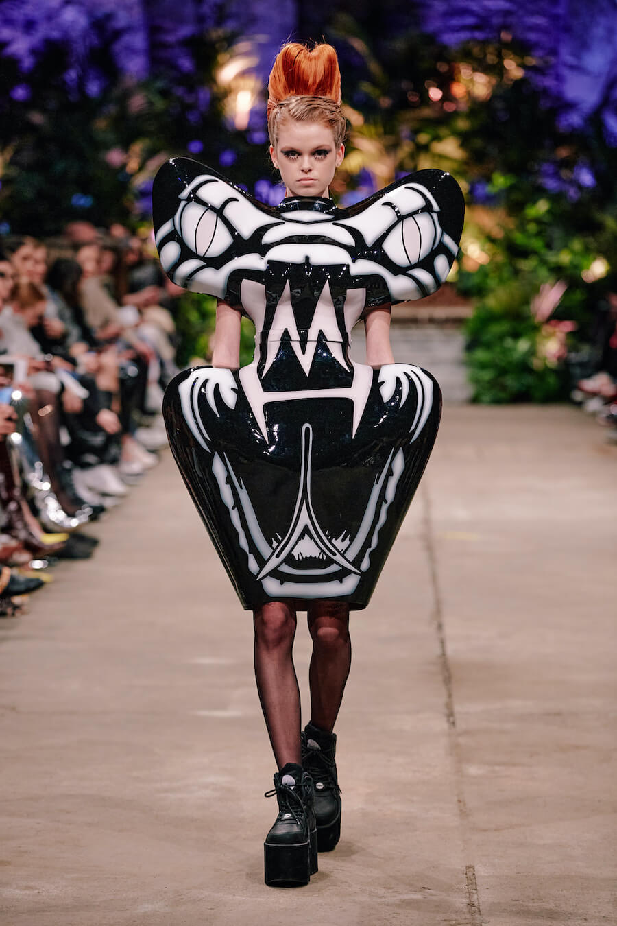 For the first time, the label presents a trouser suit in Marina Hoermanseder’s signature style. It evokes elegance and feminine power, just like her sleek leather biker jacket. The latter comes with unconventional puffed sleeve styling, offset by tight leather trousers that draw the eye with clever cut-outs. Imitation snakeskin, iridescent materials and plush-inspired lingerie offer a deft nod to the 90s, the designer’s formative coming-of-age decade. www.instagram.com/marinahoermanseder