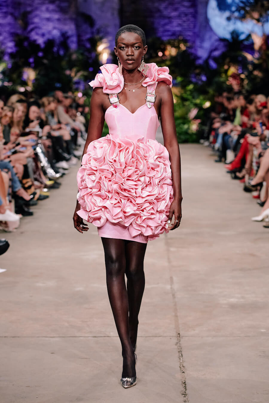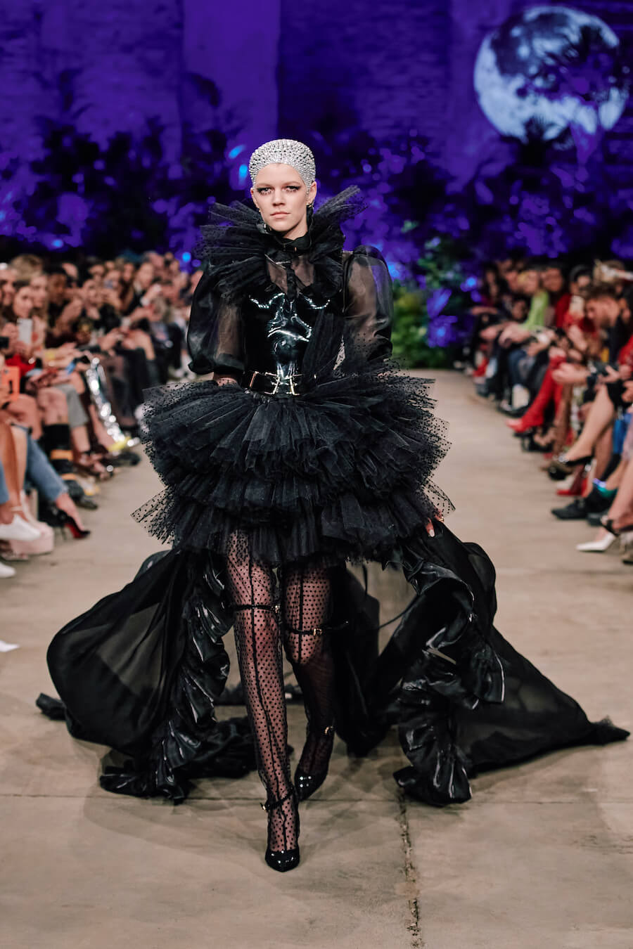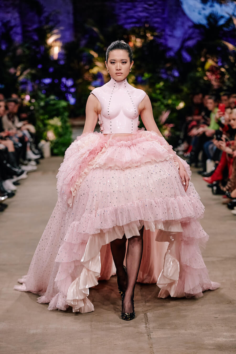 A dusky enchanted forest, governed by a queen in a sweeping, detailed baroque gown, is illuminated by the moon and the radiance of a dazzling creature from a faraway world clad in a glittering Swarovski dress. Their interplay of handcrafted leather flowers and flowing, undulating fabrics feels both mystical and strangely familiar. Puffy tulle with polka dots and tiny pink hearts accentuates a collection that exudes a soothing sense of gentleness. Hoermanseder’s love of 80s and 90s fashion, already apparent in previous collections, is unleashed in clear stylistic references to both of these decades. www.marinahoermanseder.com