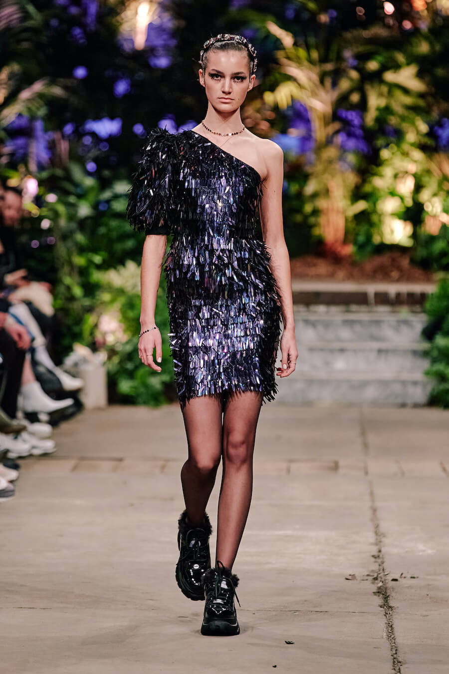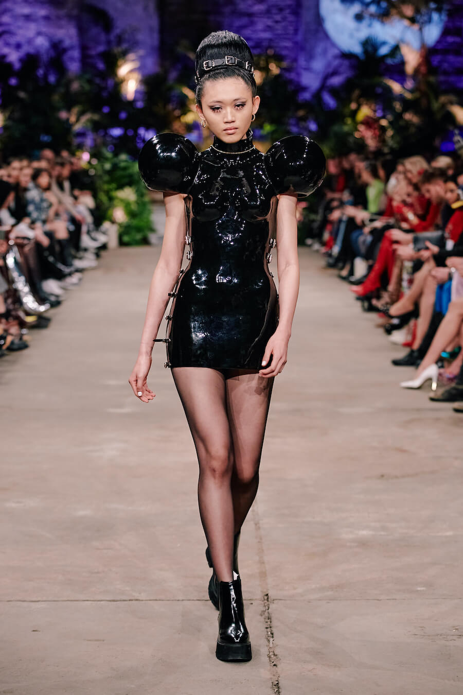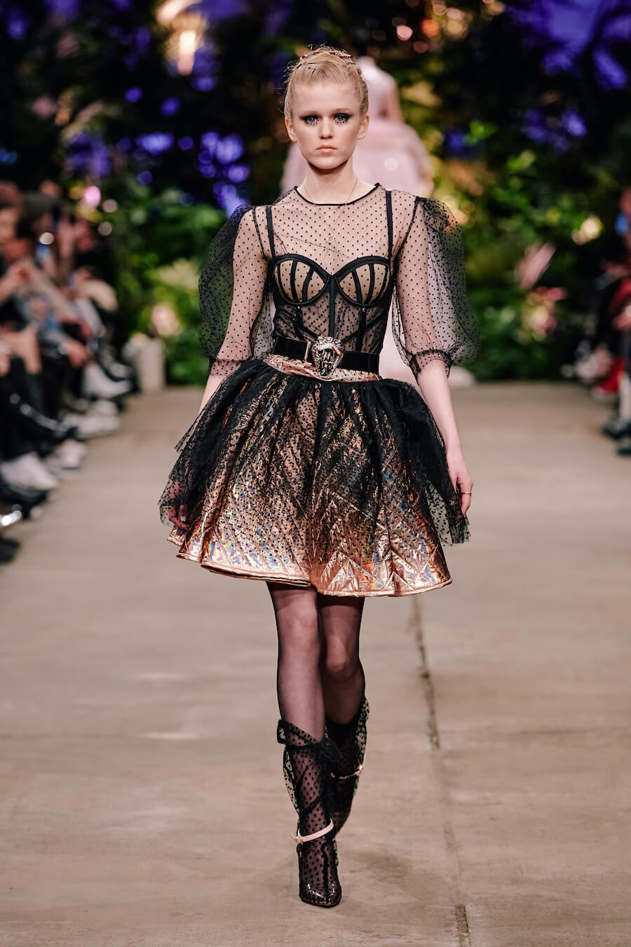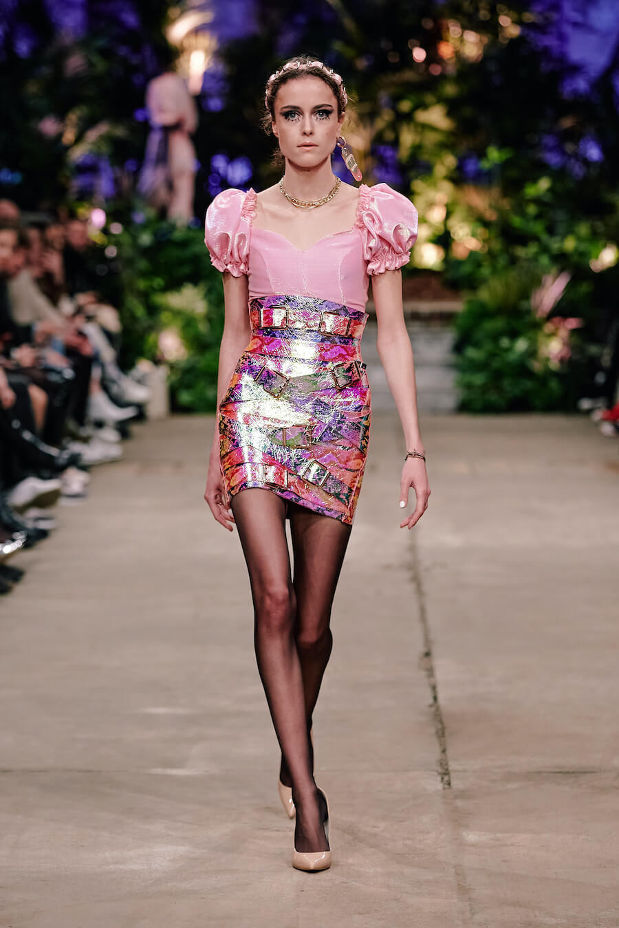 A dusky enchanted forest, governed by a queen in a sweeping, detailed baroque gown, is illuminated by the moon and the radiance of a dazzling creature from a faraway world clad in a glittering Swarovski dress. Their interplay of handcrafted leather flowers and flowing, undulating fabrics feels both mystical and strangely familiar. Puffy tulle with polka dots and tiny pink hearts accentuates a collection that exudes a soothing sense of gentleness. Hoermanseder’s love of 80s and 90s fashion, already apparent in previous collections, is unleashed in clear stylistic references to both of these decades. www.marinahoermanseder.com