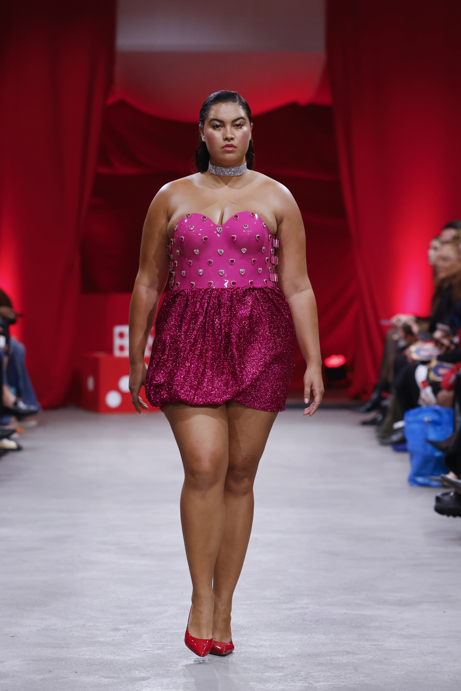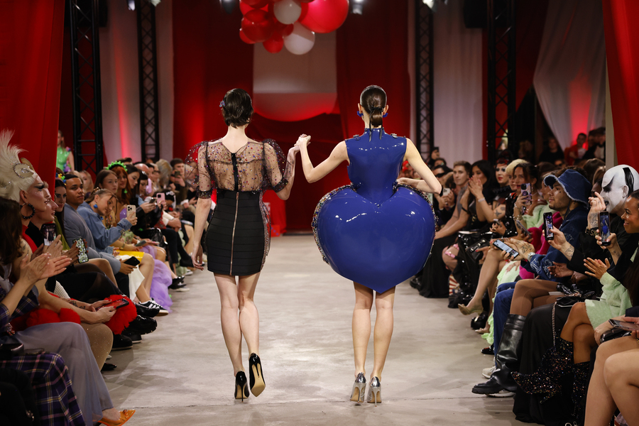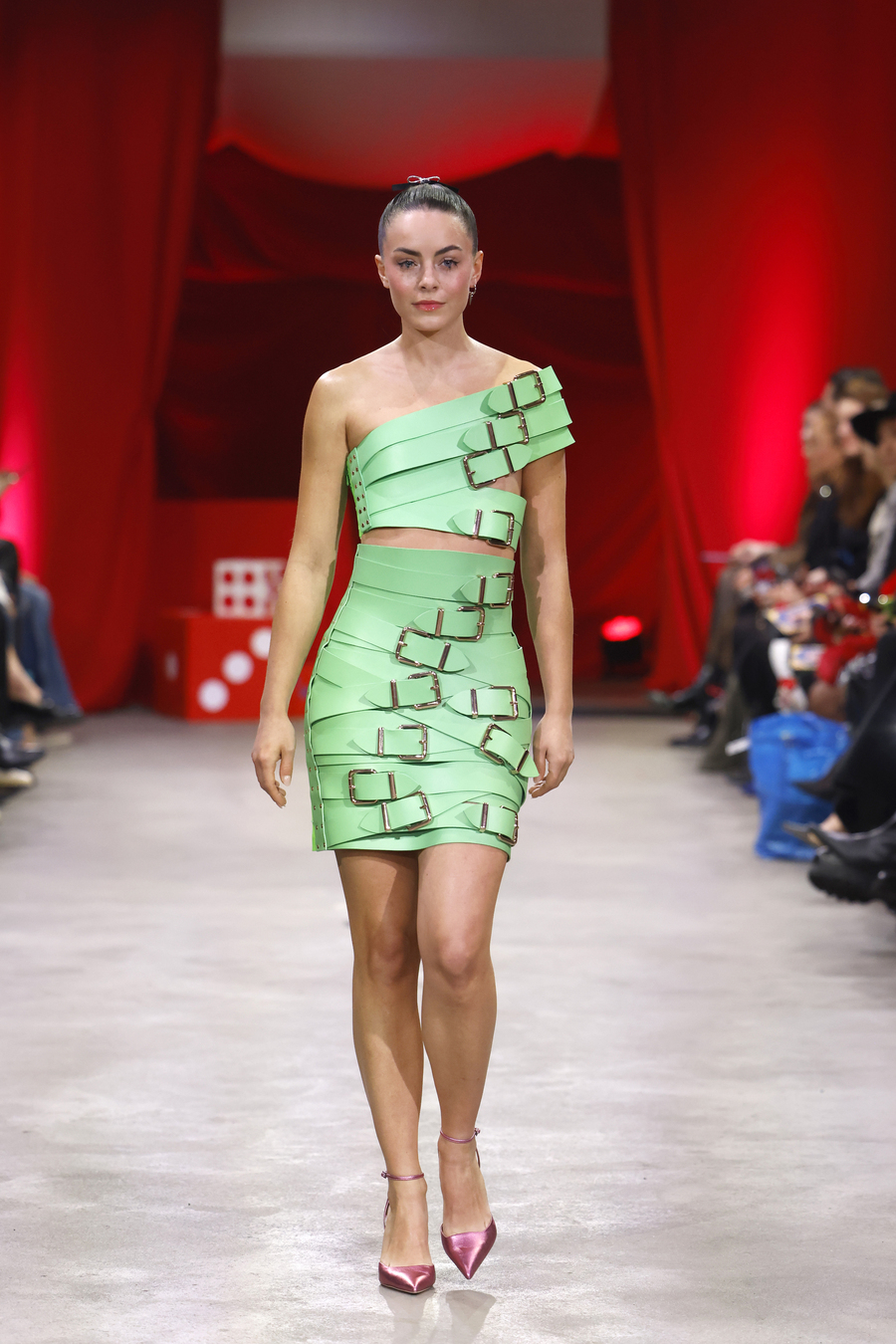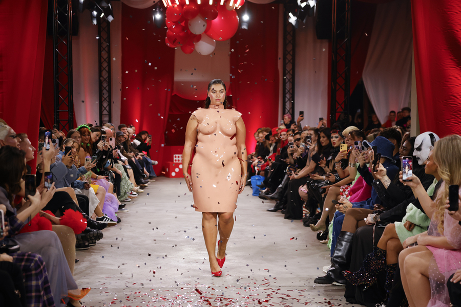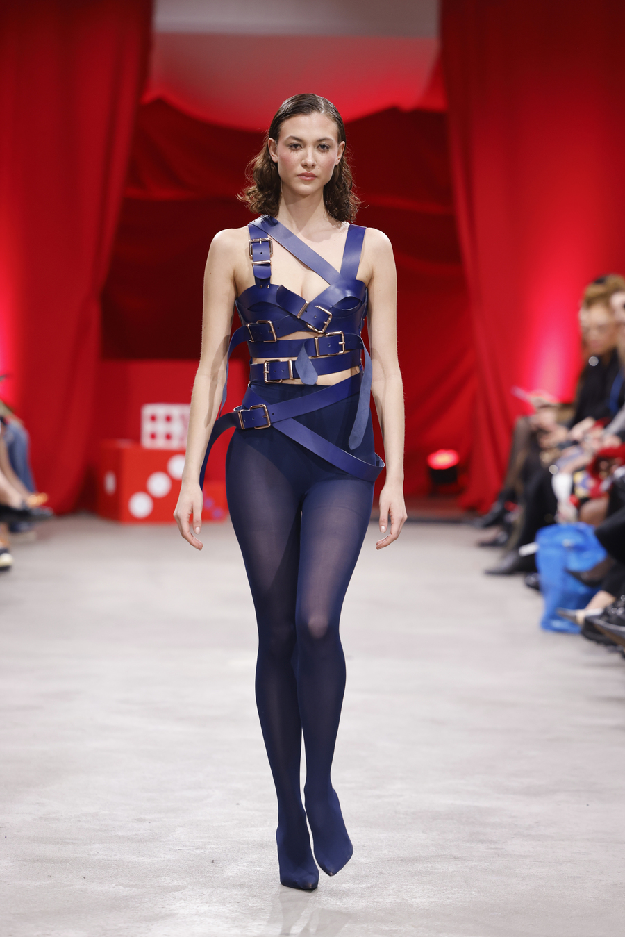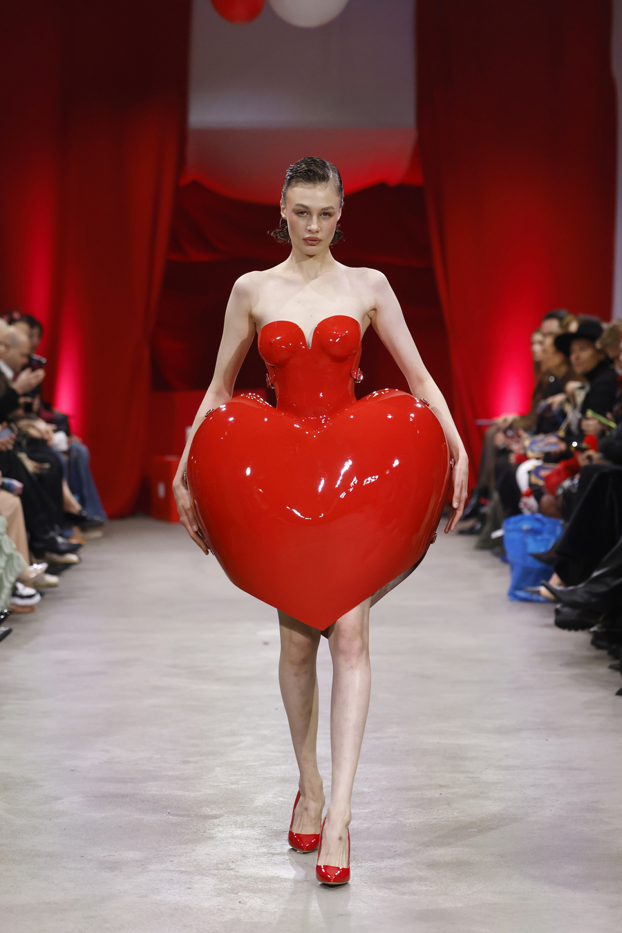 A surreal, heart-shaped vase emerges as a centrepiece in Marina Hoermanseder’s collection. The precisely handcrafted, colossal dress impresses with its extraordinary shape and gleaming surface. An additional standout piece is the leather “Venus Vase,” drawing inspiration from the Austrian archaeological marvel—the iconic Venus of Willendorf—a figurine that symbolizes size inclusion and prompts a reevaluation of pervasive beauty standards.