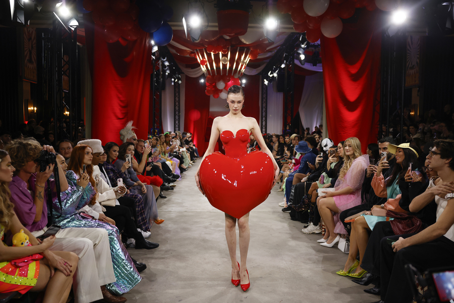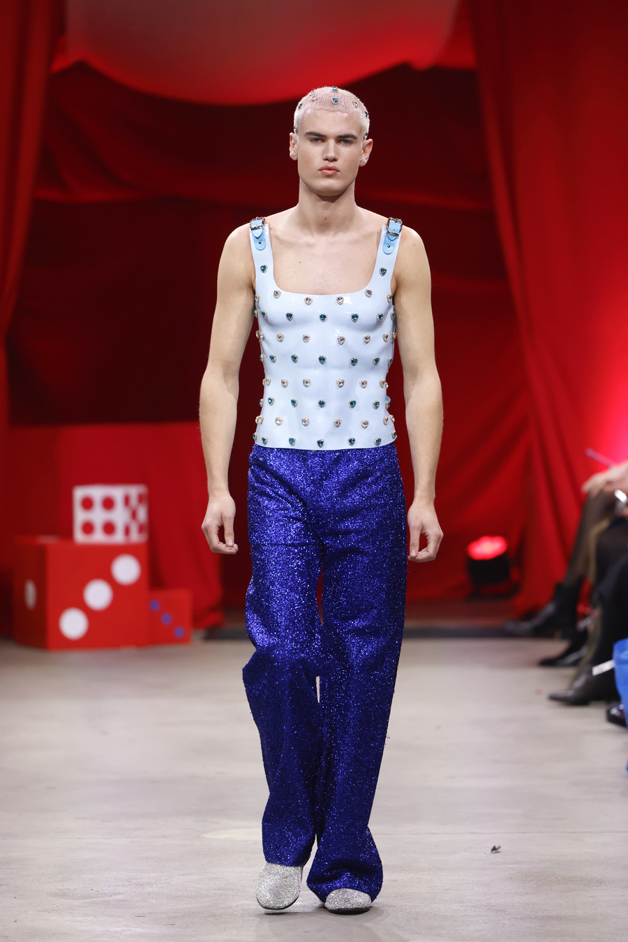 For the first time, Marina Hoermanseder ventures into sculptural and handcrafted menswear. She challenges the stereotypical societal images with oversized hearts and pink bows, artfully merging traditionally feminine and masculine elements, thus creating a space beyond gender-specific norms. Plush, tulle, and glitter seamlessly merge with “Care Bears” (collaboration partners), faux fur, velvet, and printed fabrics, crafting a narrative that transcends fashion conventions. In captivating shapes and with meticulous attention to detail, the collection showcases more buckles and more leather than ever before, faithfully adhering to the signature of her label.