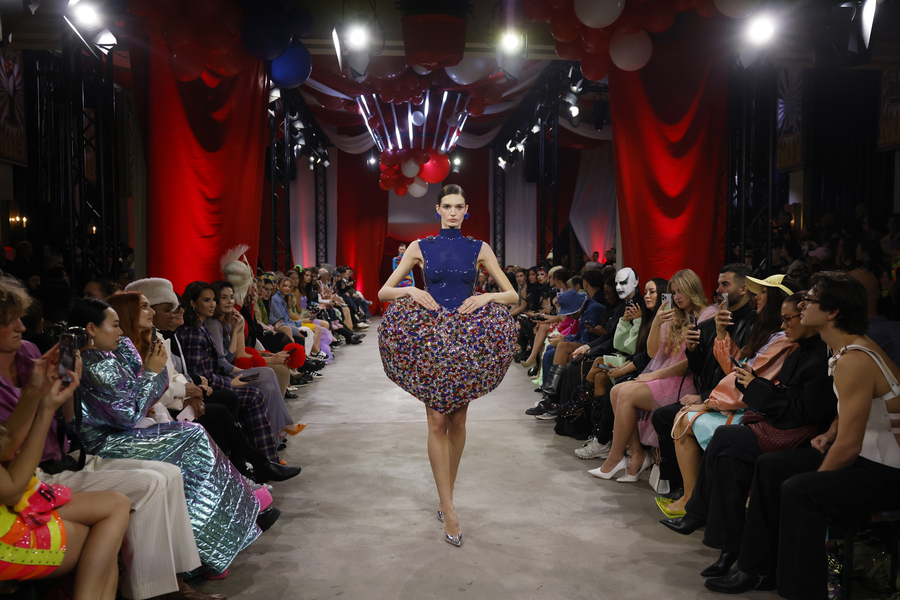 Marina Hoermanseder’s AW 24/25 collection heralds a spectacular return, catapulting the runway into an immersive fashion spectacle. Following a four-year hiatus, the designer unveils a new collection from her couture label that reflects on years marred by constraints and societal shifts, all teetering on the brink of a monochromatic abyss. Hoermanseder has nestled upon the notion that rediscovering our childlike roots could lead us to genuine emotion and joy—and from this epiphany, an emotional circus is born, touching every feeling from euphoria to melancholy.