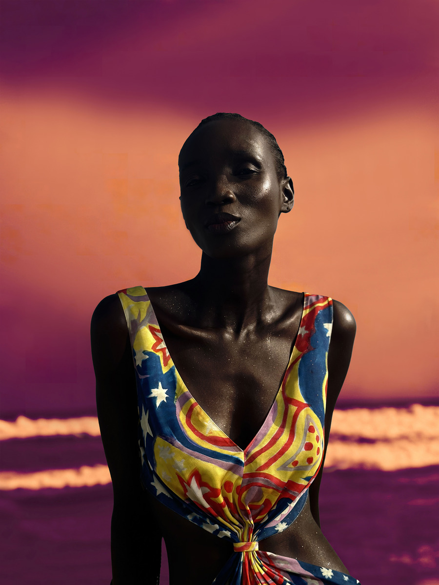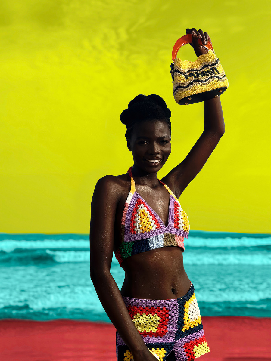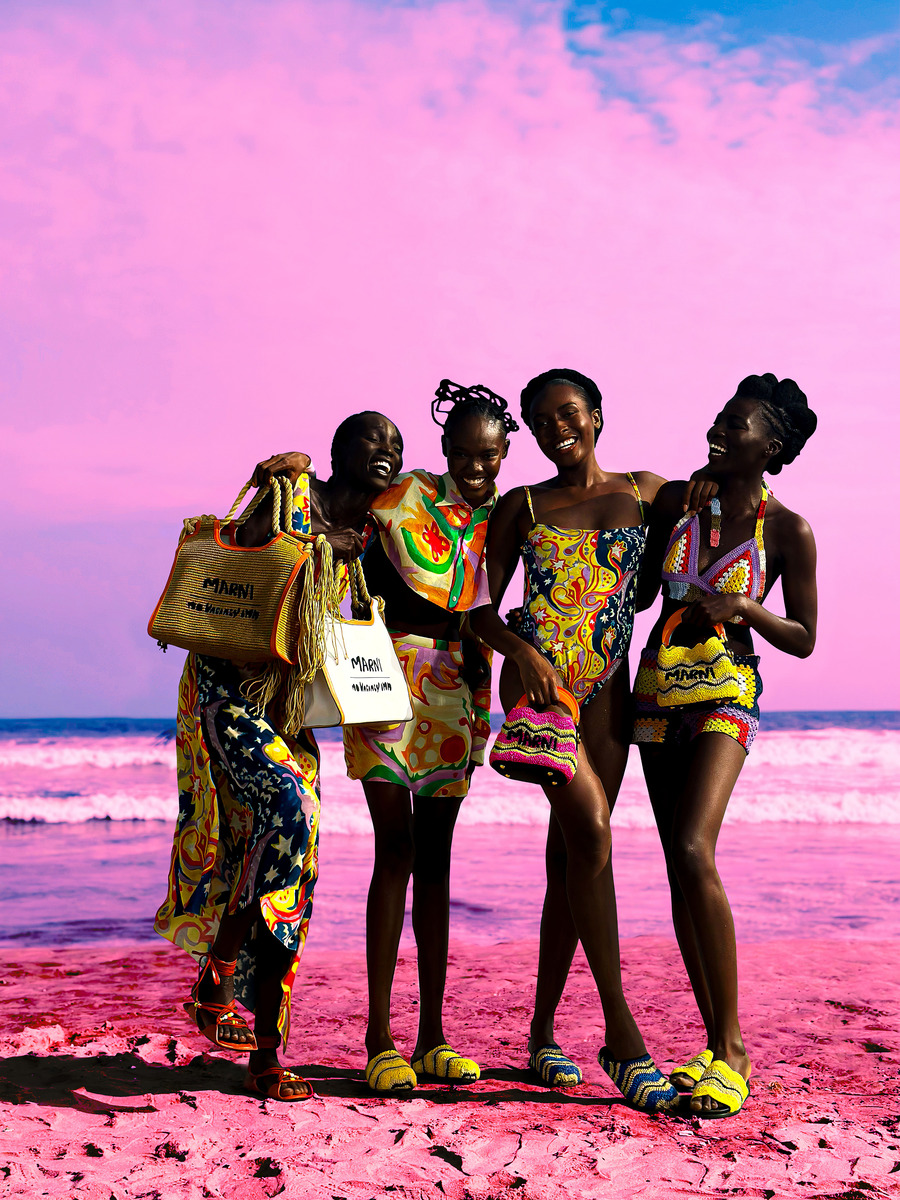The MARNI x NO VACANCY INN campaign was captured through the lens of Ghanaian artist Derrick Ofosu Boateng, who has portrayed the collection against the sands of Accra, bursting with saturated colours. Boateng’s signature hues offer an original point of view through a series of visuals inspired by Ghanaian proverbs, interpreted here with a witty gaze.