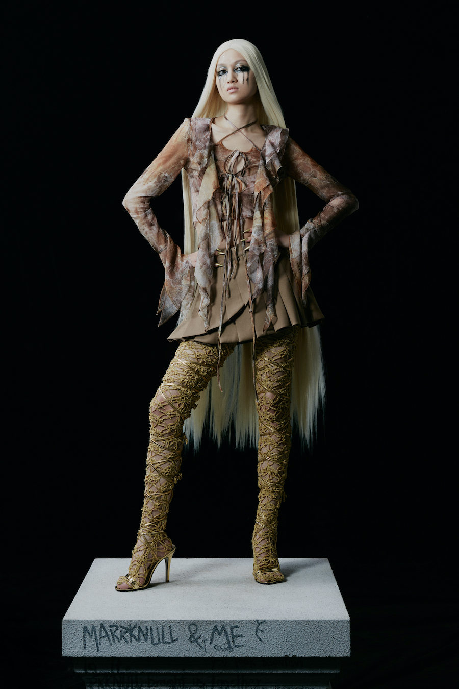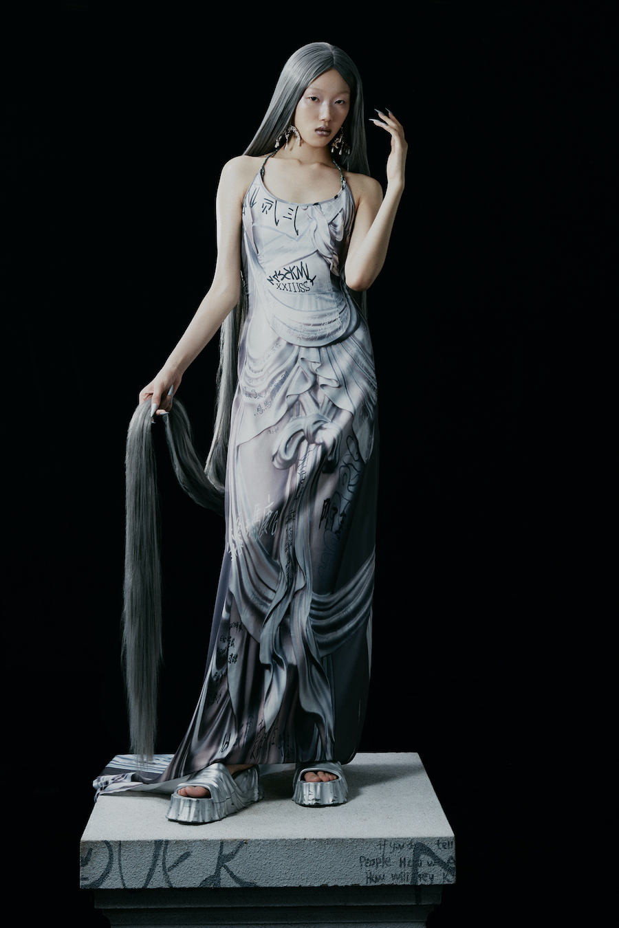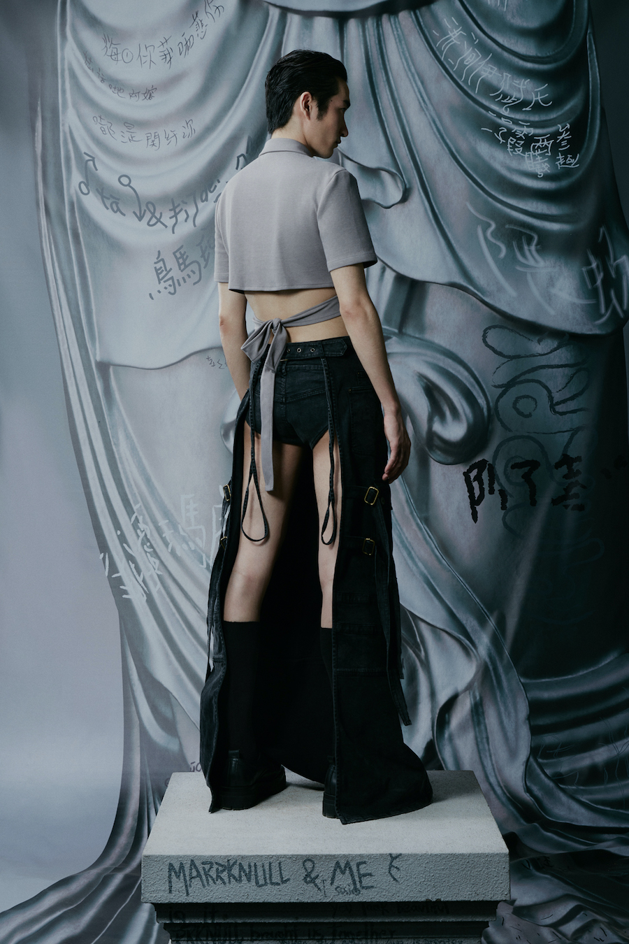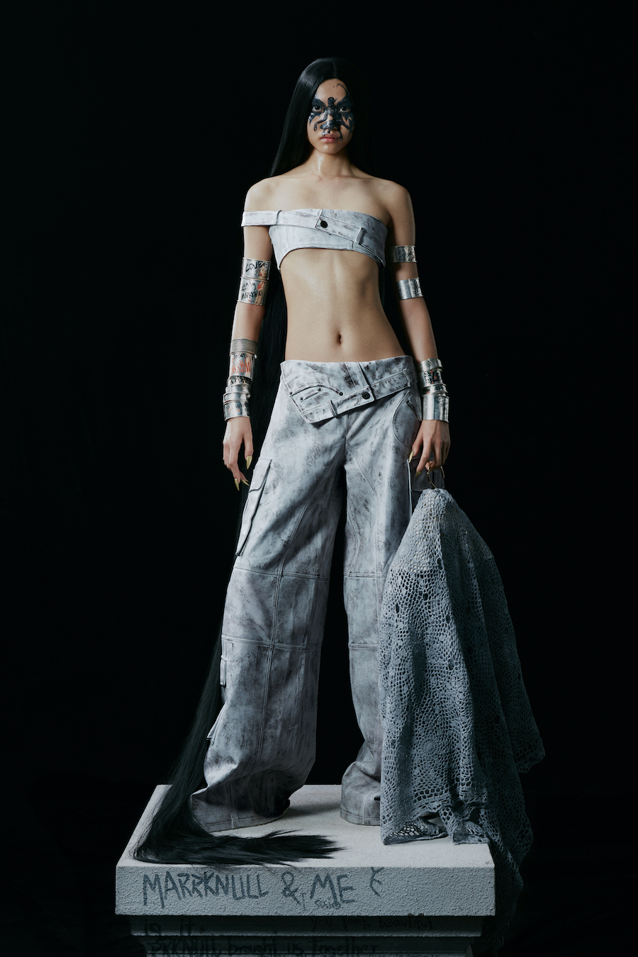 MARRKNULL has unveiled its new collection S/S23 STATUE in the official schedule of London Fashion Week. The designer explores the relationship between god statues and people. Through new techniques and design, such as 3D, polished and aged leather, shoes that look like sculpted stones, prints and drapery that recreate sculptures, the designer shows models as divine statues standing on concrete podiums with graffiti.