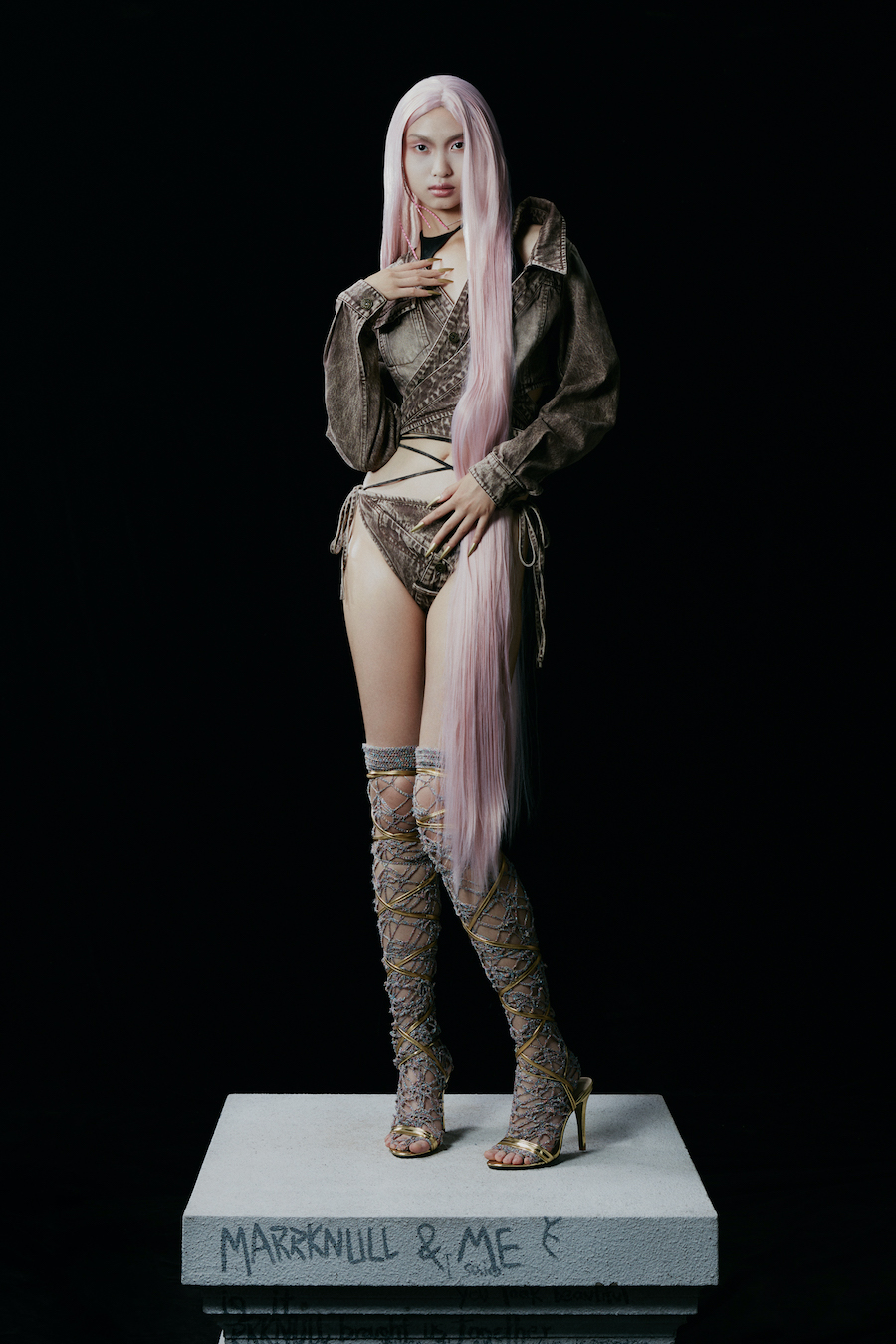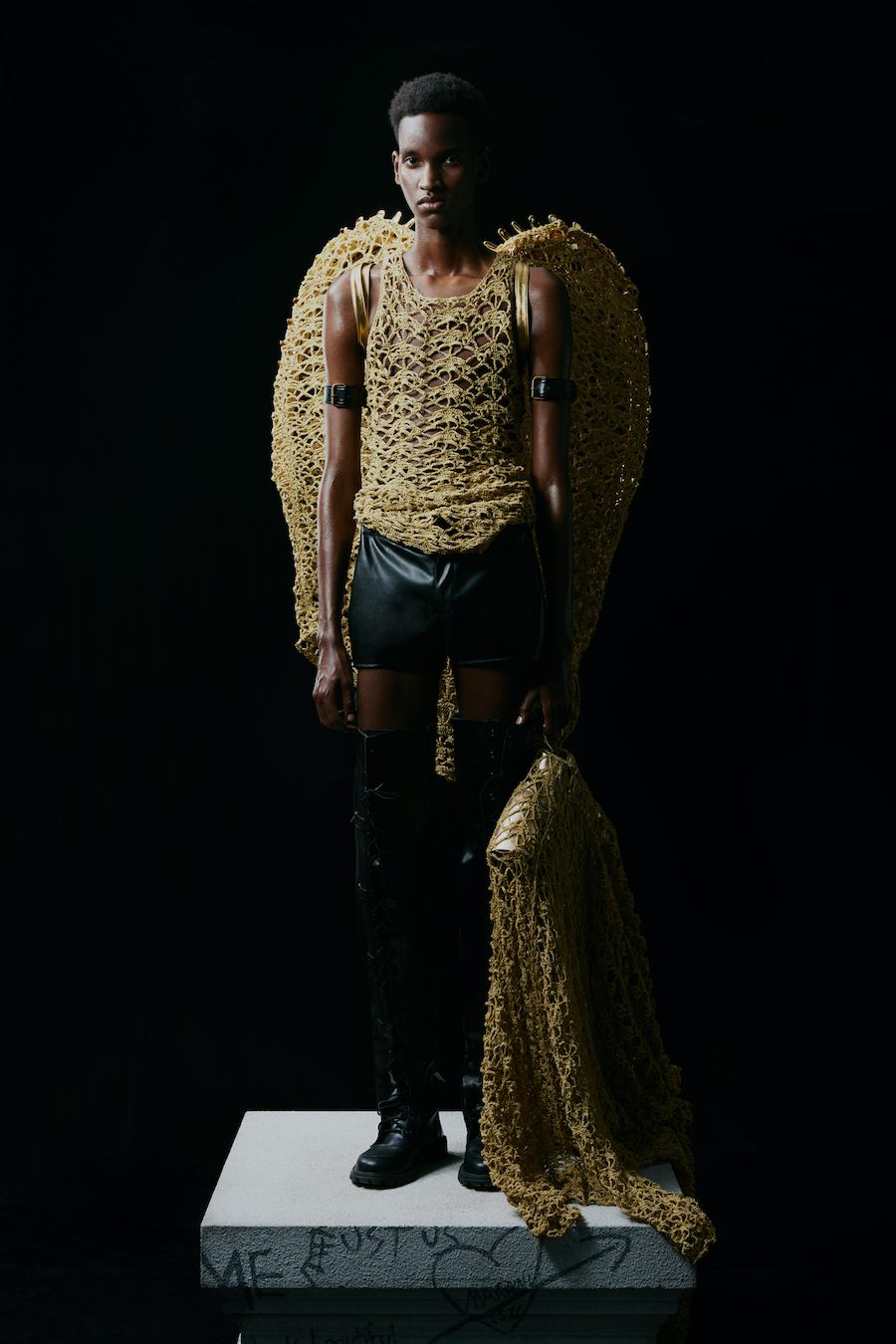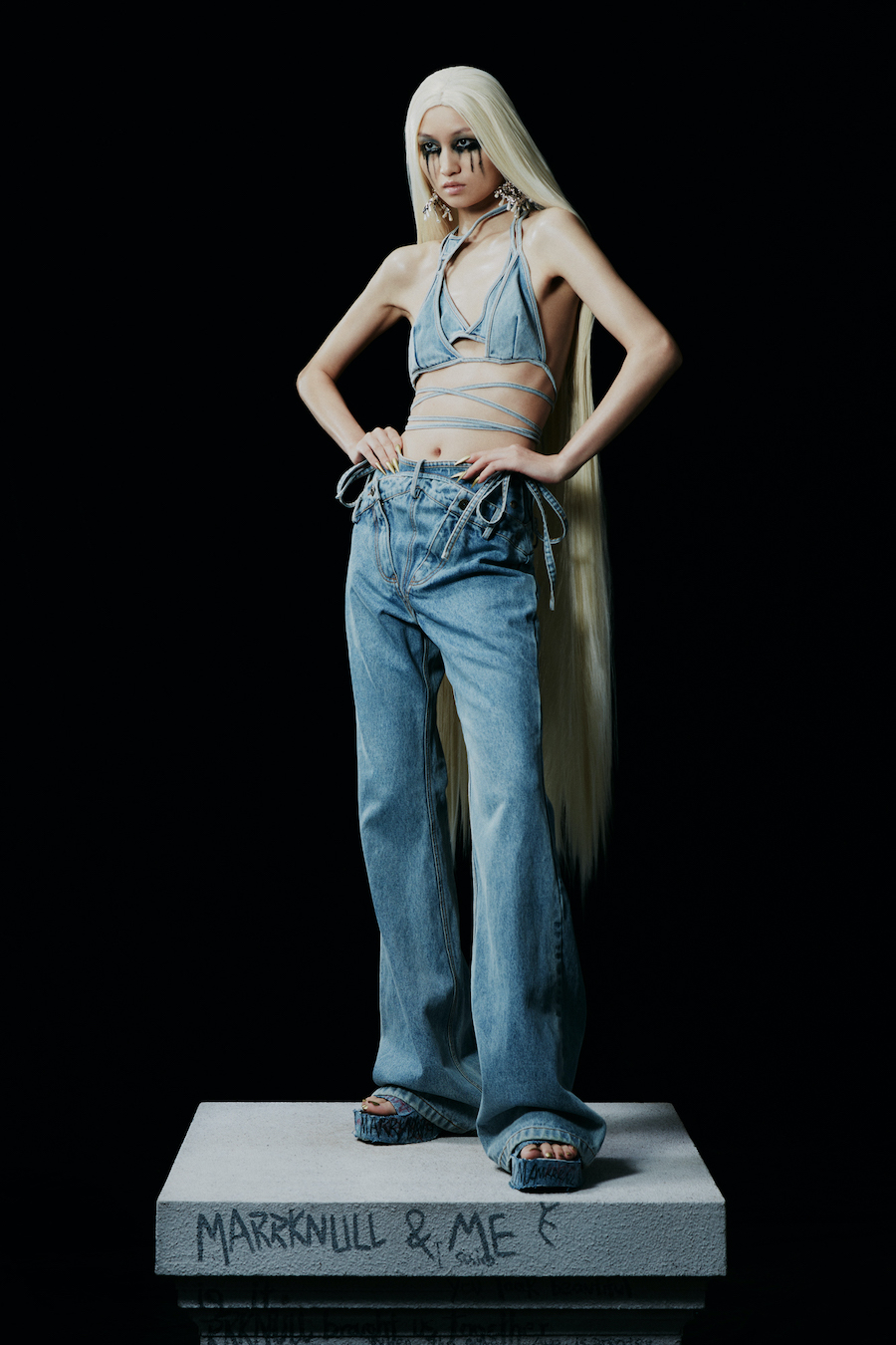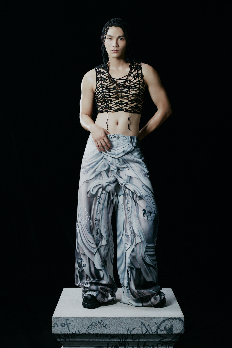 MARRKNULL has unveiled its new collection S/S23 STATUE in the official schedule of London Fashion Week. The designer explores the relationship between god statues and people. Through new techniques and design, such as 3D, polished and aged leather, shoes that look like sculpted stones, prints and drapery that recreate sculptures, the designer shows models as divine statues standing on concrete podiums with graffiti.
