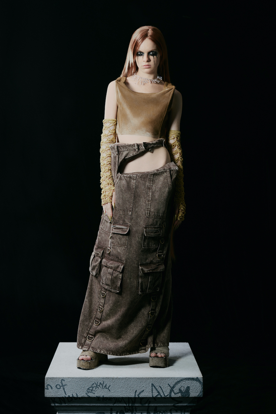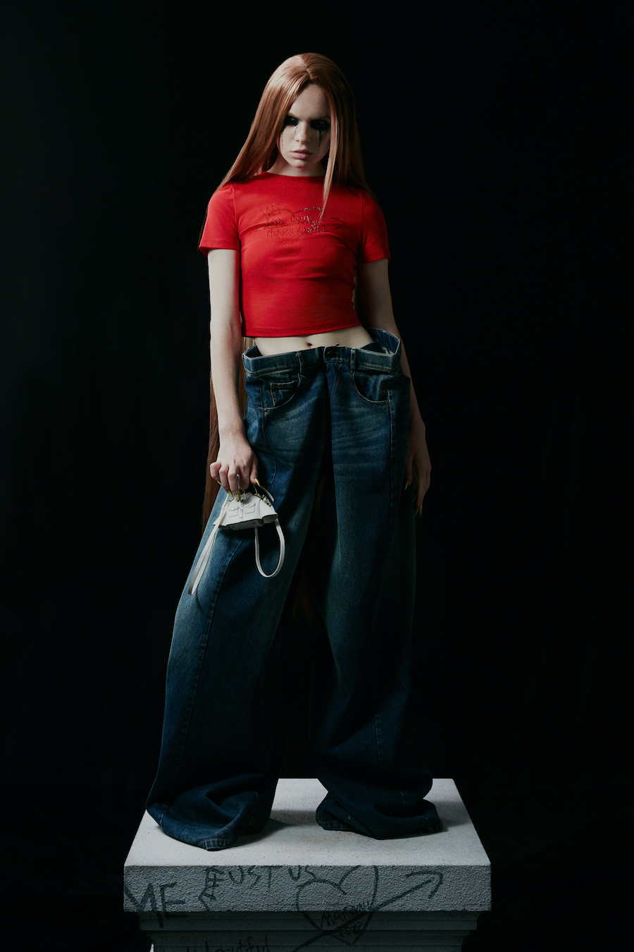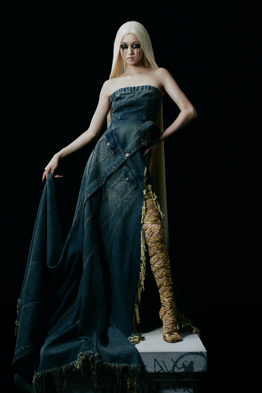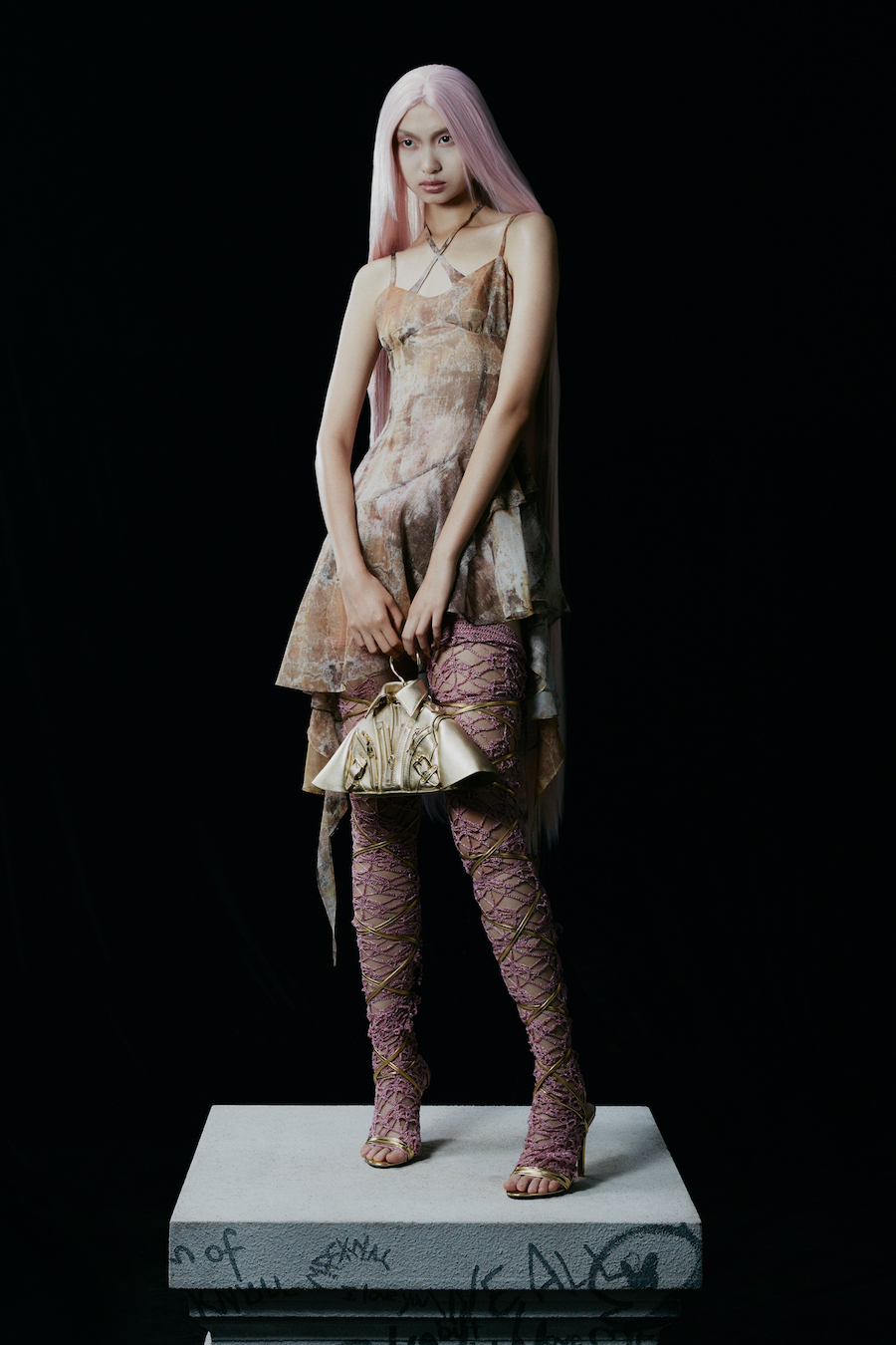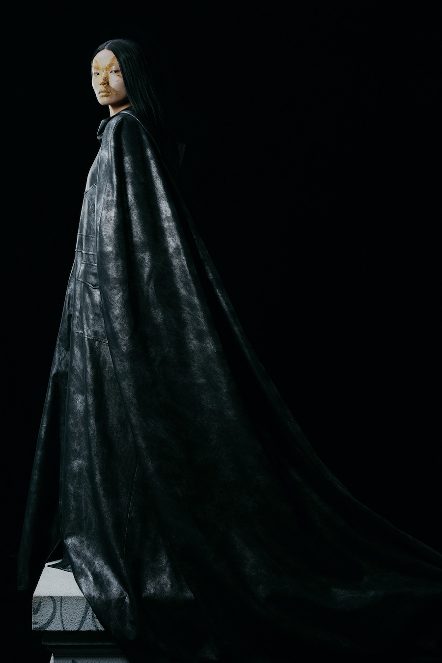 MARRKNULL has unveiled its new collection S/S23 STATUE in the official schedule of London Fashion Week. The designer explores the relationship between god statues and people. Through new techniques and design, such as 3D, polished and aged leather, shoes that look like sculpted stones, prints and drapery that recreate sculptures, the designer shows models as divine statues standing on concrete podiums with graffiti.
