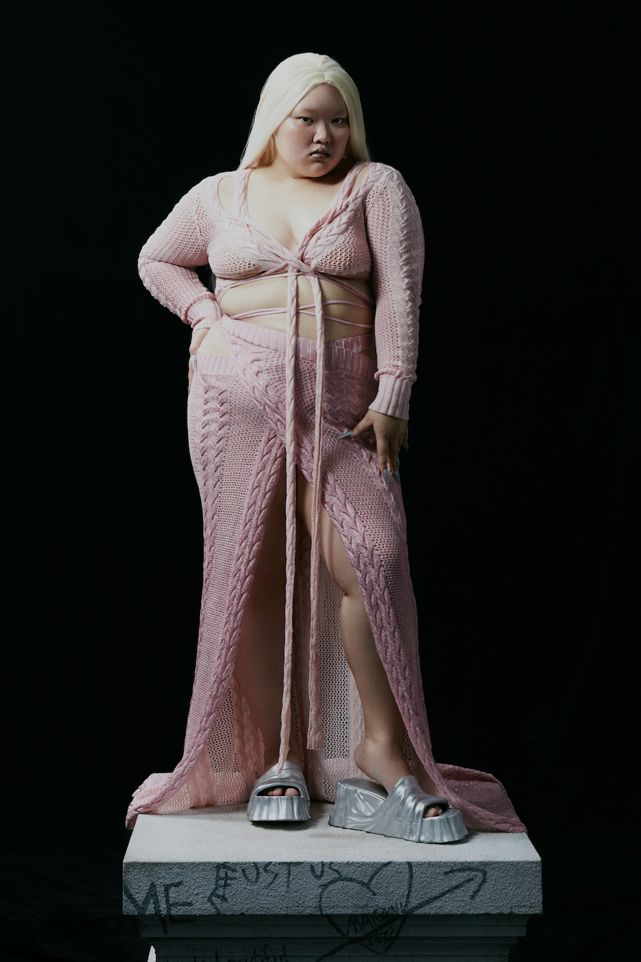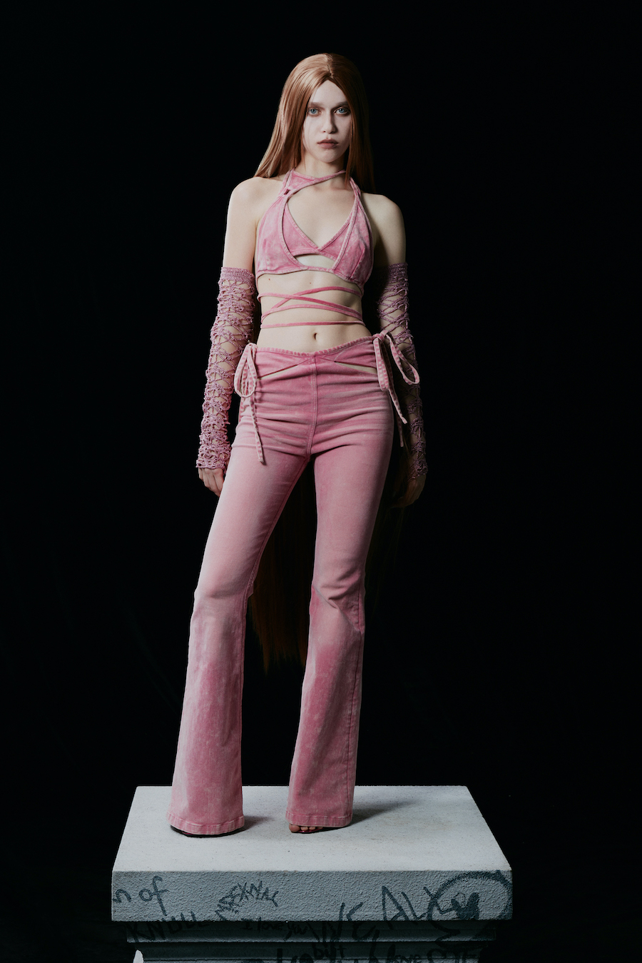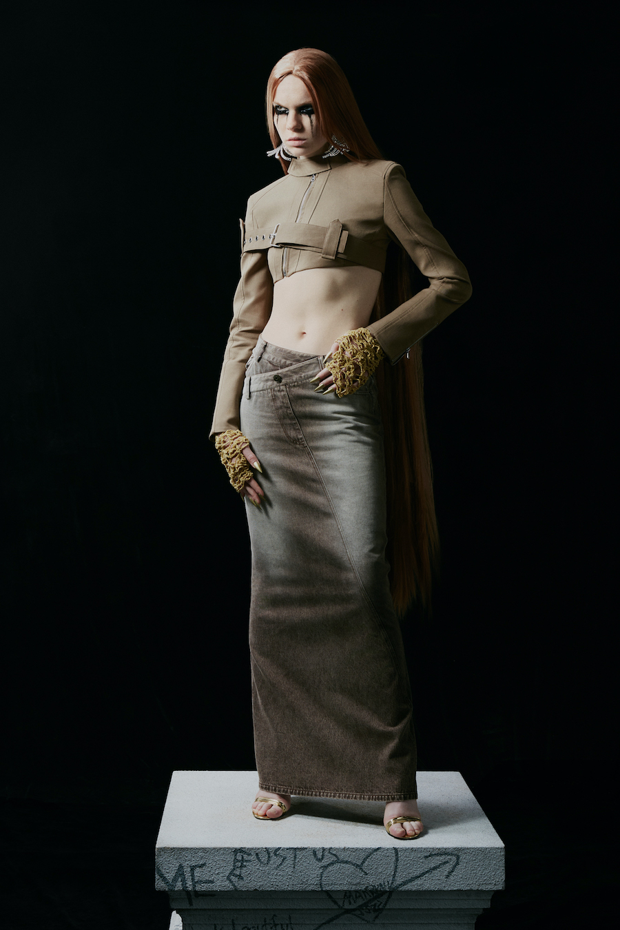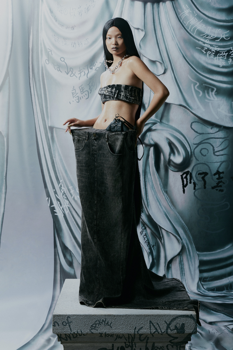 MARRKNULL has unveiled its new collection S/S23 STATUE in the official schedule of London Fashion Week. The designer explores the relationship between god statues and people. Through new techniques and design, such as 3D, polished and aged leather, shoes that look like sculpted stones, prints and drapery that recreate sculptures, the designer shows models as divine statues standing on concrete podiums with graffiti.