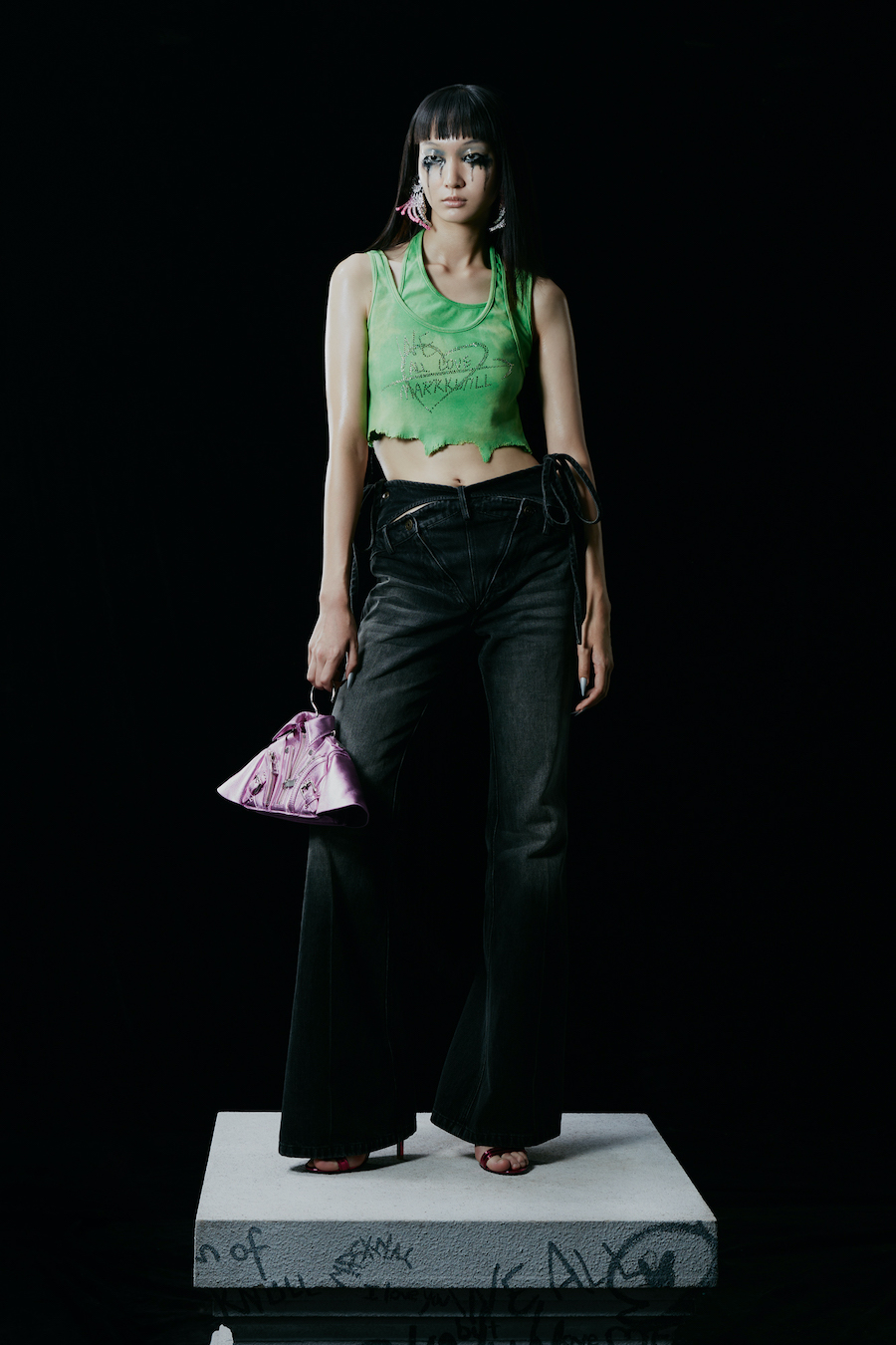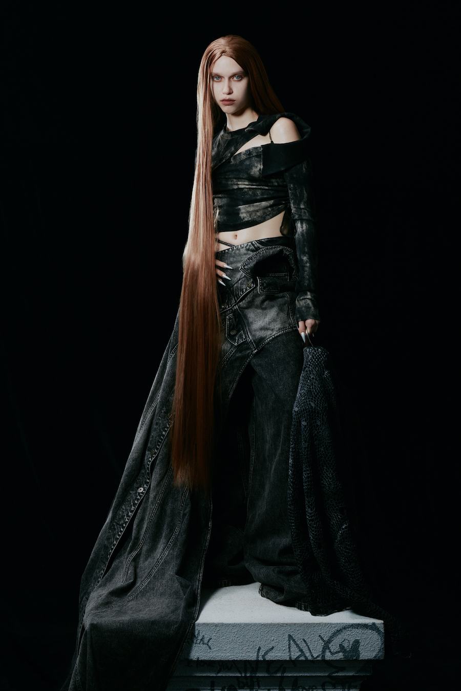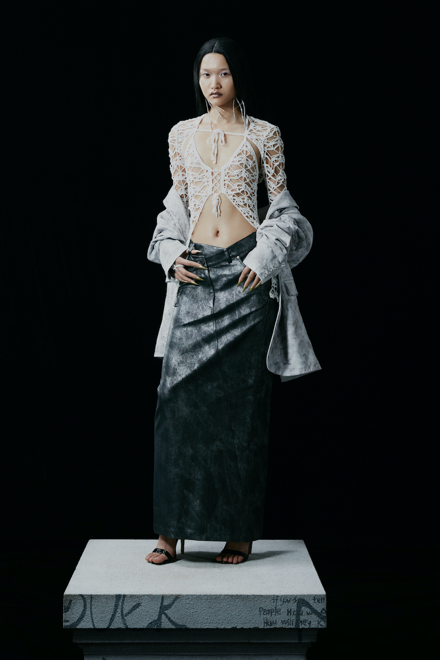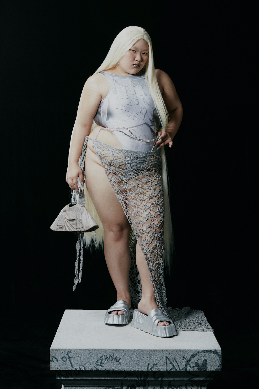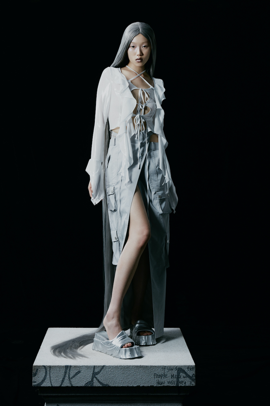 The collection also shows the collaboration with GRAPE for architectural shoes and YVMIN for jewellery.