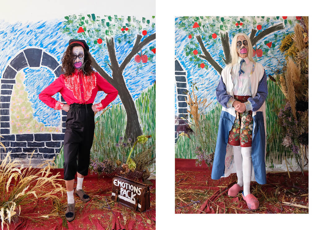 Constructed mostly out of vintage fabrics collected over the years, which have been hand dyed, painted or embroidered by M Silva, the collection’s ecological footprint has been kept to a bare minimum. The prints are, in true Fábio M Silva fashion, a mixture of folklore elements and pop iconography, including an inverted chicken, Britney Spears and a transgender reinterpretation of the paleolithic sculpture ‘Venus of Willendorf’.