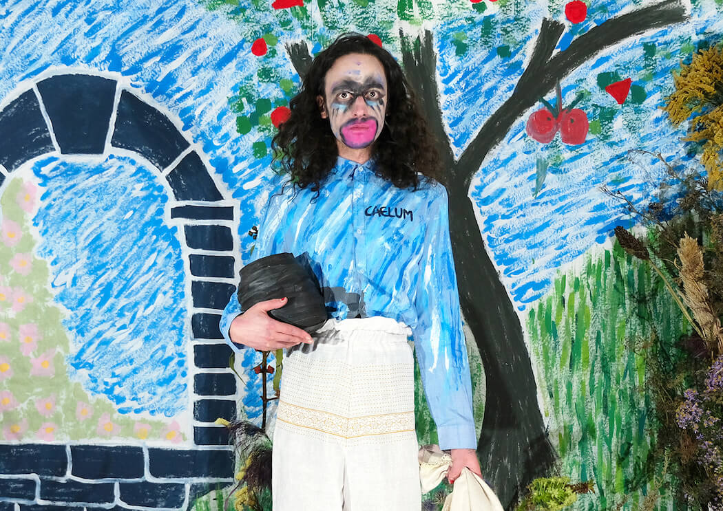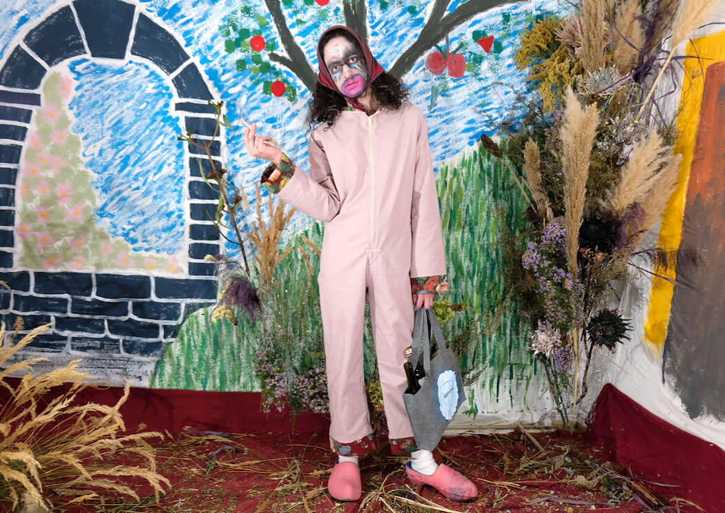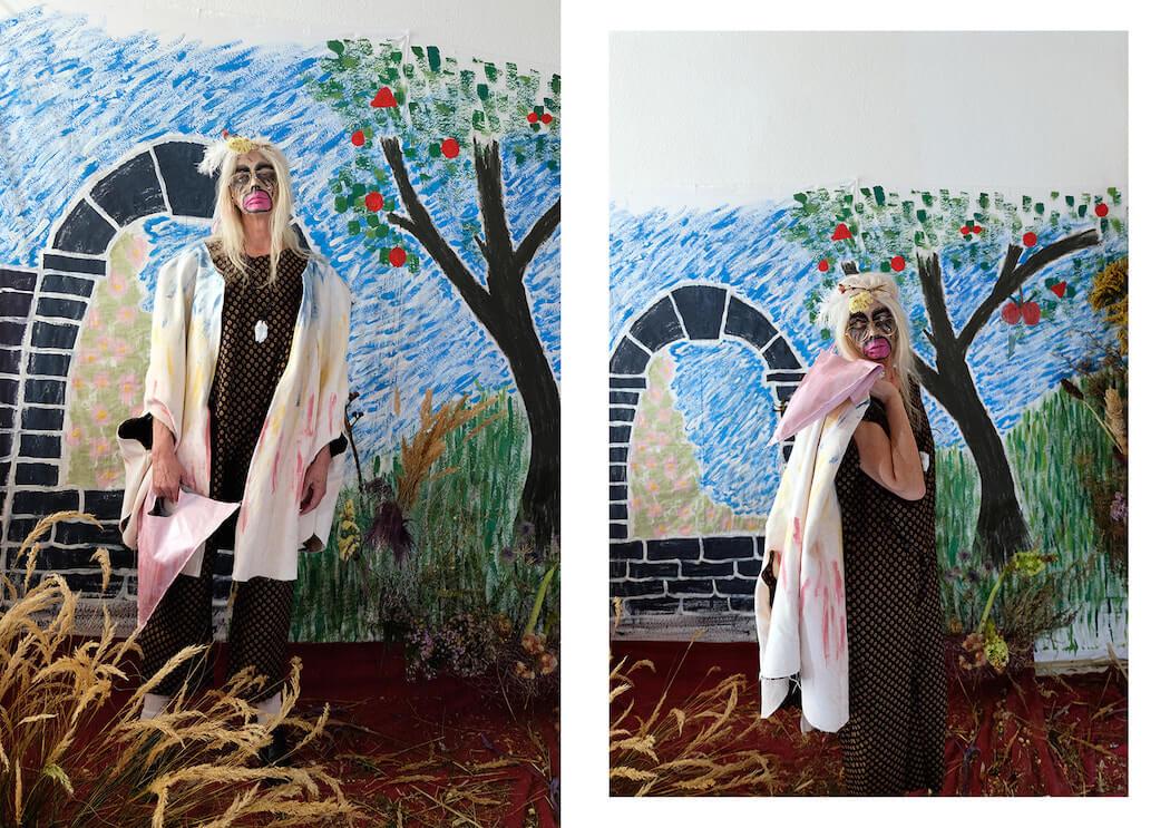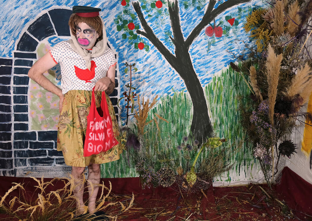 Constructed mostly out of vintage fabrics collected over the years, which have been hand dyed, painted or embroidered by M Silva, the collection’s ecological footprint has been kept to a bare minimum. The prints are, in true Fábio M Silva fashion, a mixture of folklore elements and pop iconography, including an inverted chicken, Britney Spears and a transgender reinterpretation of the paleolithic sculpture ‘Venus of Willendorf’.