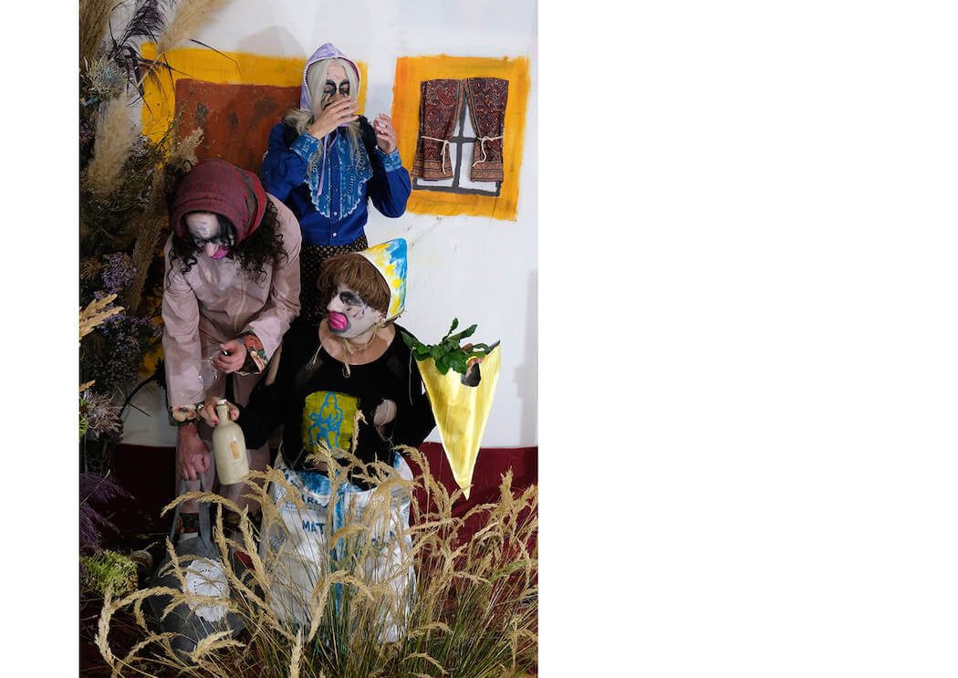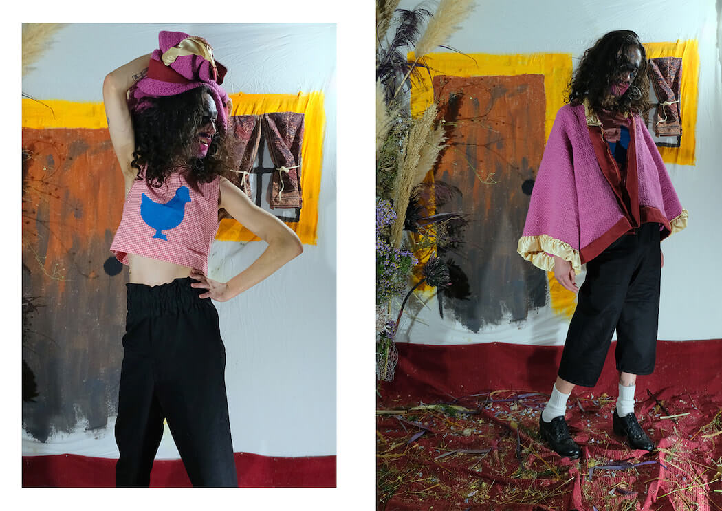 I was painting over a scarf that used to belong to my great grandmother and got really into the idea of how it was no longer a dated and traditionally feminine item and how it became a totally contemporary genderless piece. This led me to look at old family photos and archival footage of costumes from different regions in Portugal and by reinterpreting their patterns, prints and functionality, Matriarka was born