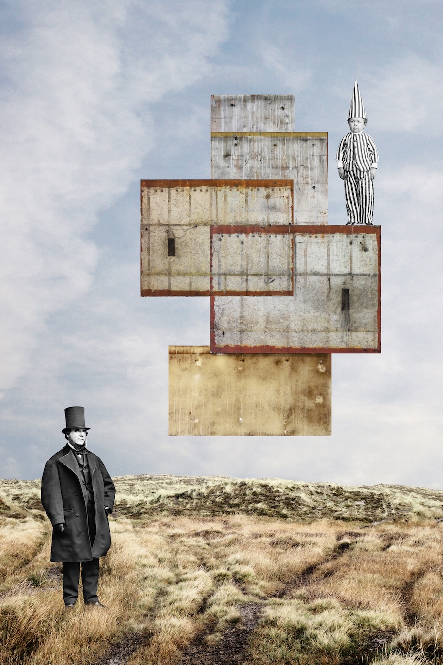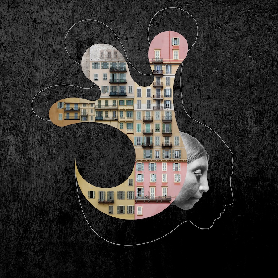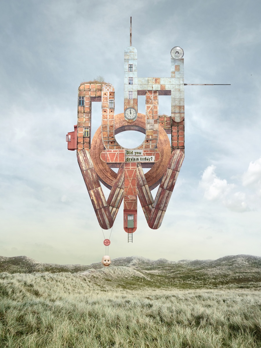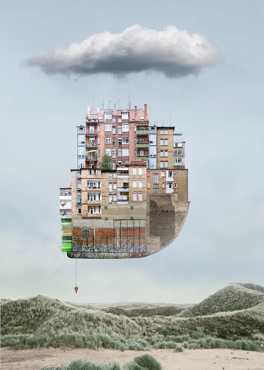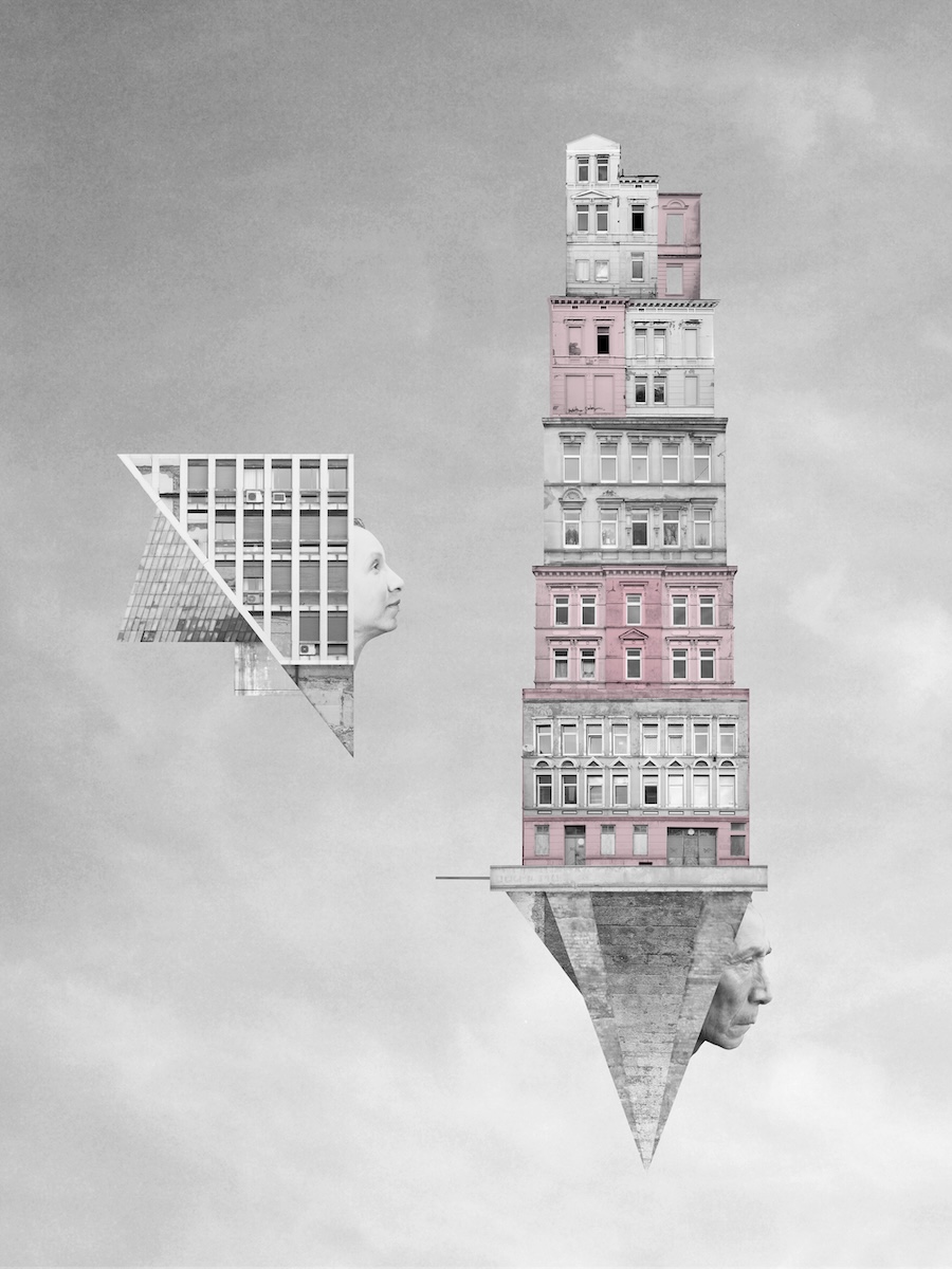 “I like contrasts – rough and delicate, industrial and natural. I actually design dream worlds, visualisations of our inner world. The combination of individual elements follows a logic that is inherent in dreams. Dreams are basically collages, too. I don‘t have any actual stories as a basis, but the tension between the elements creates a narrative level. However, this story is completely open; everyone can tell it for themselves. I love designing with architecture. We associate architectural elements with emotional connotations. A concrete surface can appear brutal, forbidding, or even magnificent. A half-timbered house is more cosy or touching. Sometimes I combine architectural elements with photographs of people. I use historical images that are in the public domain. I particularly love daguerreotypes, which often have an epic quality. For me, collages with people are portraits that incorporate the inner life, the unconscious.
