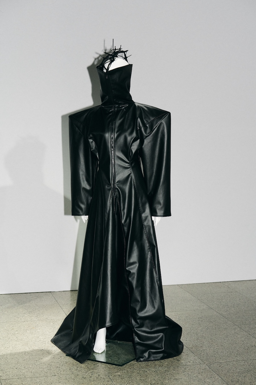 In Gedra’s world, power takes the form of dominating silhouettes. Highly armoured necklines envelop, while structured layers, padded volumes, and impeccable tailoring convert restraint into commanding control. This collection serves as a tapestry of tension, where materials, forms, and structures converge to create a striking statement.