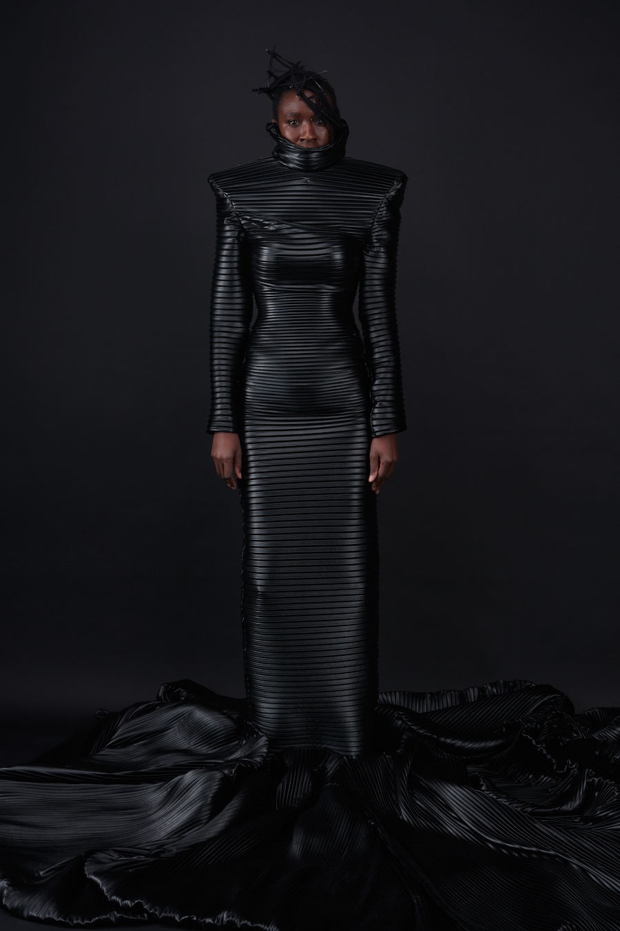 With architectural shoulders and dramatic forms, the collection radiates strength, confidence, and audacity, all while embedding sustainability into every stitch. Reflecting Berlin’s spirit of fashion freedom, Gedra unites opulent textures with timeless design, each piece a testament to the city’s unique aesthetic. Here, individuality is not just acknowledged; it is boldly celebrated, reverberating through every fearless, unapologetic, and visionary design. In the realm of MAXIMILIAN GEDRA, each piece is a powerful statement, a declaration of self.