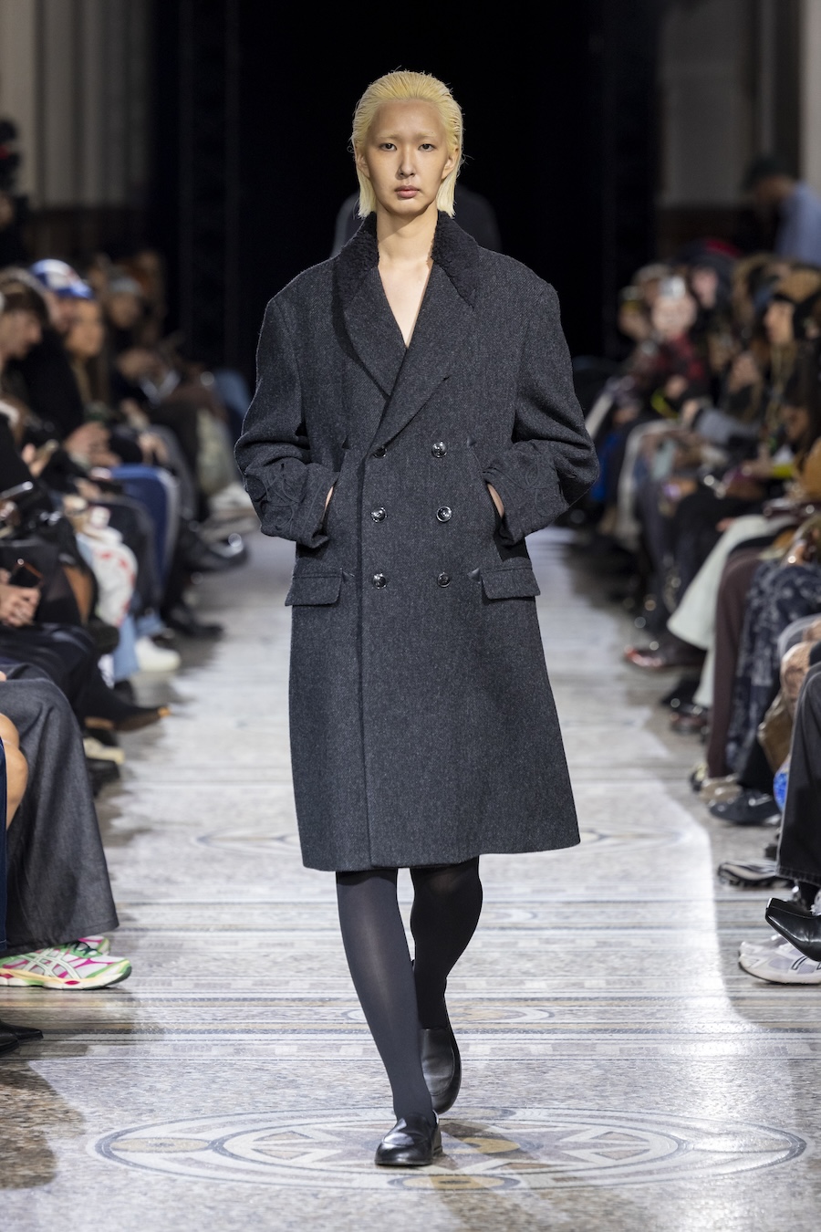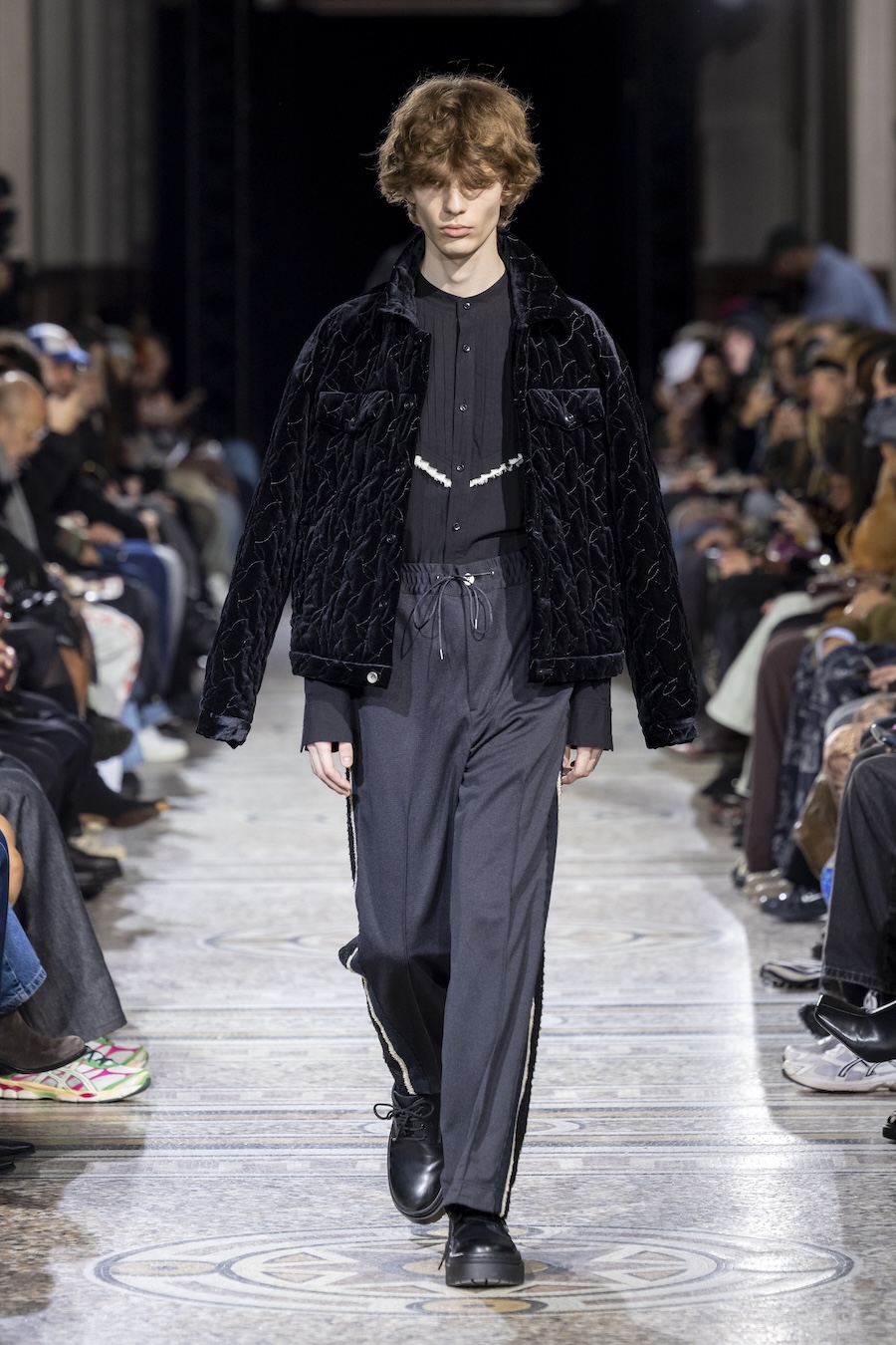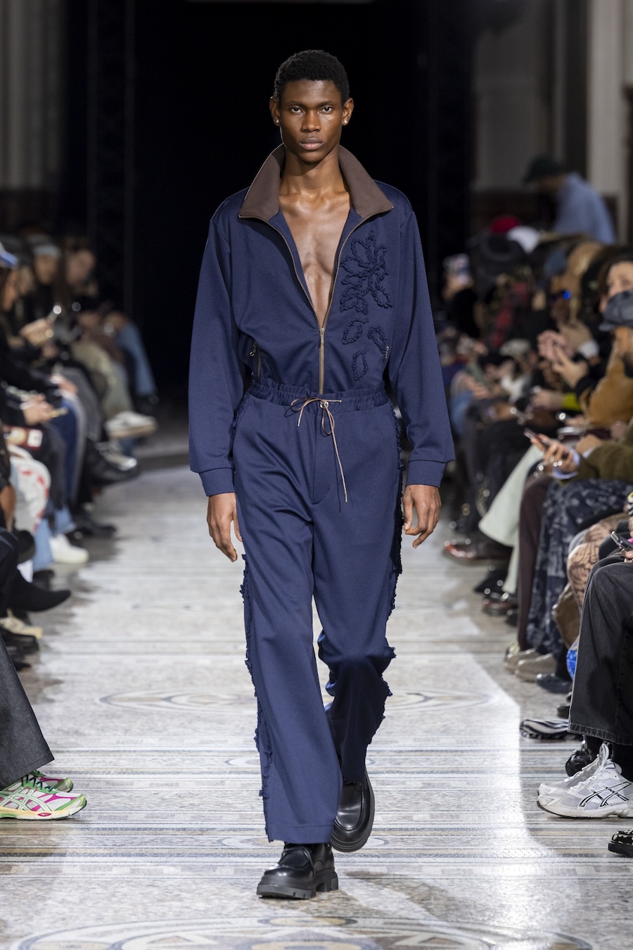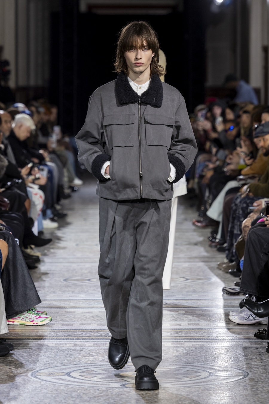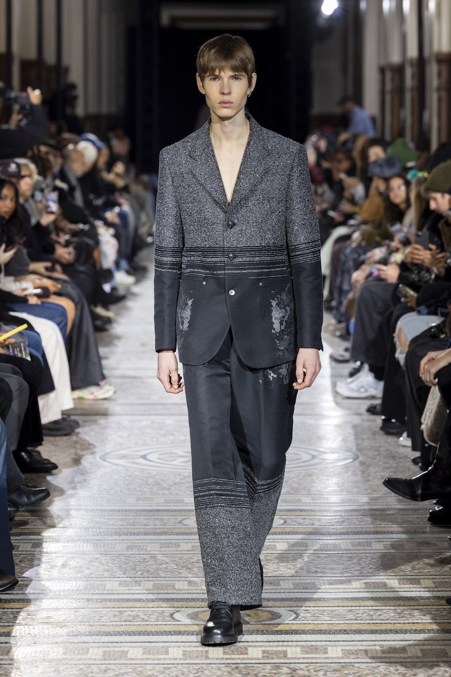 The FW26 collection offers an exploration of distinctive materials and exceptional techniques. Jackets and trousers are crafted in tama-ori silk, a traditional weaving method whose richness is accentuated through luxurious, refined finishes. The intricacies of the dyeing process reveal the nuances of artisanal craftsmanship, with textures that unfold gradually, creating subtle gradients within each garment.