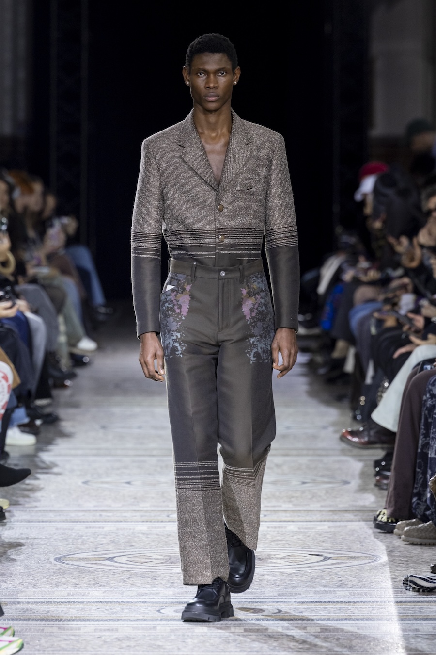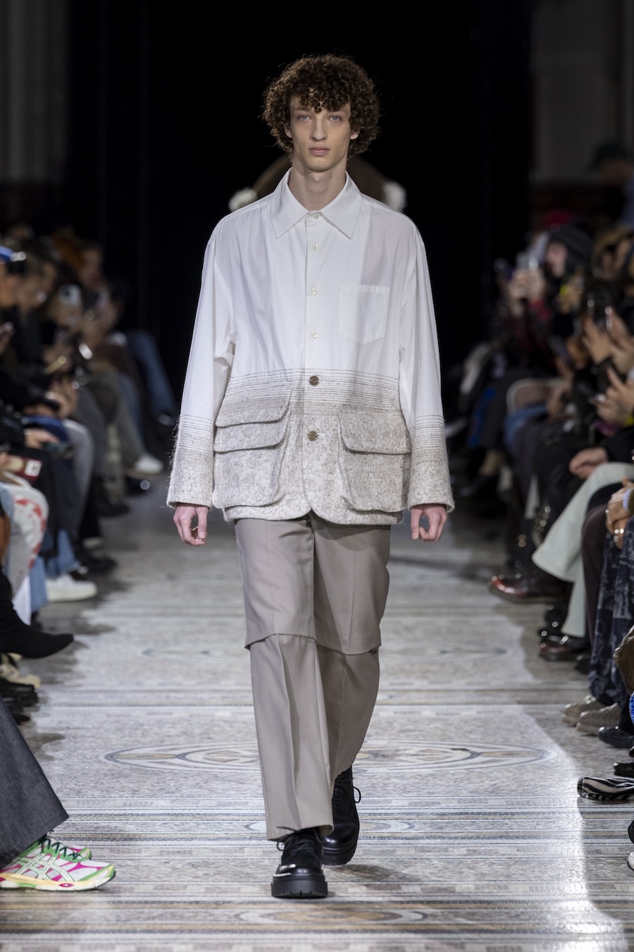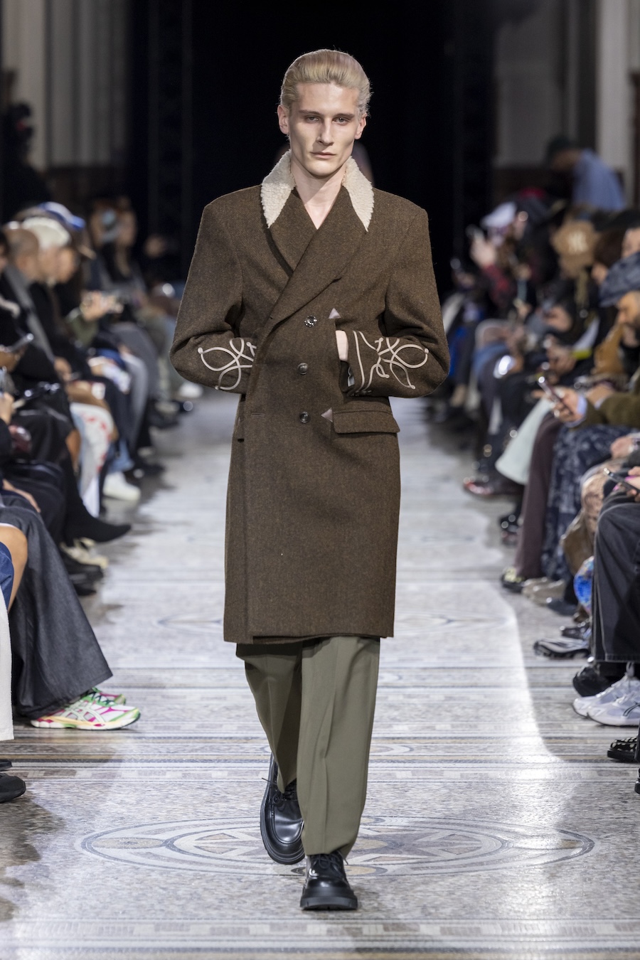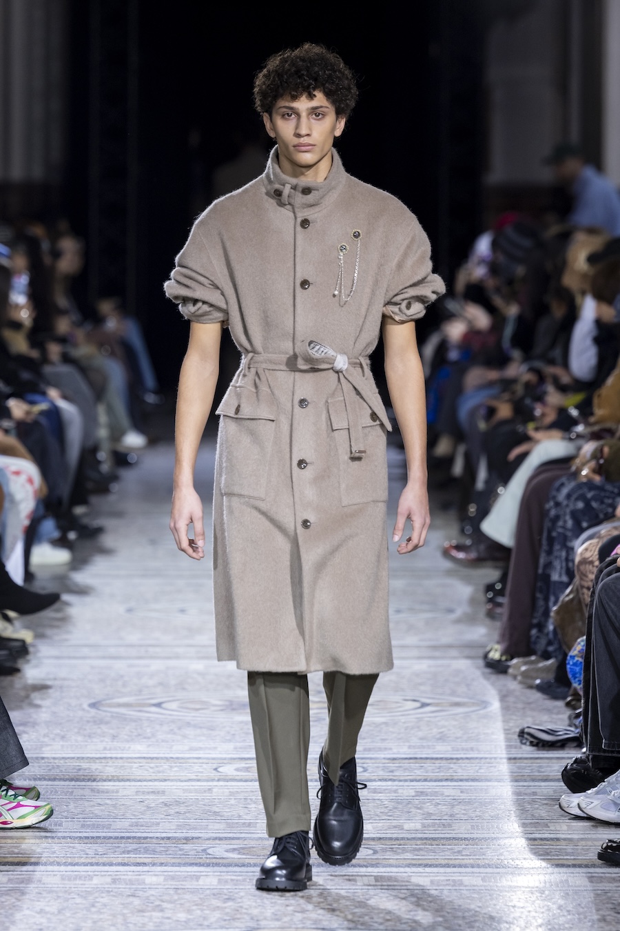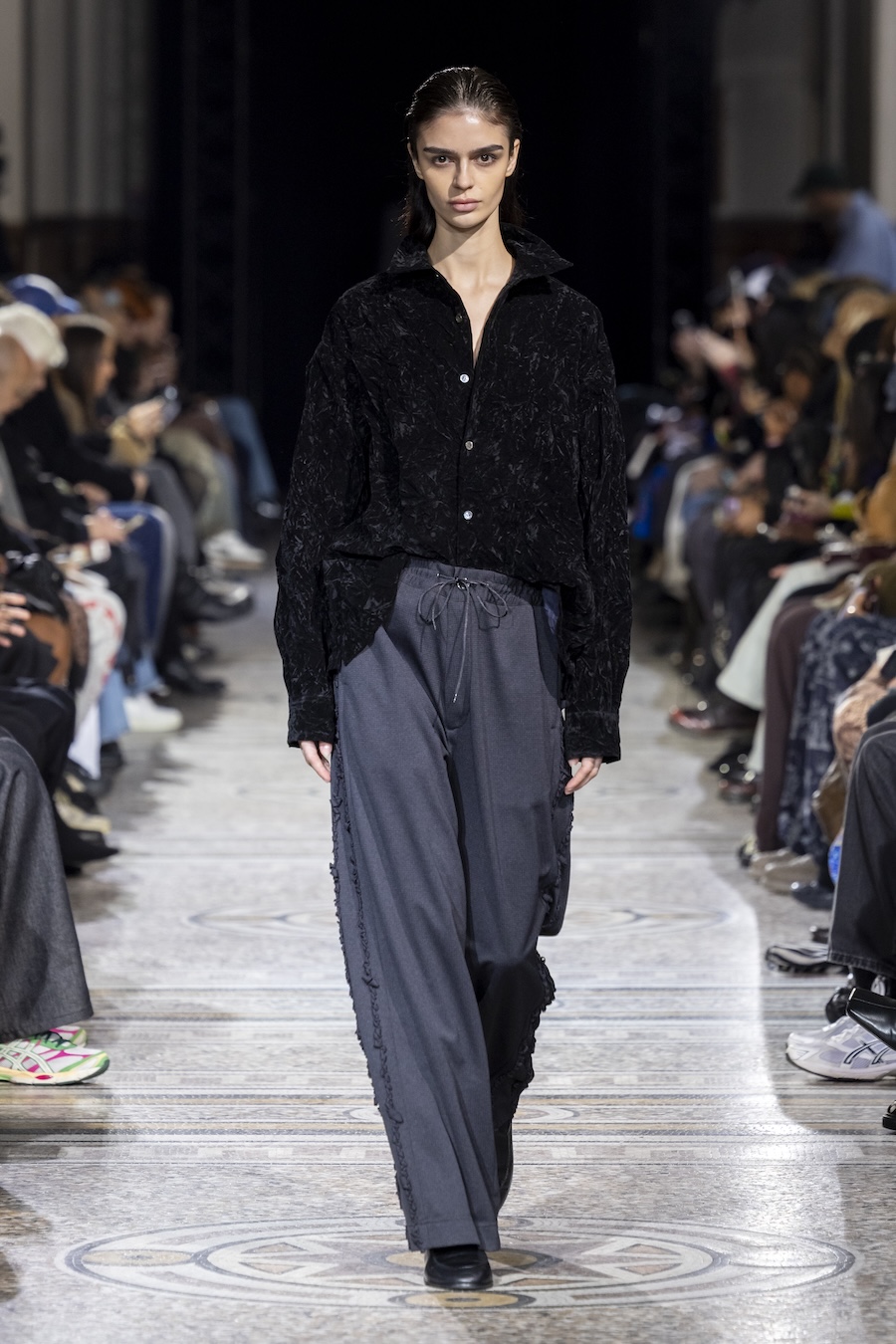 The FW26 collection offers an exploration of distinctive materials and exceptional techniques. Jackets and trousers are crafted in tama-ori silk, a traditional weaving method whose richness is accentuated through luxurious, refined finishes. The intricacies of the dyeing process reveal the nuances of artisanal craftsmanship, with textures that unfold gradually, creating subtle gradients within each garment.