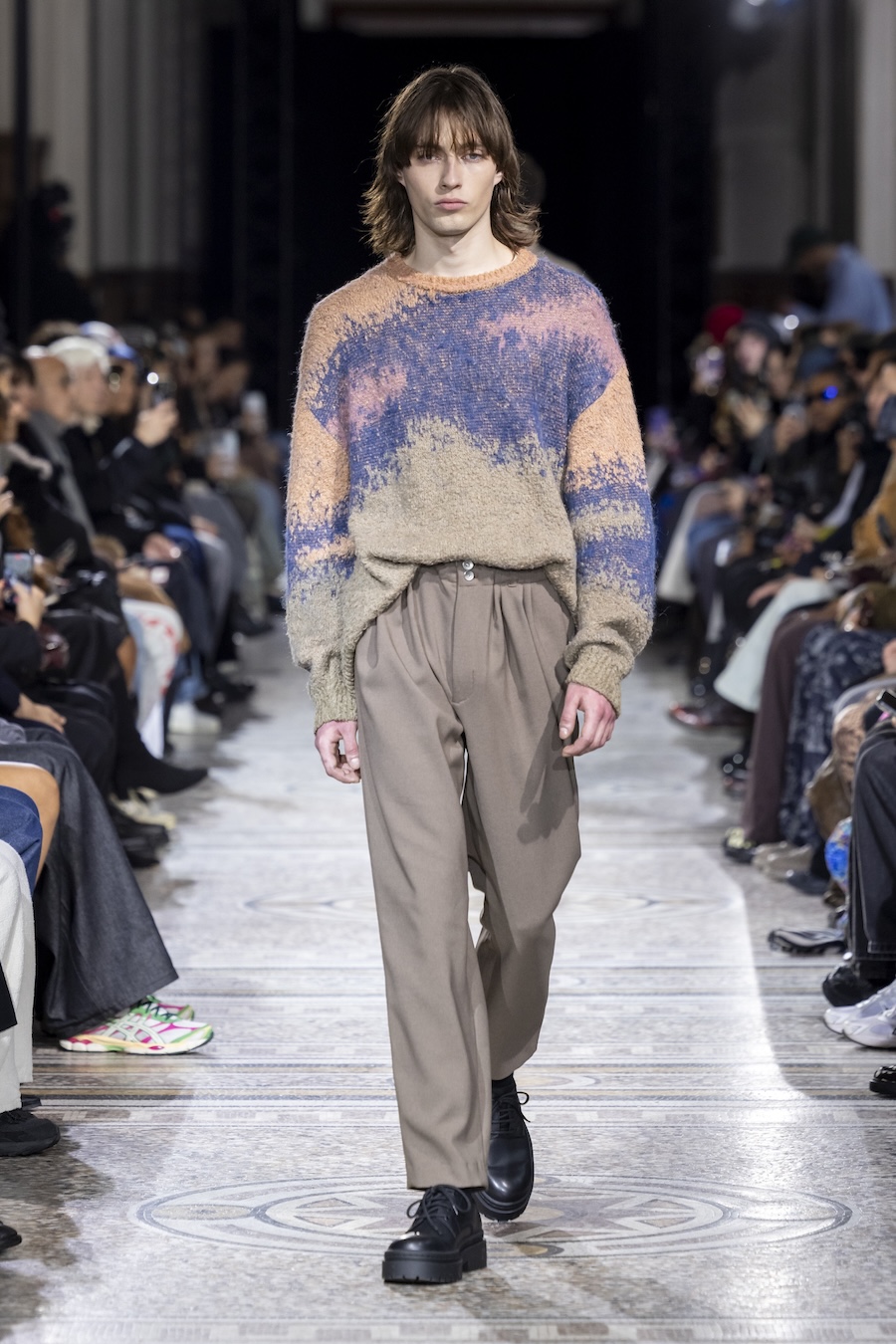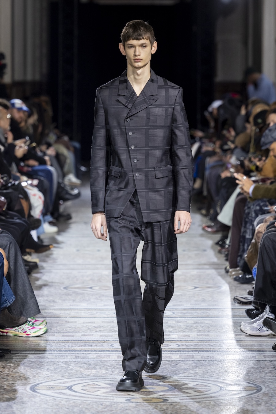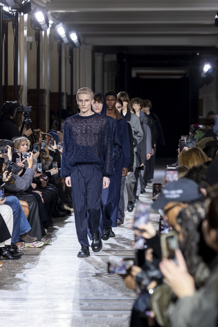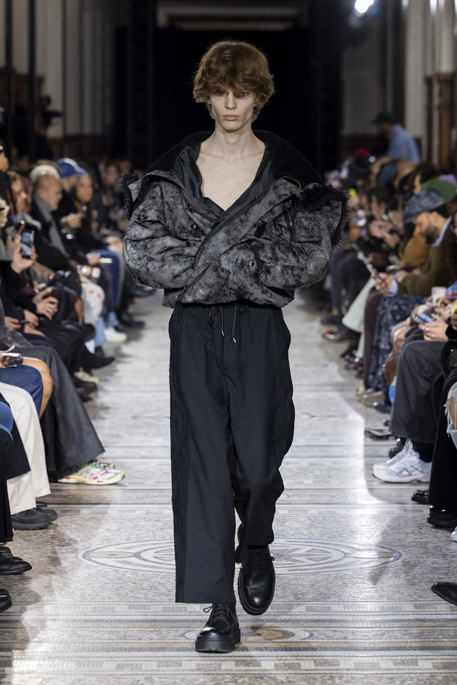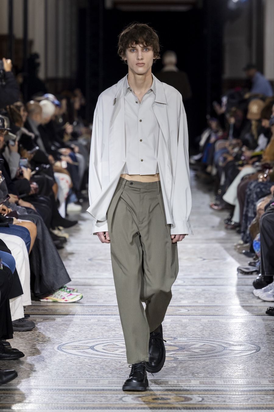 The FW26 collection offers an exploration of distinctive materials and exceptional techniques. Jackets and trousers are crafted in tama-ori silk, a traditional weaving method whose richness is accentuated through luxurious, refined finishes. The intricacies of the dyeing process reveal the nuances of artisanal craftsmanship, with textures that unfold gradually, creating subtle gradients within each garment.