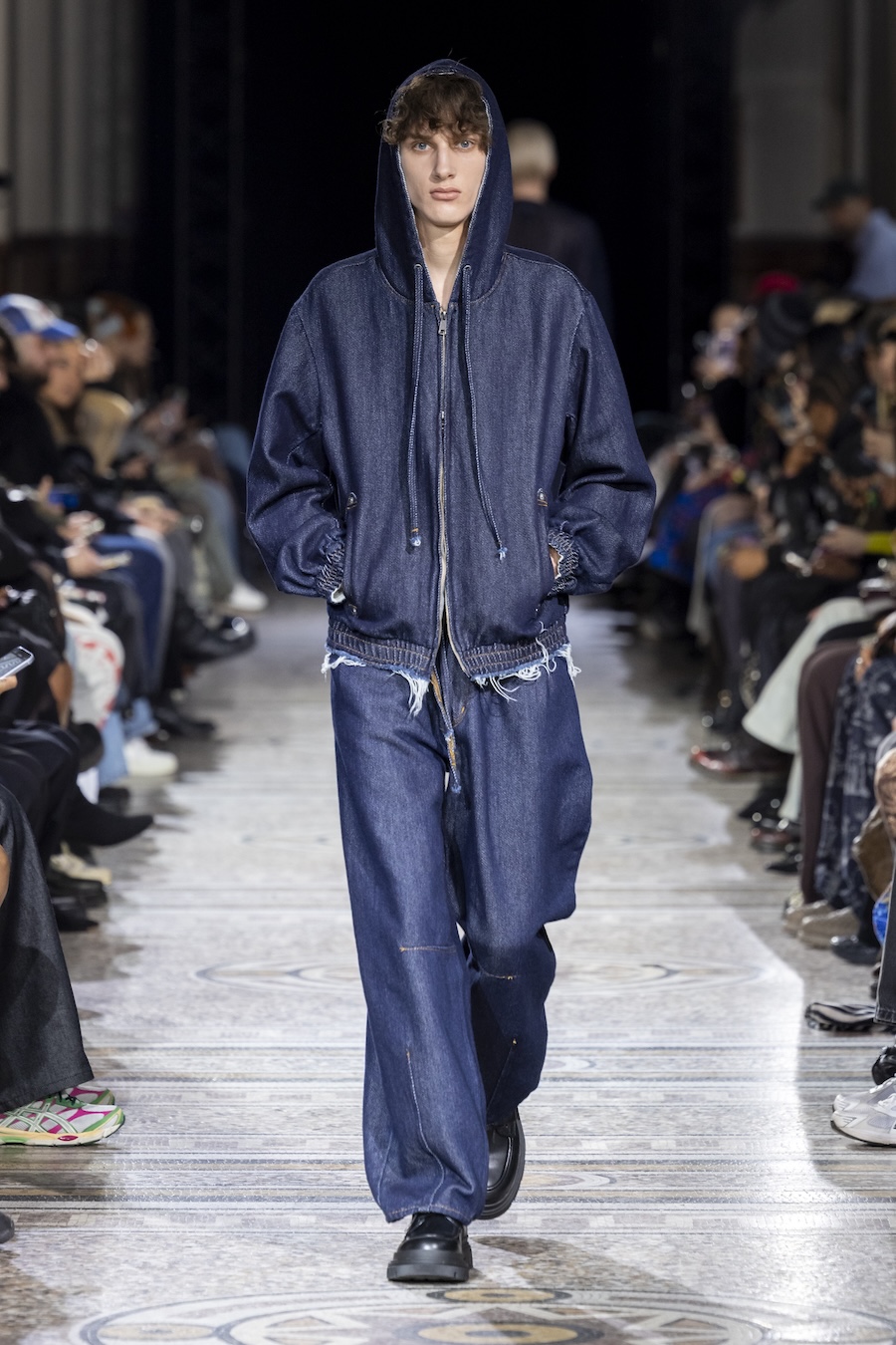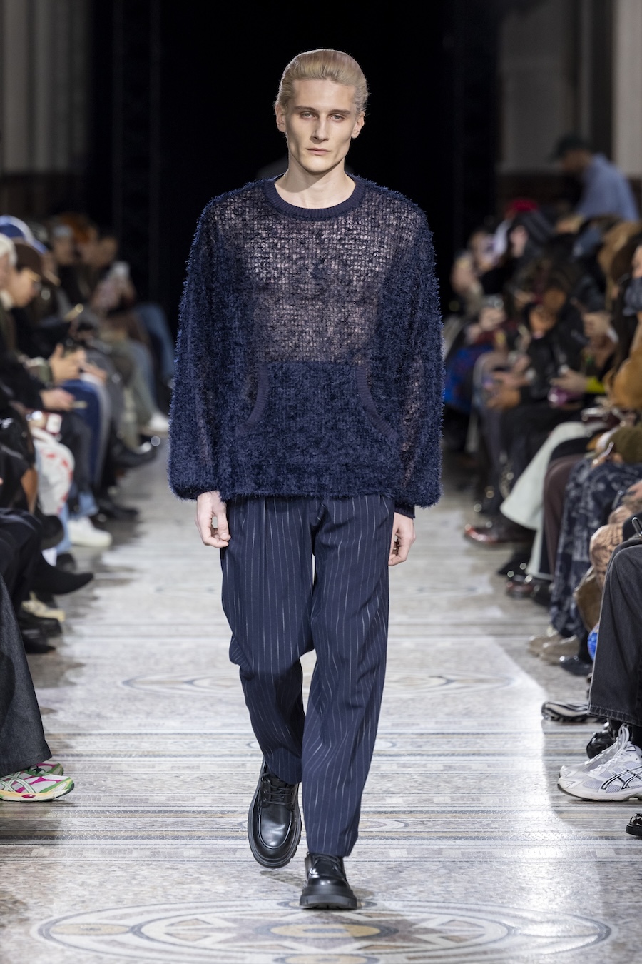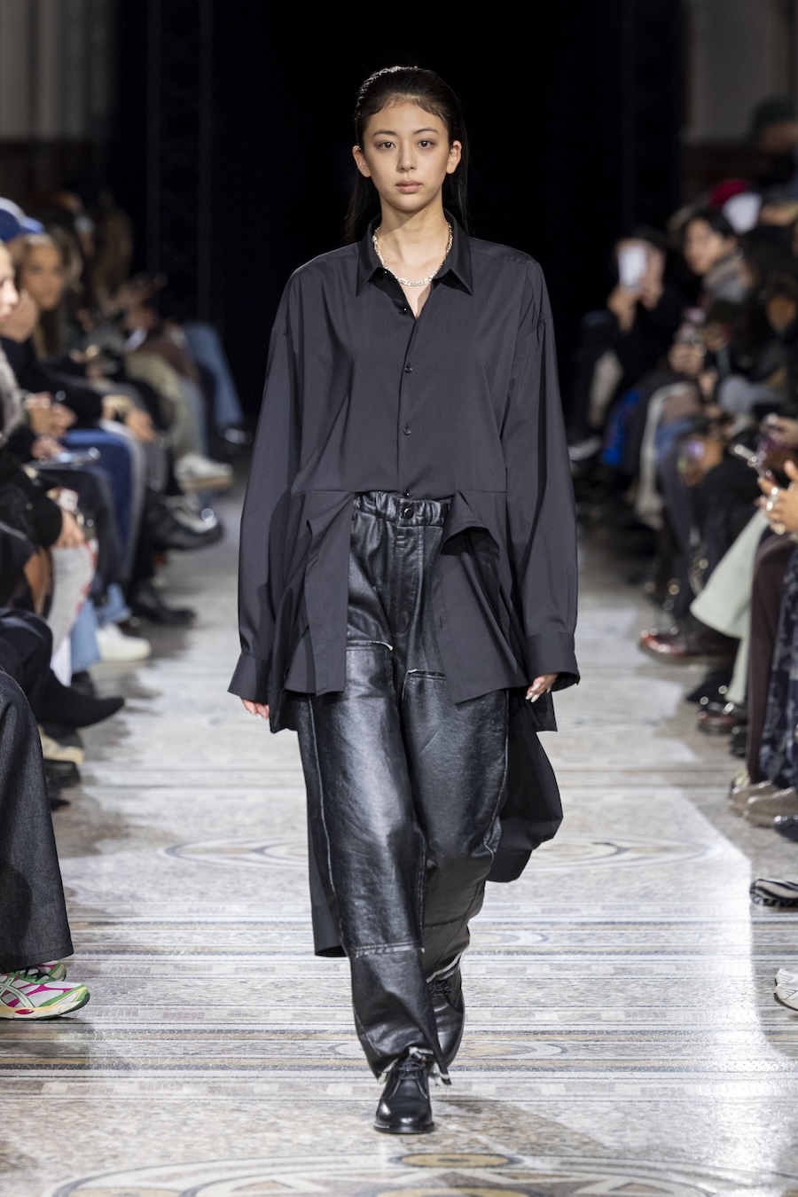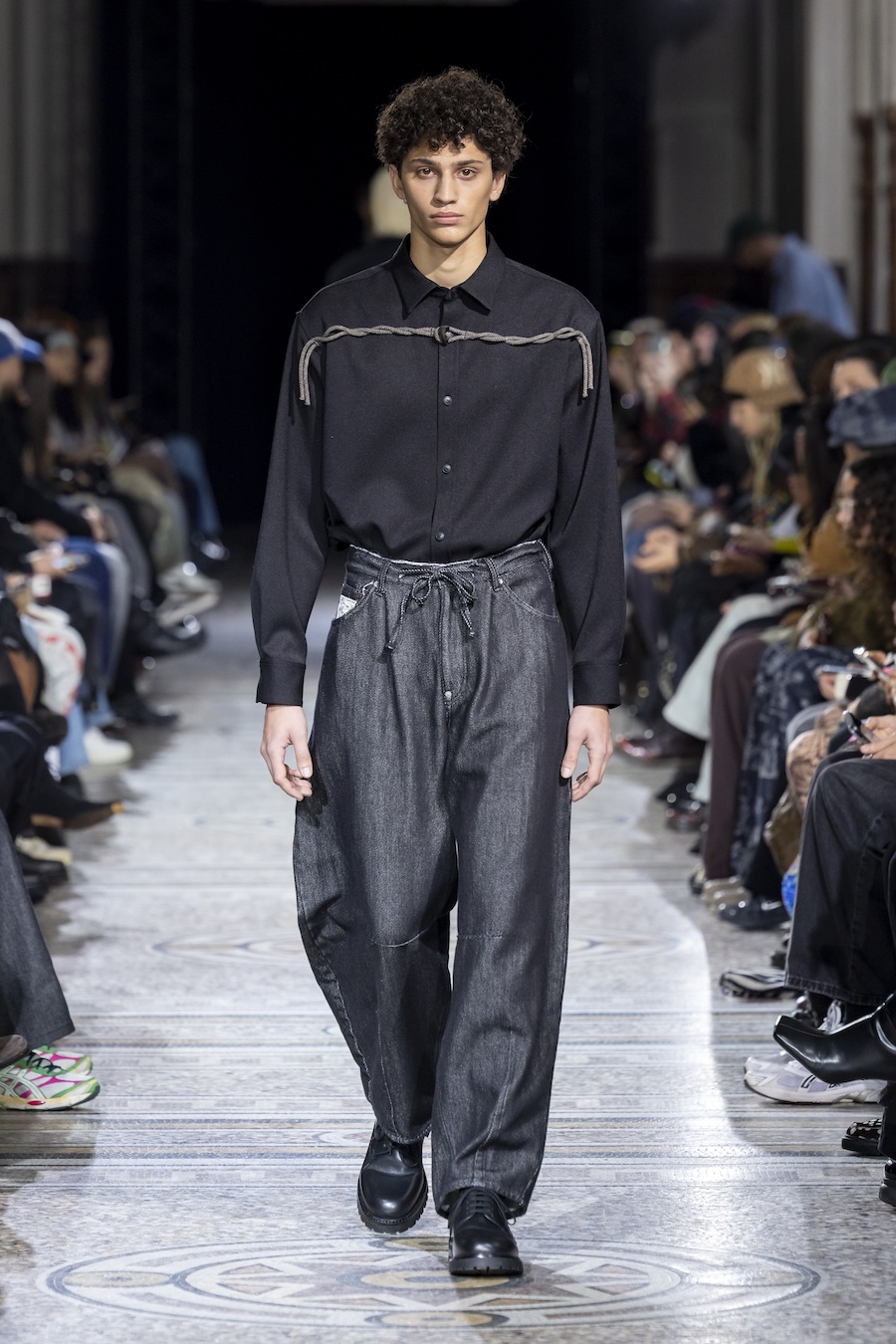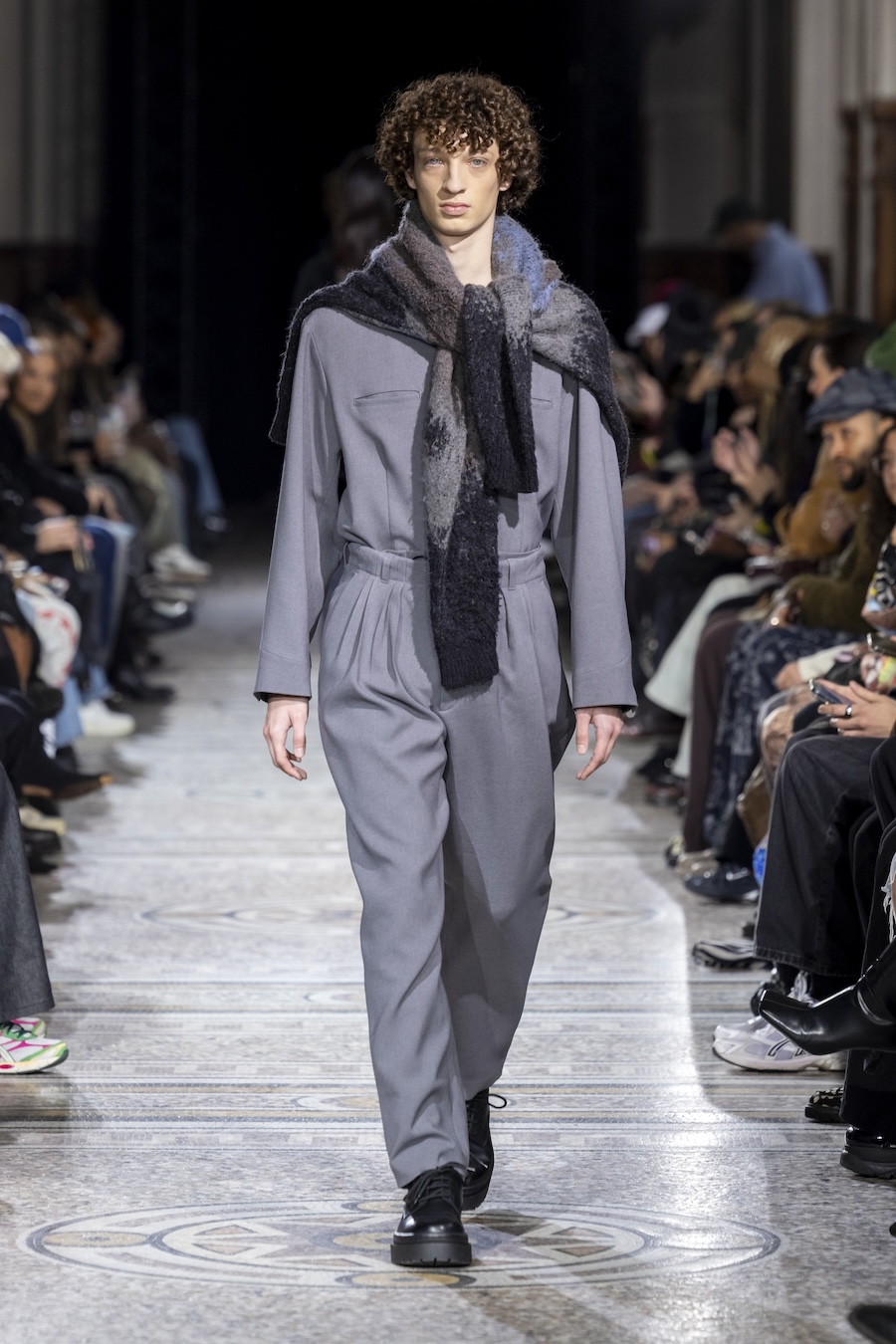 The FW26 collection offers an exploration of distinctive materials and exceptional techniques. Jackets and trousers are crafted in tama-ori silk, a traditional weaving method whose richness is accentuated through luxurious, refined finishes. The intricacies of the dyeing process reveal the nuances of artisanal craftsmanship, with textures that unfold gradually, creating subtle gradients within each garment.
