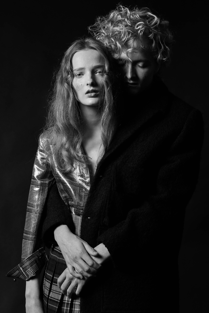 A KALTBLUT exclusive editorial. Photographer Melissa Marcello captured the models Samuel at 3mmodels and Klaudia at Monster Milano for us. Stylist Giulia Revolo used fashion by Versace, Studio Pretzel, Kenzo, Intimissimi, Ksenia Novakoskaia amongst others. Hair and Make Up by Vanessa Icareg. Melancholia: This scenario centers around three concepts linked by the overarching melancholy of the 1930s. Geometric shapes and stiff wearability depict rigid minimalistic lines (Das Triadische Ballet). The overlapping of textures of differering weights will contrast this, creating a sense of form and composition that clash with the original simplicity of minimalism ( Francis Bacon). Finally, harmony between this different elements will come about through the interaction of the two subjects within the scene, making use of pose, fabrics and backdrop to create fluidity within the picture (Christo e Jeanne-Claude).