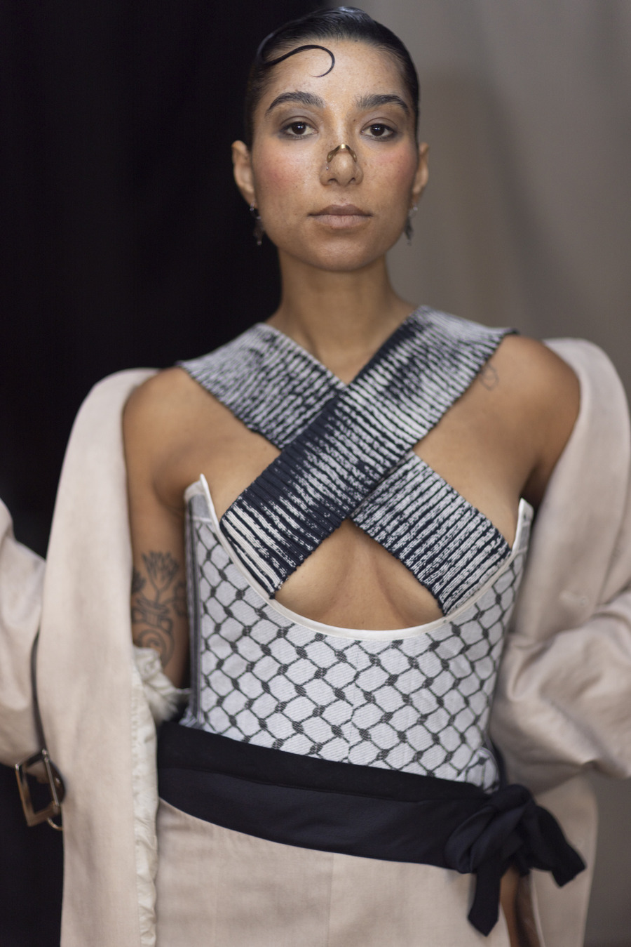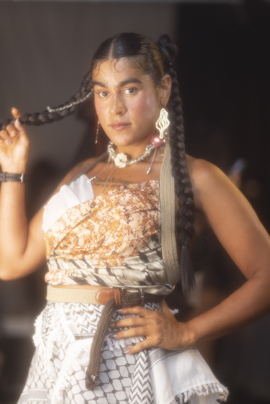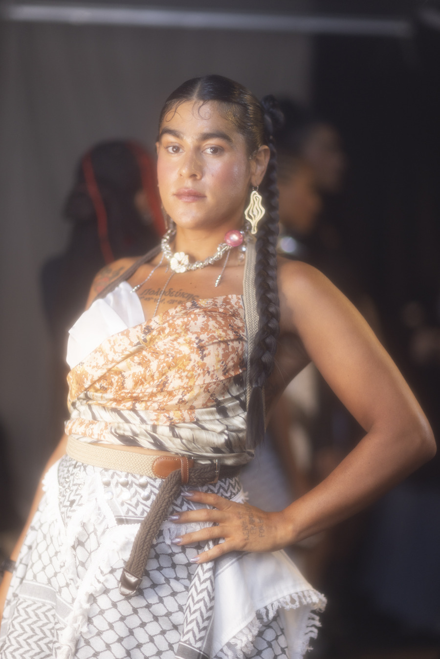 The collection featured reclaimed and vintage fabrics, ingeniously upcycled into striking garments including deconstructed suits and ethereal silk pieces. Each design resonated with the spirit of powerful, sensual warriors, characterized by upward spirals and natural fibres. The use of elements like the keffiyeh signified solidarity, while silhouettes captured the essence of the modern revolutionary—bold, wearable, and unapologetically resistant. Adhering to zero-waste principles and a focus on repurposed materials, the collection stood as a symbol of sustainability and empowerment.