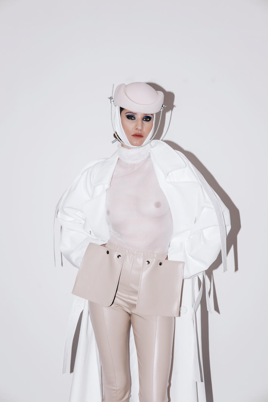 On top of timeless sensuality, the silhouettes in the autumn/winter 2021 collection are tailored so that they can accompany the person wearing them throughout the whole day. These are pieces we can easily wear around the city, to a get together with friends and even on vacation. Accessories by Eva Che from CheHub COLLECTIVE complement altogether twenty silhouettes. Eva Che also beautifully altered hats by TONAK and touched up all stylings.