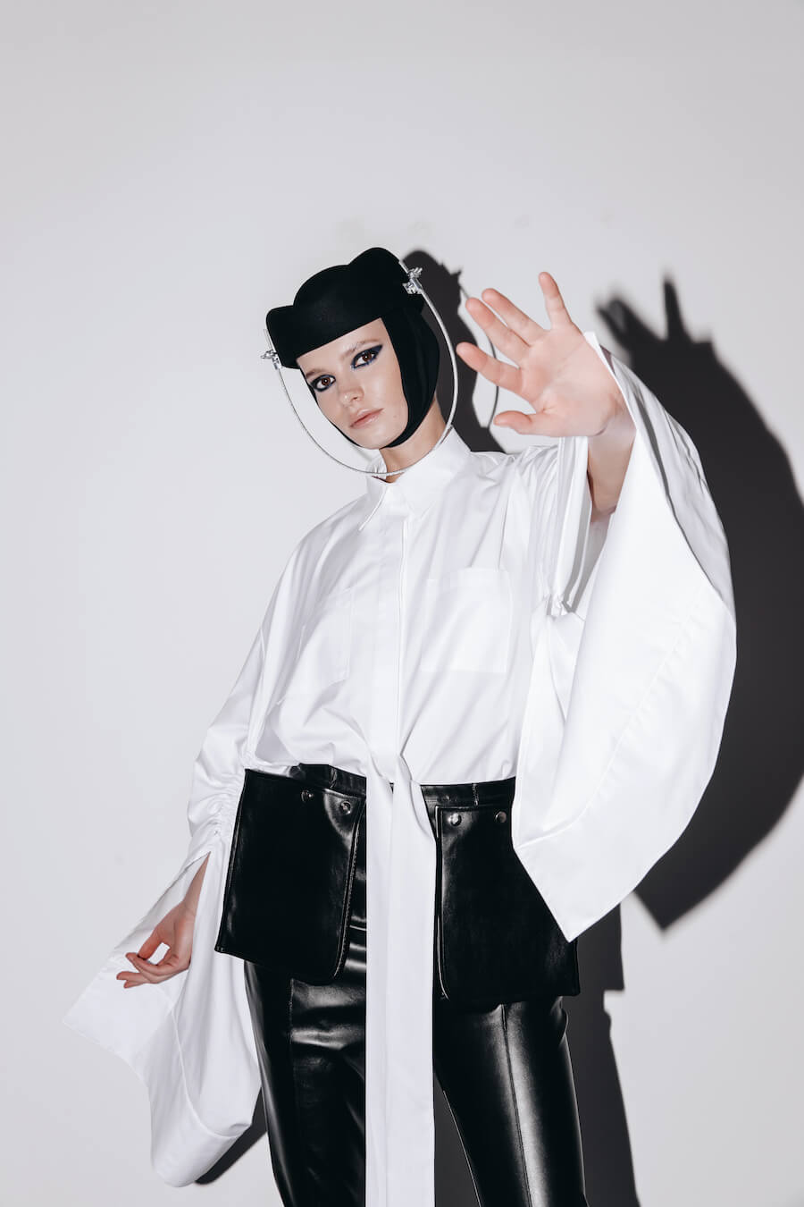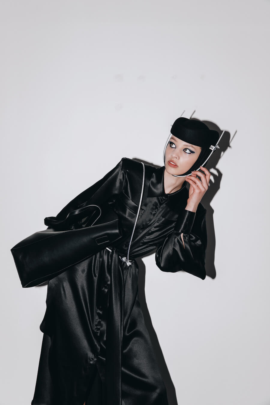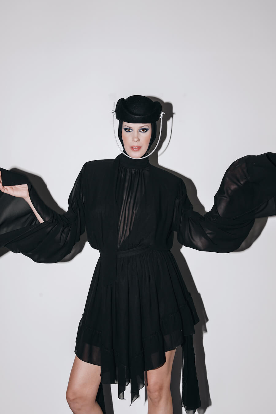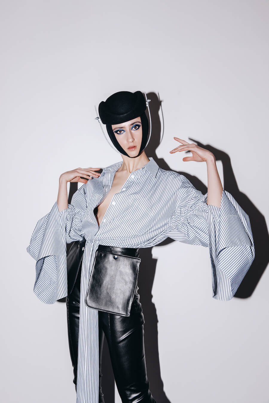 On top of timeless sensuality, the silhouettes in the autumn/winter 2021 collection are tailored so that they can accompany the person wearing them throughout the whole day. These are pieces we can easily wear around the city, to a get together with friends and even on vacation. Accessories by Eva Che from CheHub COLLECTIVE complement altogether twenty silhouettes. Eva Che also beautifully altered hats by TONAK and touched up all stylings.