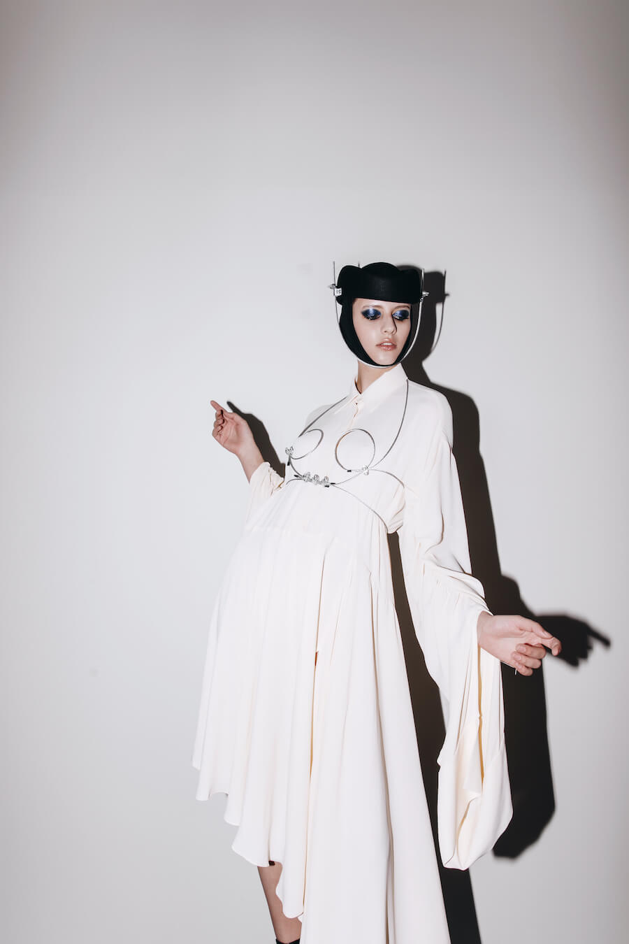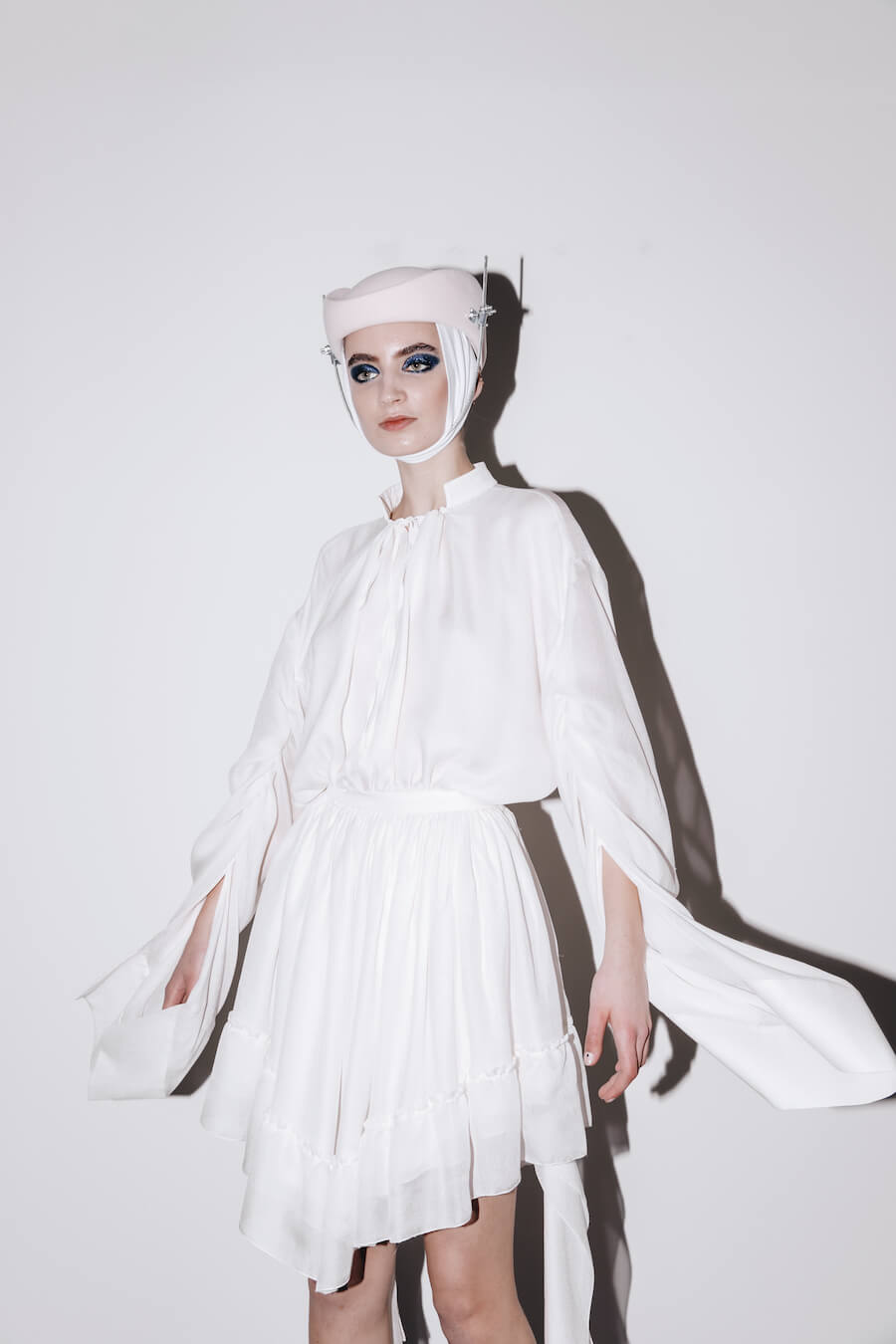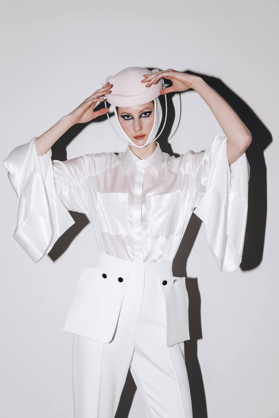 On top of timeless sensuality, the silhouettes in the autumn/winter 2021 collection are tailored so that they can accompany the person wearing them throughout the whole day. These are pieces we can easily wear around the city, to a get together with friends and even on vacation. Accessories by Eva Che from CheHub COLLECTIVE complement altogether twenty silhouettes. Eva Che also beautifully altered hats by TONAK and touched up all stylings.