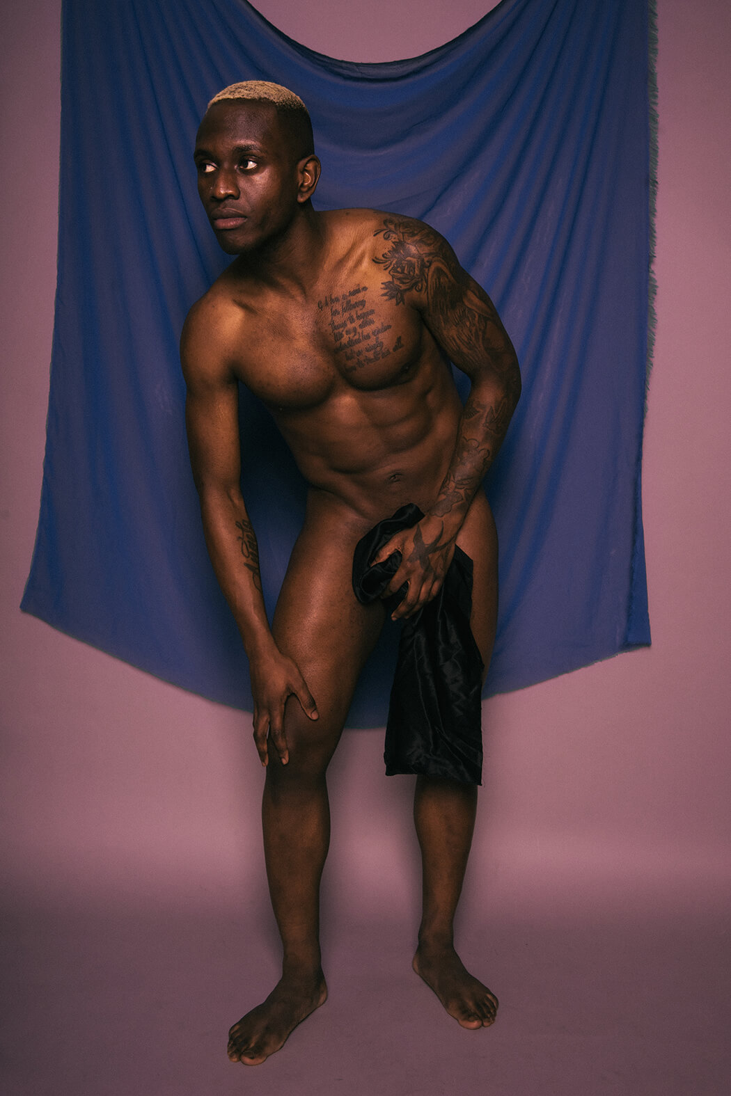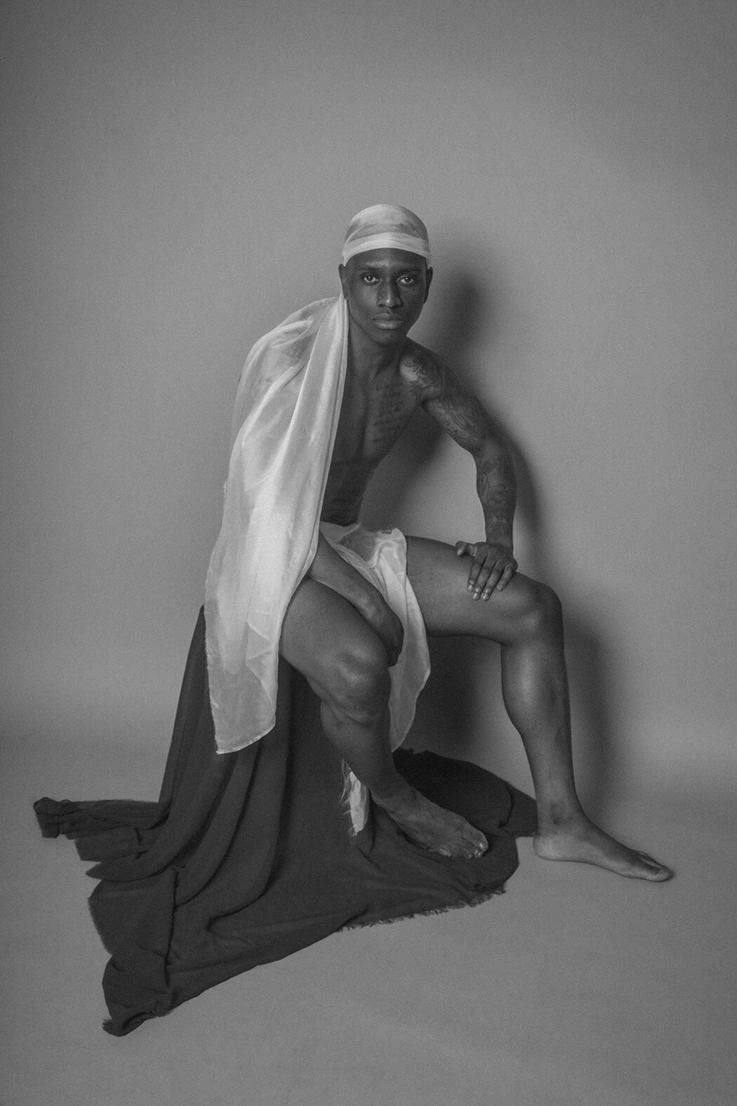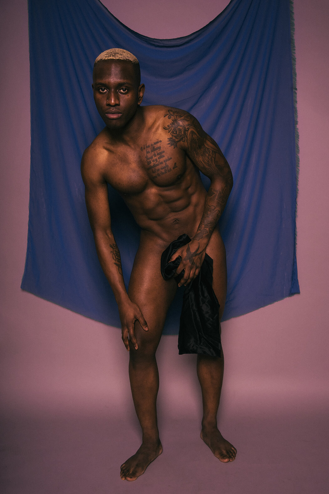 A KALTBLUT exclusive. Photography by Iasmina Panduru, a Romanian fashion photographer, recently graduated from London College of Fashion. Model is Parris Mason. “Hungry for diversity and tired of seeing iconic powerful men represented as mostly being white in art history, I decided to do a set of images inspired by Michelangelo’s David – a contemporary view on today’s minorities. Re-imagining a Biblical character and offering such a powerful role to a man of colour might not be new, but will definitely be considered outraging by many. But that’s fine because I love to provoke my audience and especially when it comes to social political issues like this. The purpose of this shoot was to show the complex beauty and royalty of dark skin but also to bring homage to African soldiers that lost their lives in wars throughout history. This shoot was created by using only fabrics and textile materials.”
