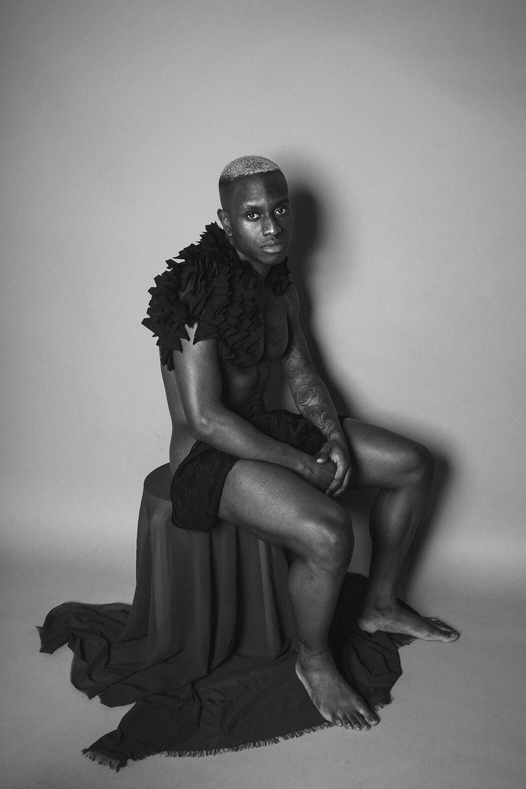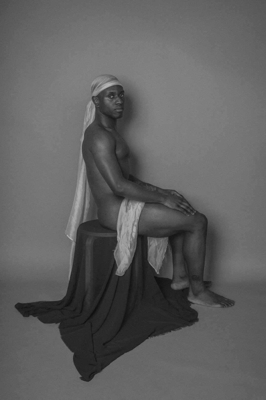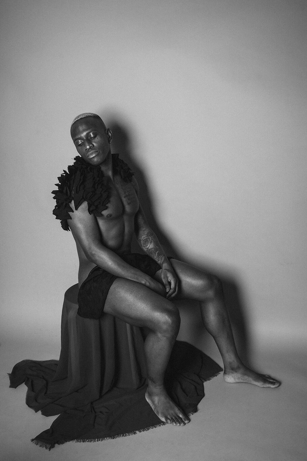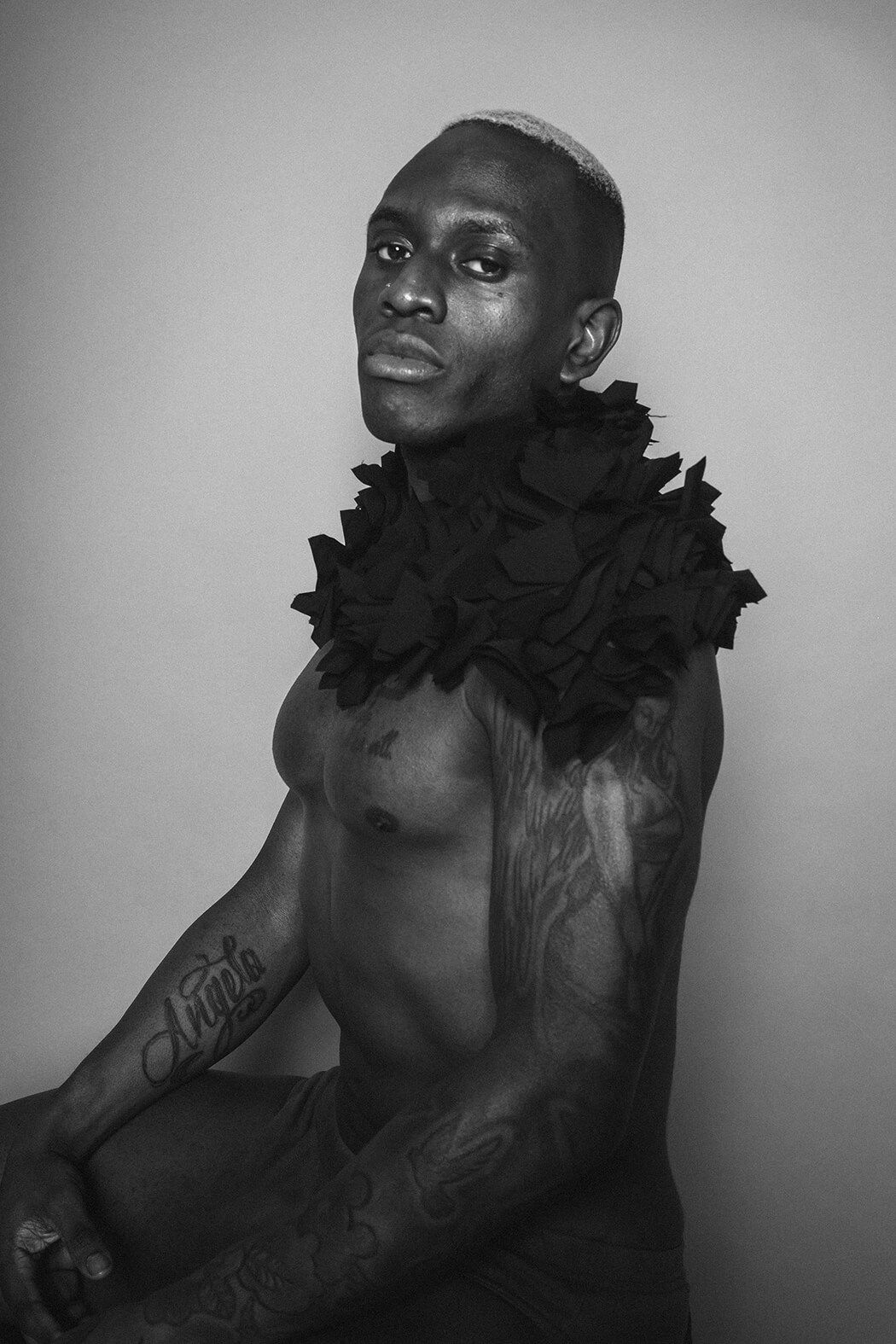 A KALTBLUT exclusive. Photography by Iasmina Panduru, a Romanian fashion photographer, recently graduated from London College of Fashion. Model is Parris Mason. “Hungry for diversity and tired of seeing iconic powerful men represented as mostly being white in art history, I decided to do a set of images inspired by Michelangelo’s David – a contemporary view on today’s minorities. Re-imagining a Biblical character and offering such a powerful role to a man of colour might not be new, but will definitely be considered outraging by many. But that’s fine because I love to provoke my audience and especially when it comes to social political issues like this. The purpose of this shoot was to show the complex beauty and royalty of dark skin but also to bring homage to African soldiers that lost their lives in wars throughout history. This shoot was created by using only fabrics and textile materials.”