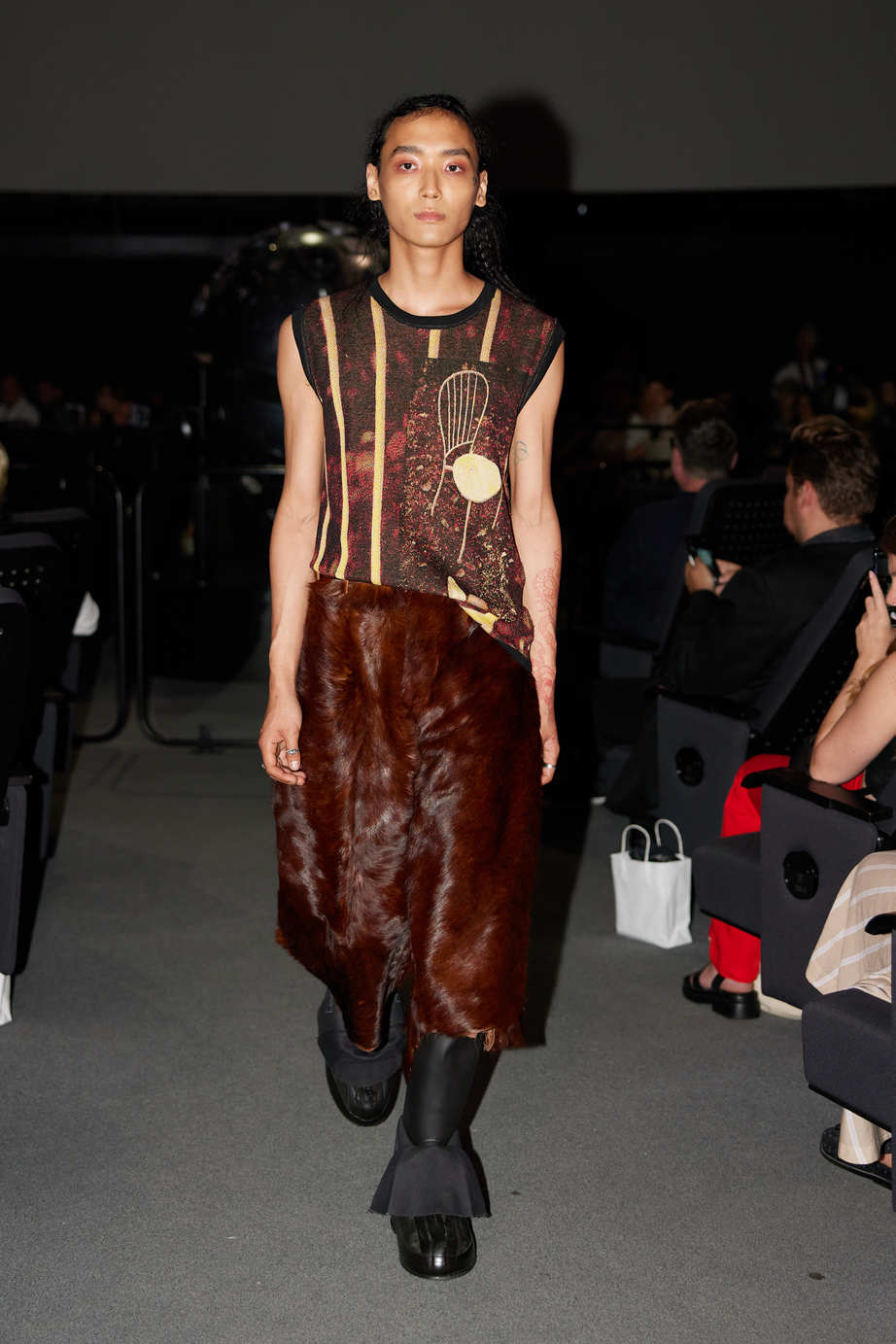 Earthy tones such as black, white, green, brown, and subtle red and silver accents dominate, creating a harmonious blend of colours reminiscent of the earth’s natural palette. Leather and transparent flowing fabrics are ingeniously used to represent the raw yet tender side of nature.