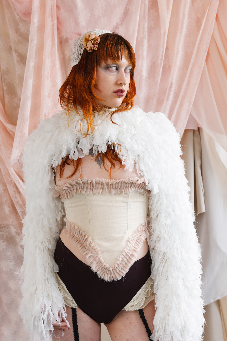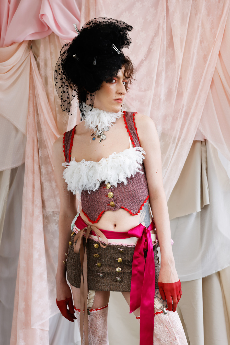 With a bold declaration of defiance against conformity, Milla’s designs unfurled in a riotous celebration of extravagance. Feathers mingled with stockings, bustles danced with lampshade dresses, and corsets intertwined with ribbons and tulle, echoing the flamboyance of 19th-century Dandies and the rebellious spirit of 80s Glam Rock.