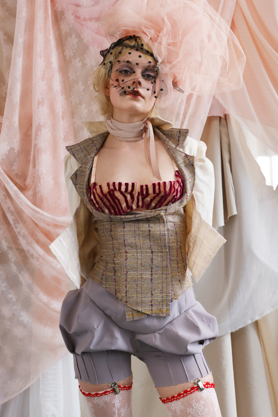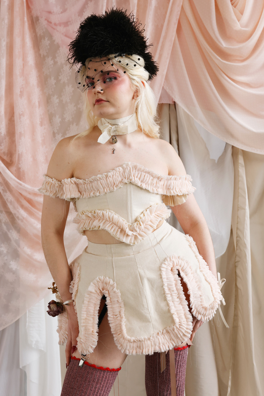 With a bold declaration of defiance against conformity, Milla’s designs unfurled in a riotous celebration of extravagance. Feathers mingled with stockings, bustles danced with lampshade dresses, and corsets intertwined with ribbons and tulle, echoing the flamboyance of 19th-century Dandies and the rebellious spirit of 80s Glam Rock.