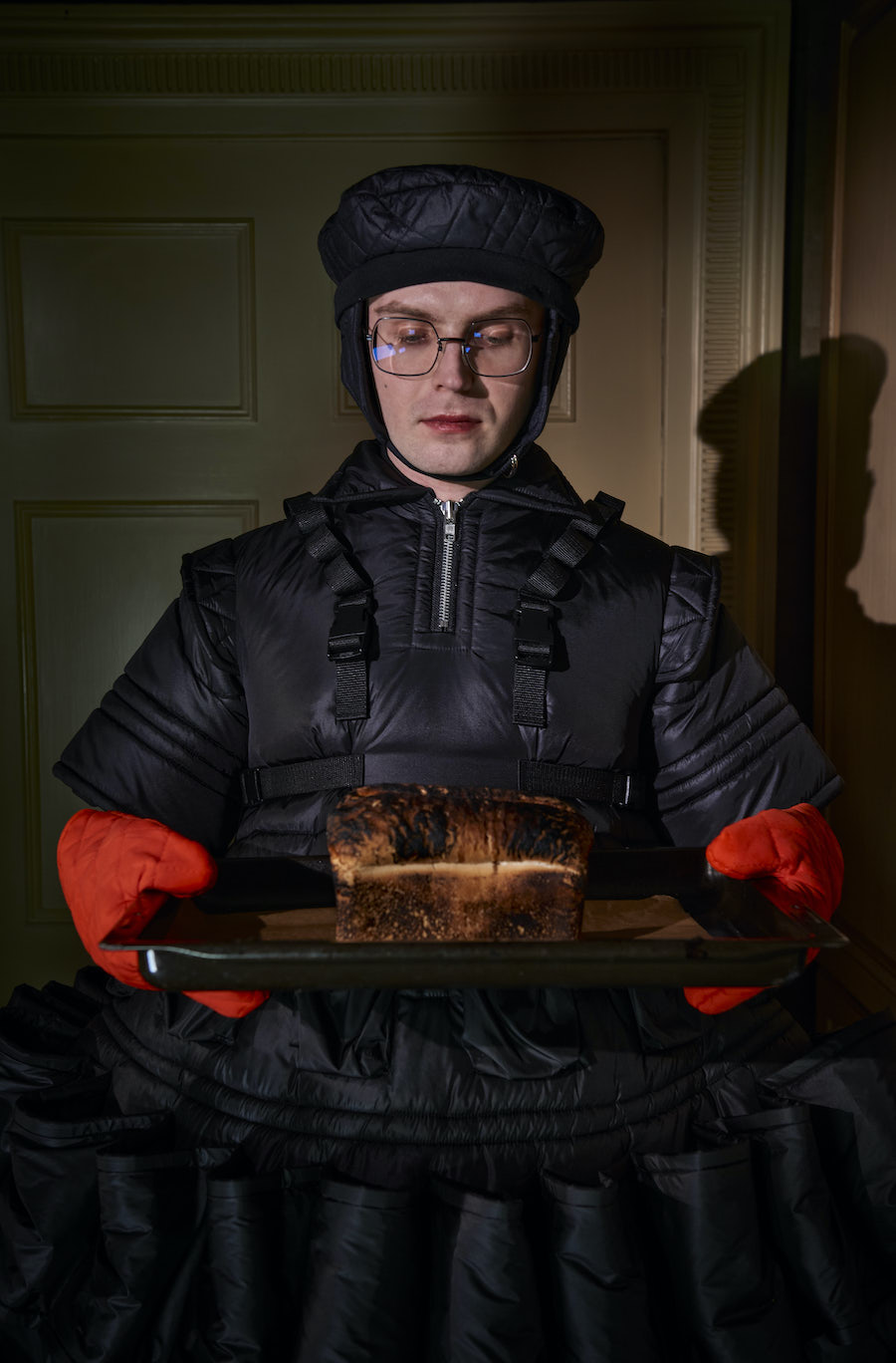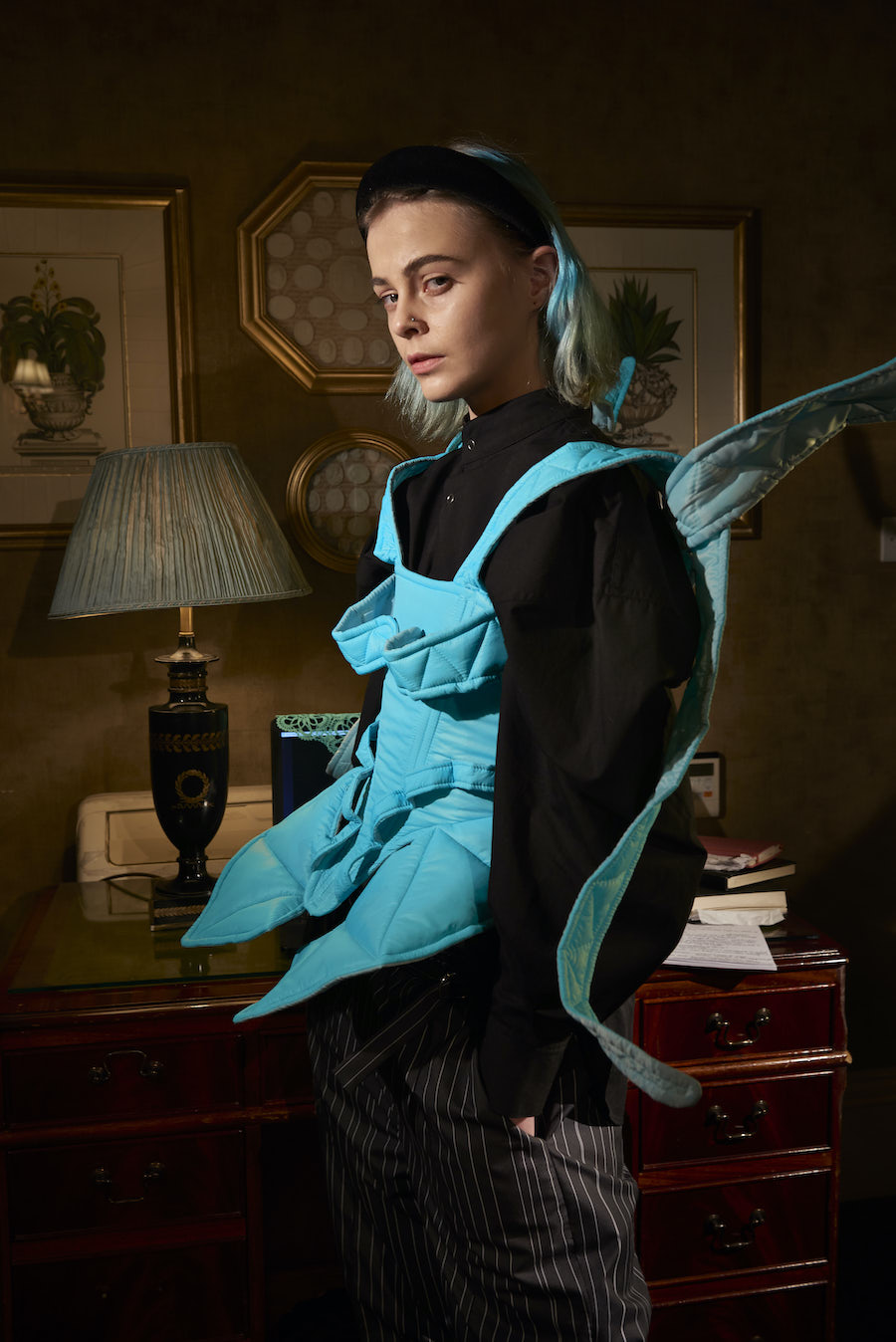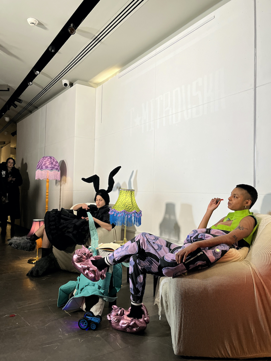 “ It felt right to strip the performance down to a simple snippet of someone’s living room life, no subtext, no special effects, no glamour – just lockdown boredom. In the nostalgia for physical interaction, it was important to allow the audience to interact with the clothes, which were presented on a rail available to be tried on, to interact with the models, who were mingling with the crowd after the presentation finished, to allow the audience to enter the imagined living room and formally become part of the presentation by writing down in a notebook that circulated around alongside the question ‘How do you mind your mind?’.