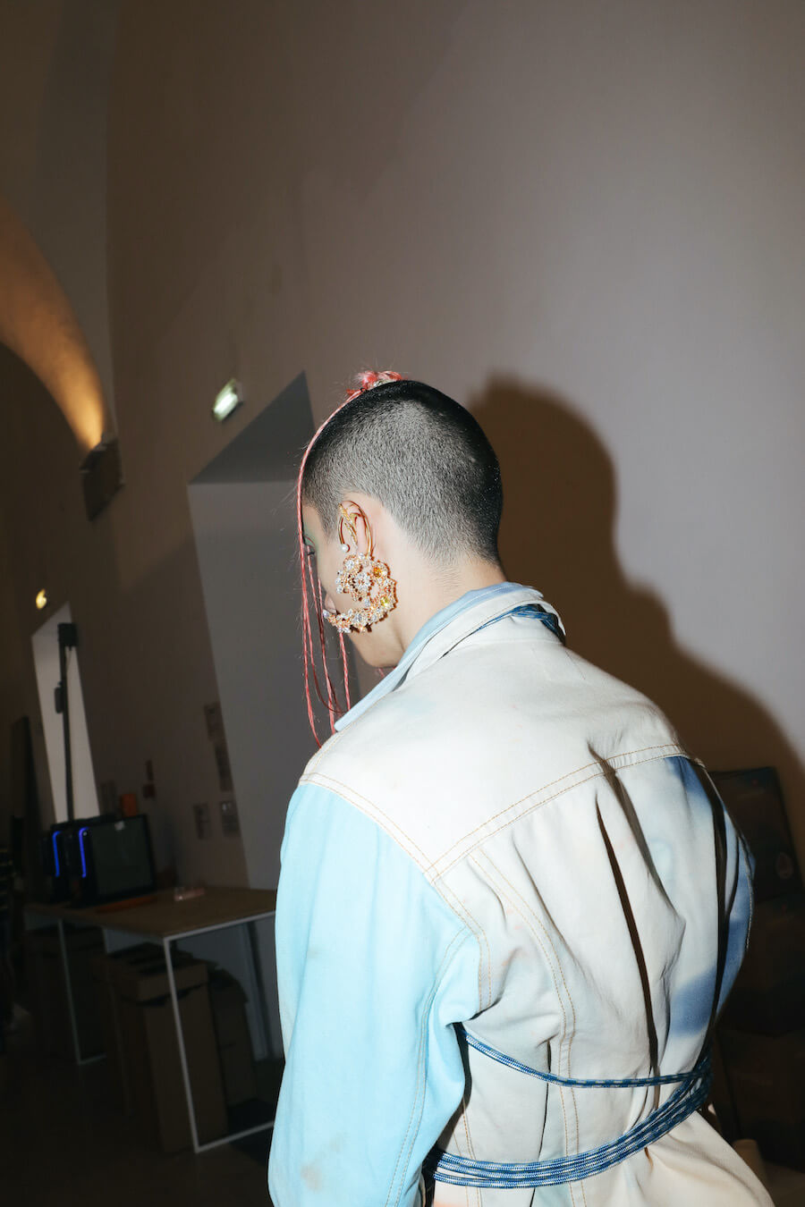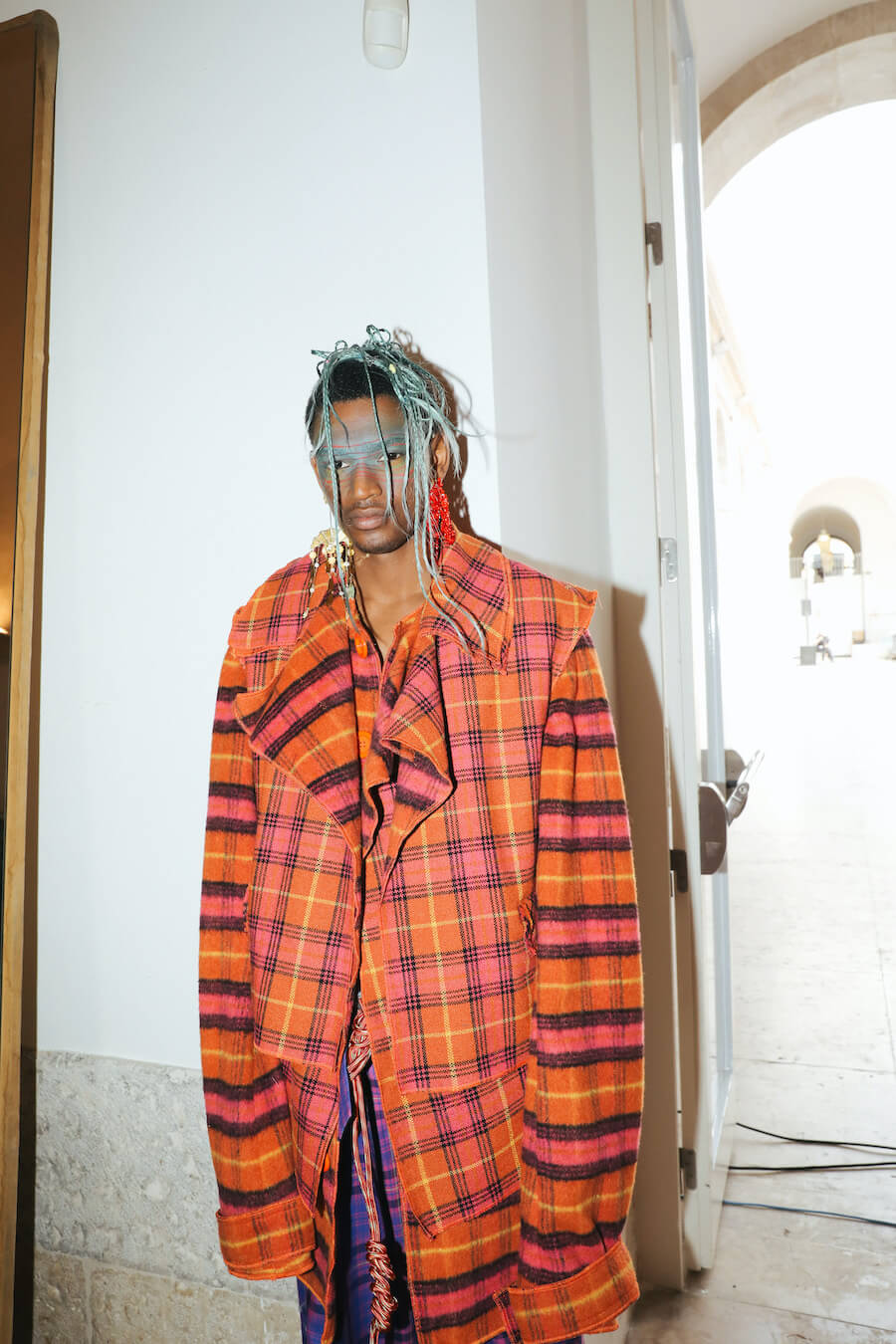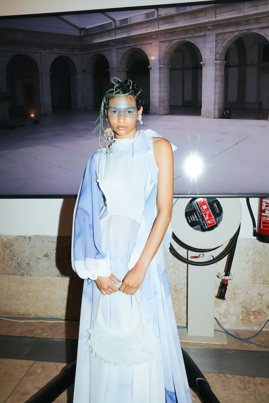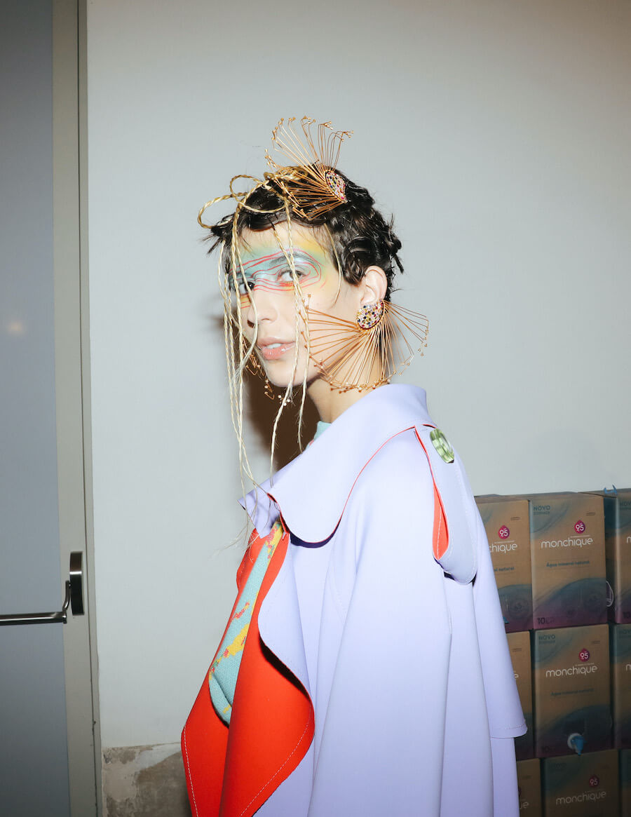 For Fall/Winter 2021/22, JMGLHS presents once again a fusion High/Lo tech. The natural world is now represented by the oceans, beginning with several days of research on Portugal’s southern coast, which led to further experiments in the studio with construction and reconstruction both of form and through the medium of 3D digital art. Once again, this contrasts with the urban world of streetwear after another trip to Mexico, and also surf culture, visible in both the use of neoprene and knitwear pieces. Deadstock was used, where possible, to reaffirm the brand’s commitment to sustainability. Backstage photos by Gonçalo Silva @goncaloasilva