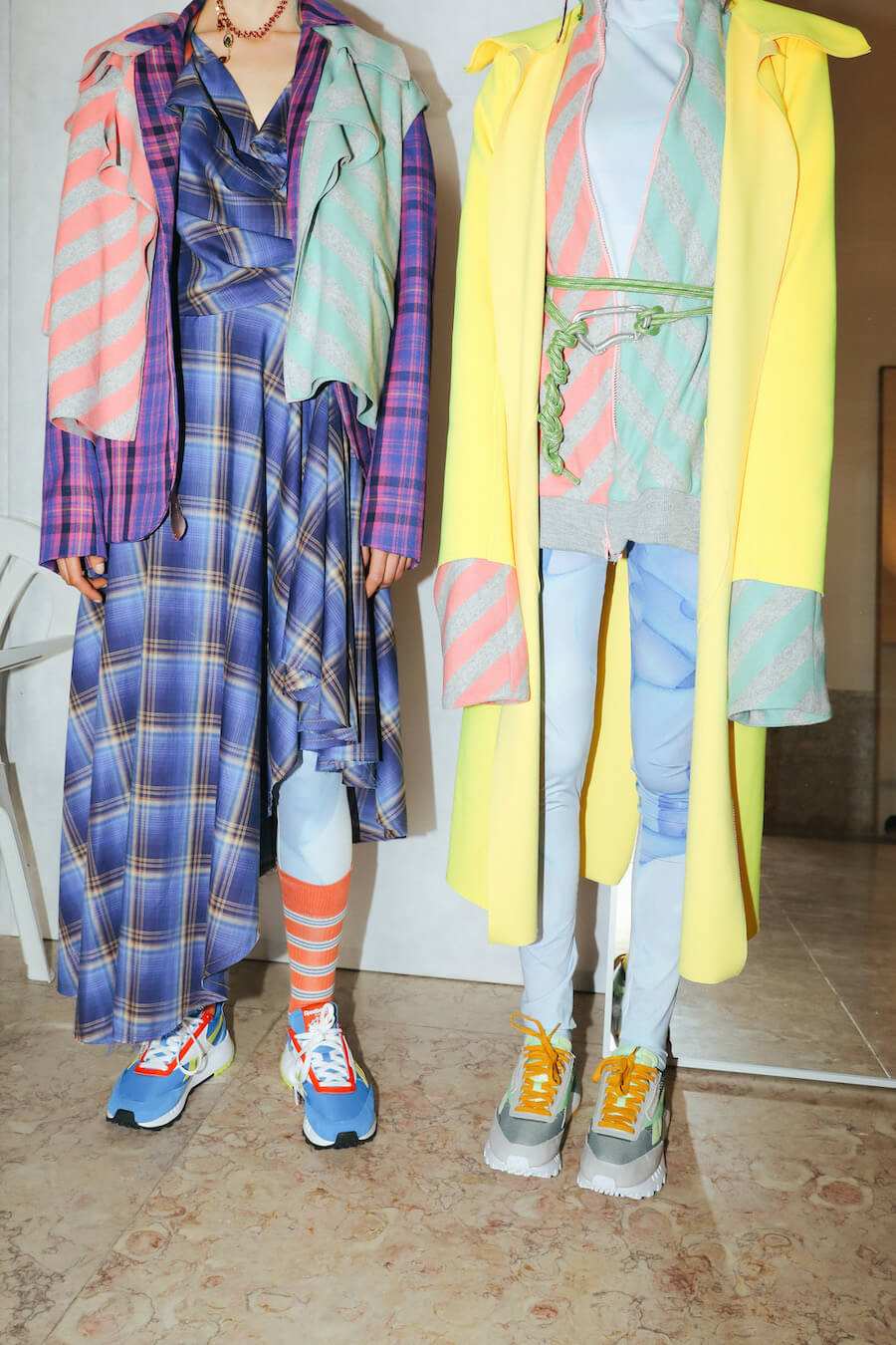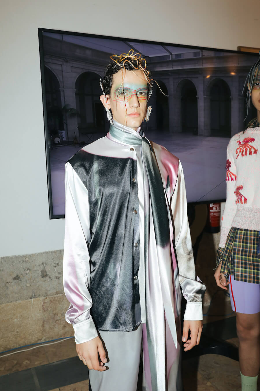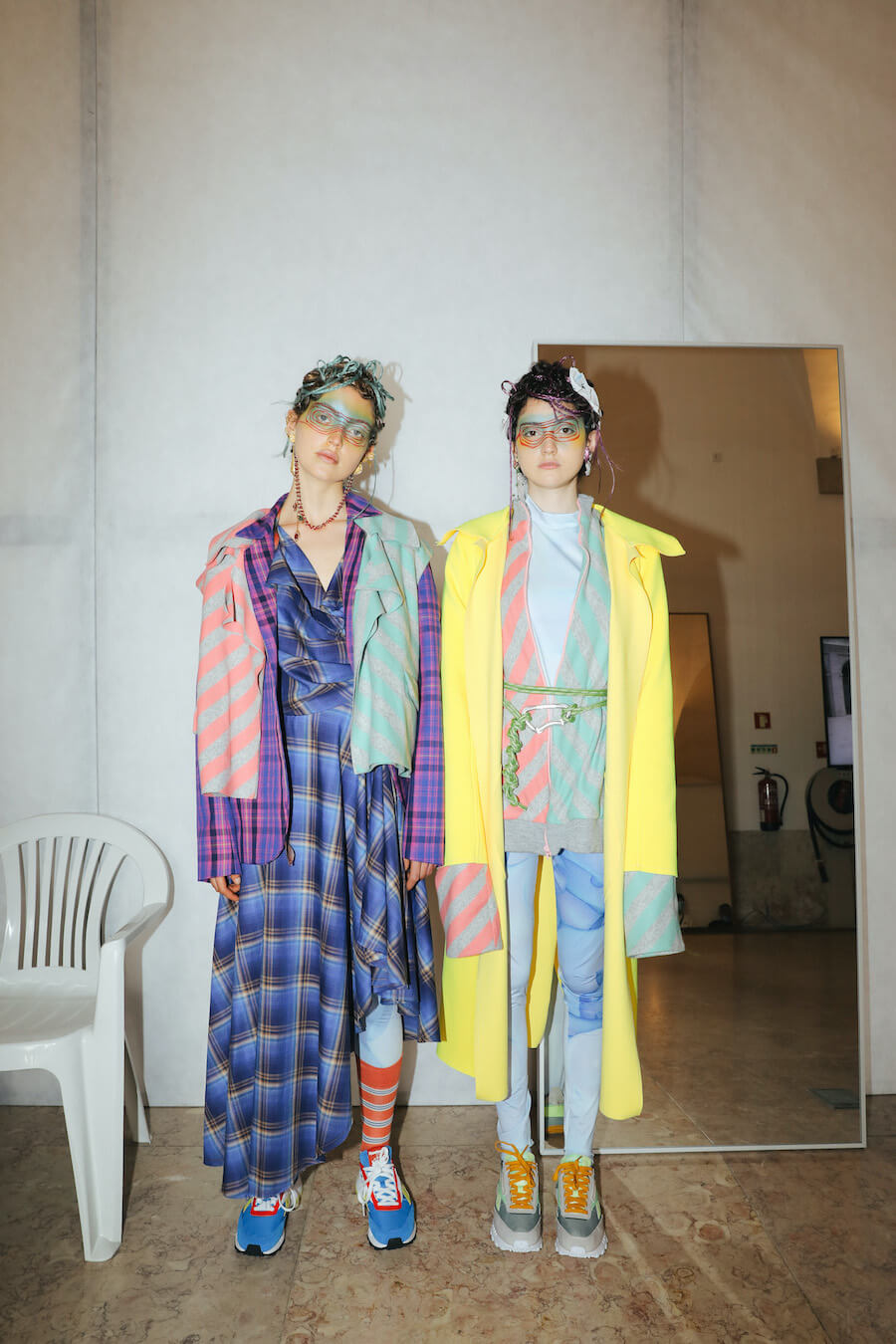 For Fall/Winter 2021/22, JMGLHS presents once again a fusion High/Lo tech. The natural world is now represented by the oceans, beginning with several days of research on Portugal’s southern coast, which led to further experiments in the studio with construction and reconstruction both of form and through the medium of 3D digital art. Once again, this contrasts with the urban world of streetwear after another trip to Mexico, and also surf culture, visible in both the use of neoprene and knitwear pieces. Deadstock was used, where possible, to reaffirm the brand’s commitment to sustainability. Backstage photos by Gonçalo Silva @goncaloasilva