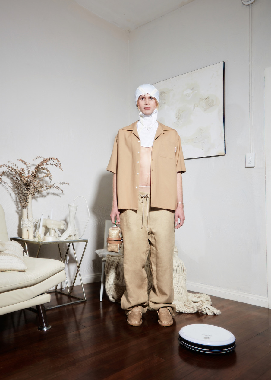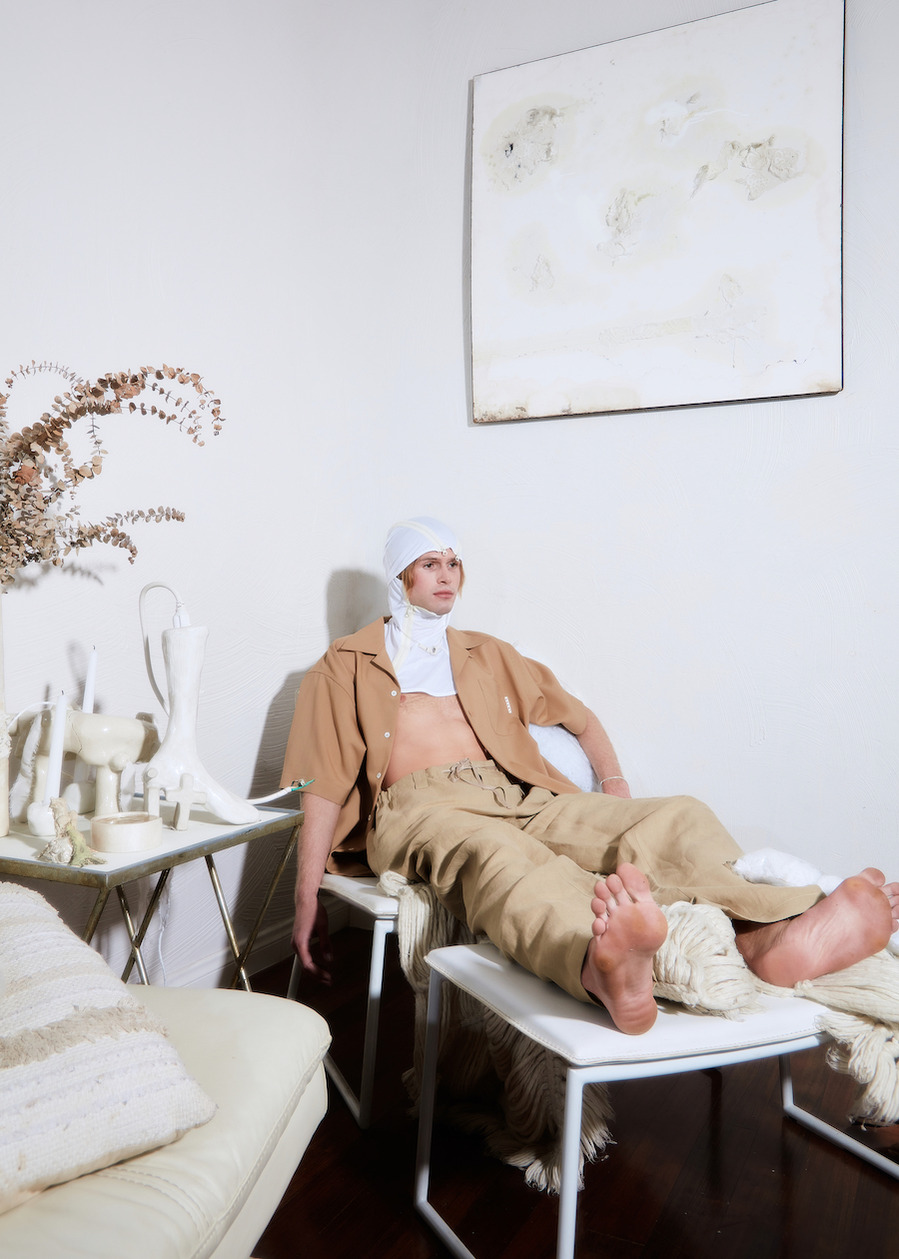 CC is a self-taught artist based in Venice Beach and in three years of practice, he has created a ceramic collection centered around an inner dreamscape brought into the physical world. Primarily glazed in white, the shapes take various forms but maintain simplicity while staying true to the subject’s essence, a mirror to their hue. His work has been presented at “-ing” Group Collective and The Bombay Beach Biennale. Styled in his hues, we photographed the artist amongst his collection and spoke about his practice, inspirations, fashion, & life.