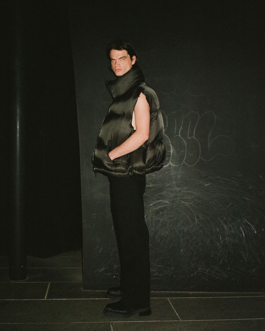 Moose Knuckles’ expertise in craftsmanship and technical engineering is especially evident in the collection’s puffers. Designed in a hyper-light form for effortless mobility in colder months, they’re filled with supremely warm RDS-certified down and offered in a neutral mélange tone or classic black. Additionally, the Fall/Winter 2022 Moose Knuckles x Eckhaus Latta collection offers a quilted nylon vest and matching pants as multifunctional separates that can be worn layered with other pieces.