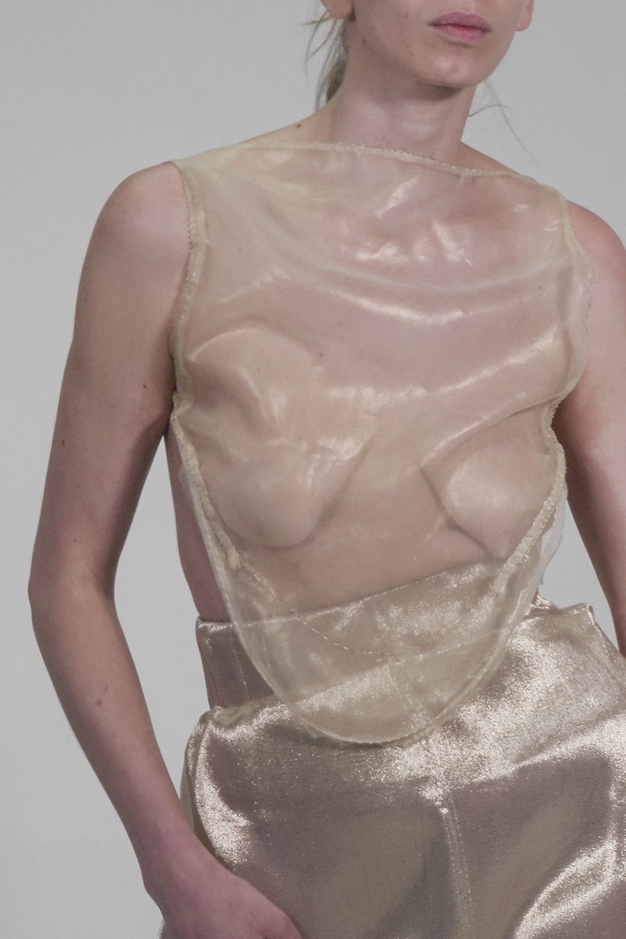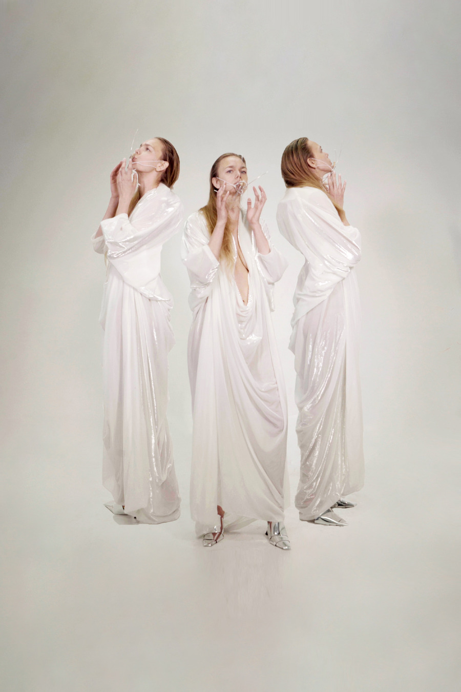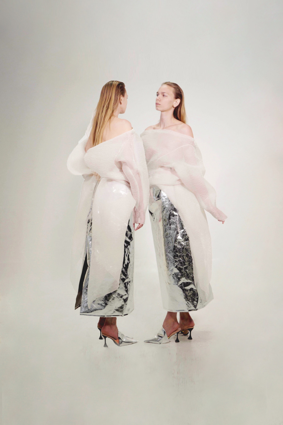 The inhabitants have evolved into hybrid cyborg forms, both nurturing the electric sparrows and at the same time constructing devices to excise life without surveillance. In this collection, Weijing delves into couture-making techniques and chooses to accentuate different parts of female bodies other than what traditionally constitutes femininity. Their methodology of fabrication follows the delicate and natural properties of the textiles, eliminating elaborate under-constructions yet manifesting sculptural and airy silhouettes. MOTHER is both a love letter to female bodies and a poetic interpretation of Donna Haraway’s theories into an unsubstantial dystopian dream.