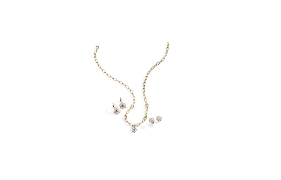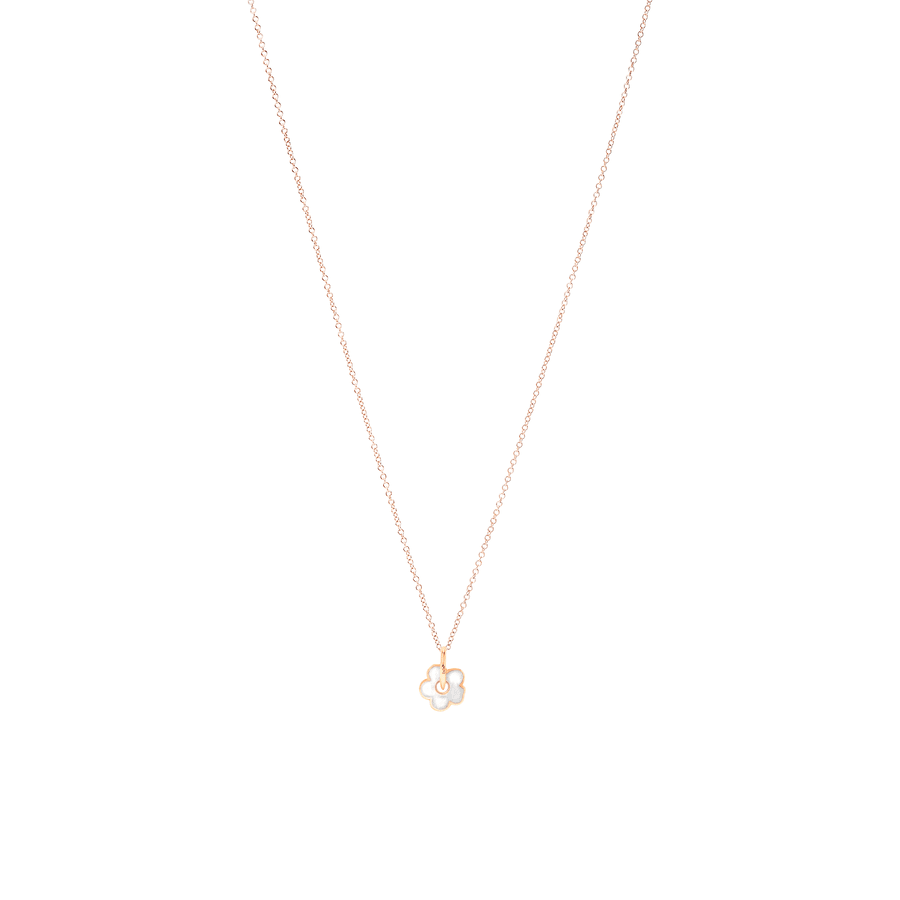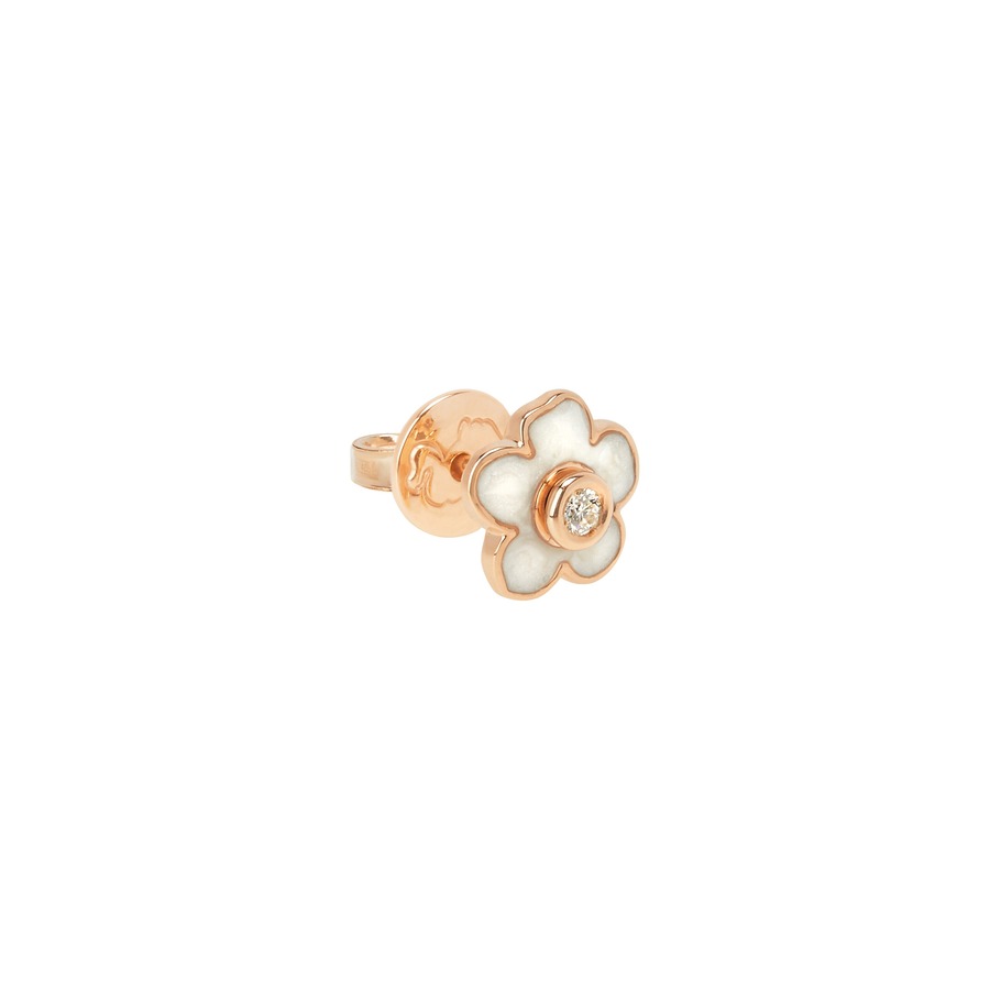 The rose gold ring features a mother-of-pearl enamel corolla that moves and rotates around the center, which is illuminated by a diamond, as do the stud earrings. Moments of surprise, accompanied by precious materials with a refined and feminine aesthetic, involve the wearer and create an intimate bond with her, even with the earrings, where the enameled flower pendant rotates around the hoop earrings.
