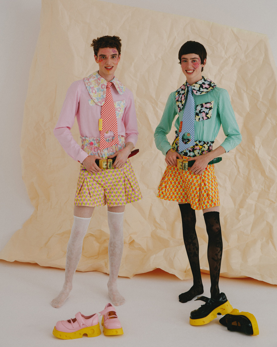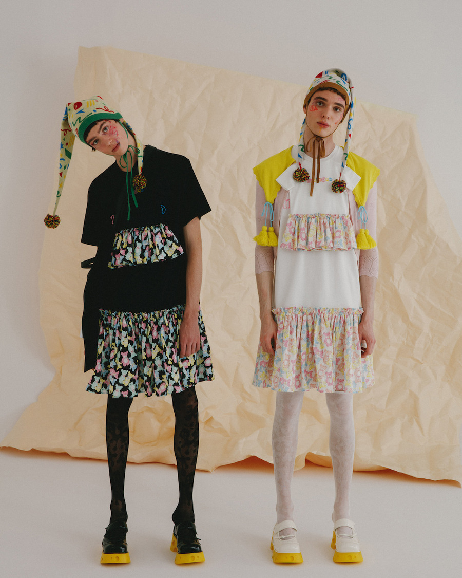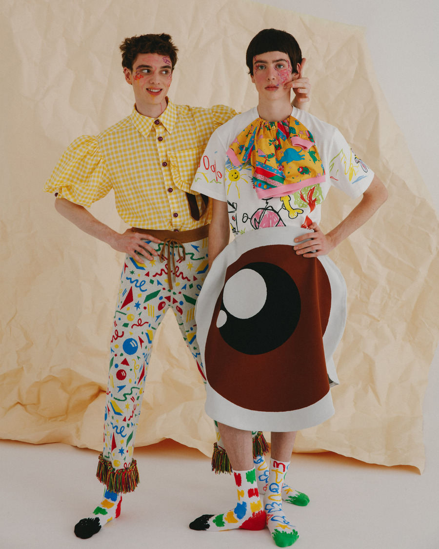 Known for its exploration of a myriad of themes surrounding nostalgia, the label dives headfirst into the narrative of “whimsical childhood familiarity” as the collection comes to life in a familiar house setting this season. Peeking in; you see giggly children in their playroom, the flickering television in the living room, the hushed tete-a-tete between parents in the studies and the escapade of mice around the kitchen. From the silhouettes, prints, and fabrication to the minute details of this collection, many of the garments revamp domestic elements with a tinge of playfulness that motoguo is known for.