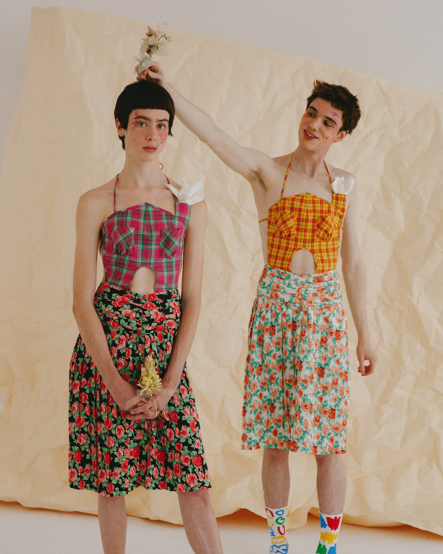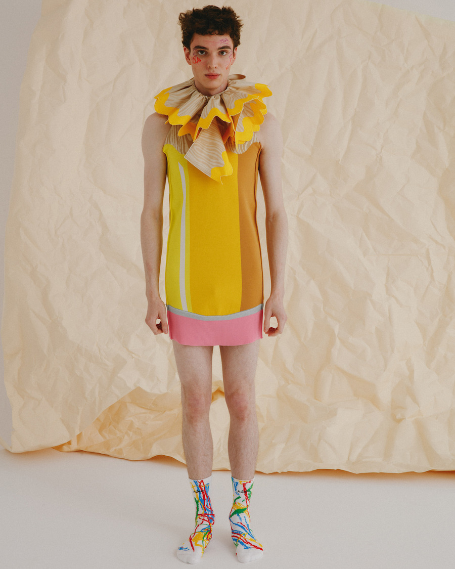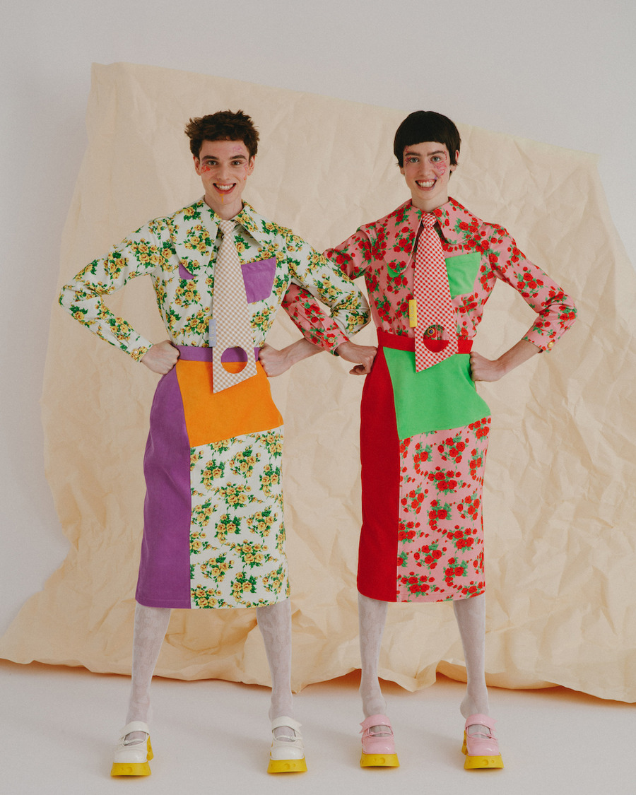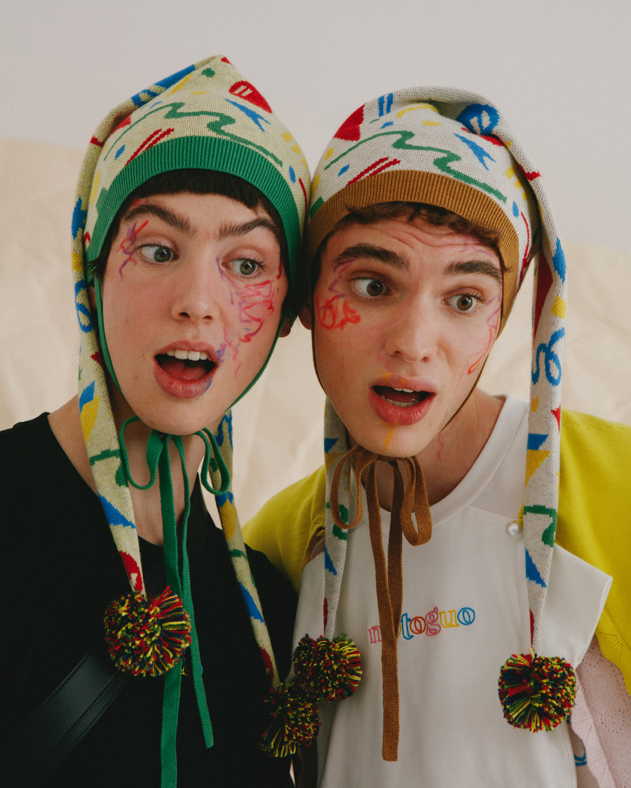 Known for its exploration of a myriad of themes surrounding nostalgia, the label dives headfirst into the narrative of “whimsical childhood familiarity” as the collection comes to life in a familiar house setting this season. Peeking in; you see giggly children in their playroom, the flickering television in the living room, the hushed tete-a-tete between parents in the studies and the escapade of mice around the kitchen. From the silhouettes, prints, and fabrication to the minute details of this collection, many of the garments revamp domestic elements with a tinge of playfulness that motoguo is known for.