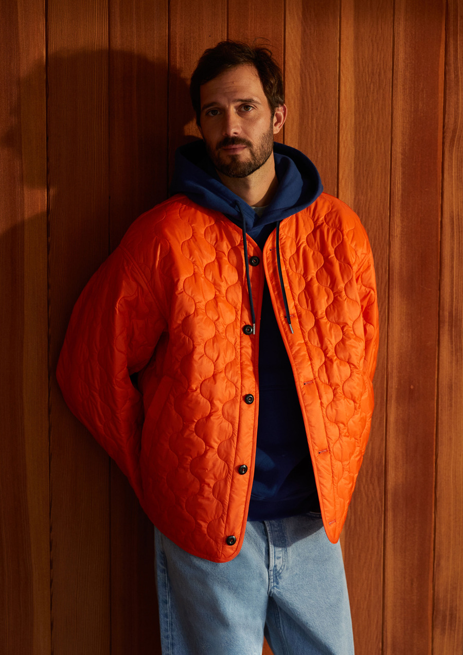 Menswear highlights include a rugby shirt, available in both a striped red and orange, and green and yellow, a quilted jacket and matching gilet vest in lilac, and a mustard long-sleeved T-shirt with Planet Good Earth pocket and rear graphic. Extra attention has also been paid to fabrications – a windbreaker is available in blue and green and is designed in Limonta fabric, a highly regarded, premium technical fabric made in Italy. Accessories include a multicoloured five-panel cap, lilac and green beanie and two colour-block ribbed rugby socks.