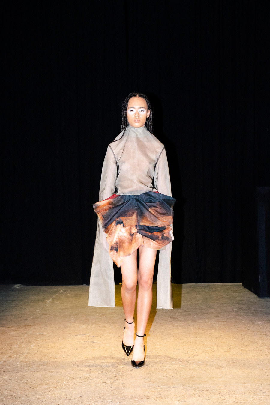 Illuminated by a dynamic beam of light that danced with the rhythm of the show, each ensemble was meticulously highlighted, guiding the audience’s focus through fluid choreography. The models’ movements spoke volumes, echoing themes of transparency and obfuscation—each step a deliberate narrative that engaged and intrigued.