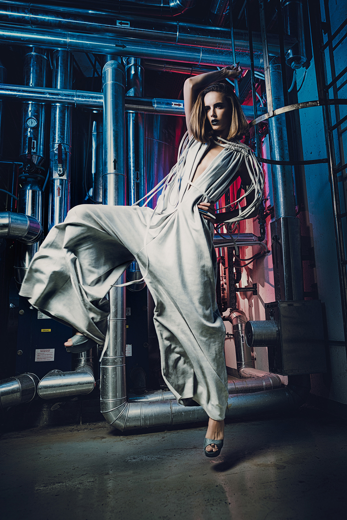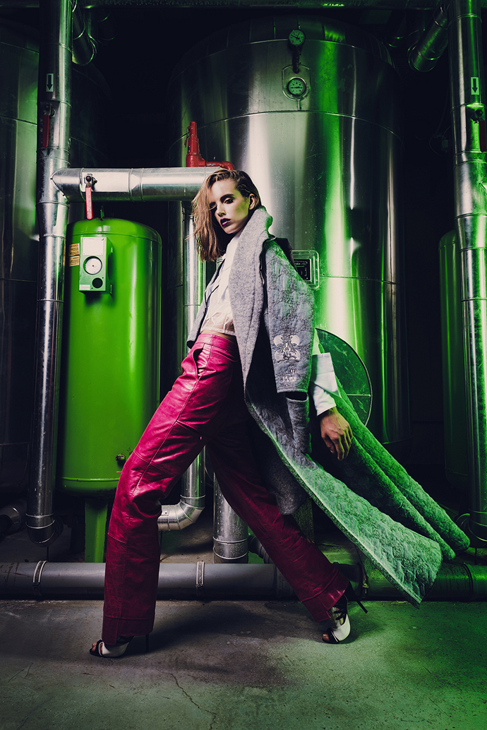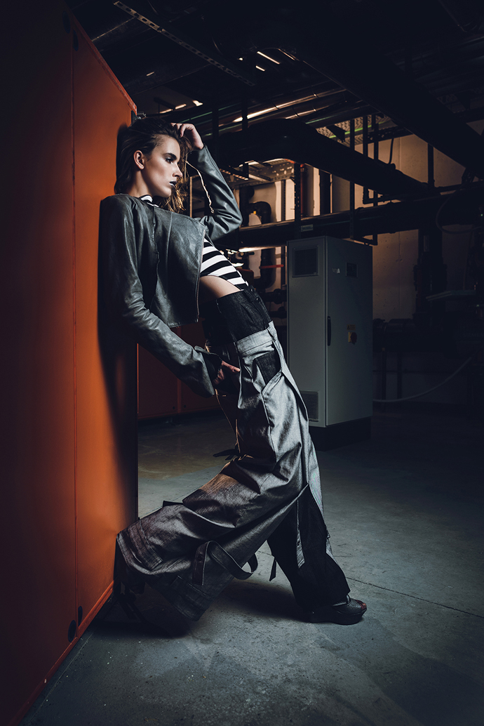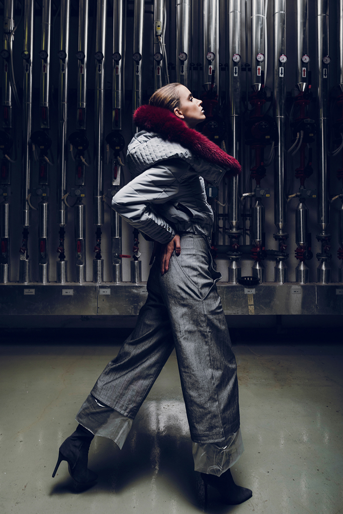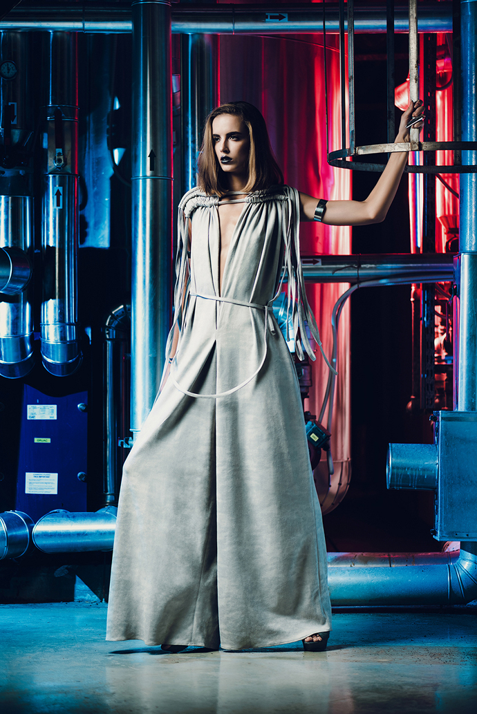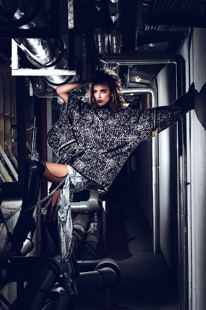 KALTBLUT presents fashion brand: Jamoi. Photography by Filip Gržinčić. Model is Marija Silov signed at FOX. Jamoi is pleased to announce Mute Adoration 6-1 editorial. Shot inside the machine room of Kantrida Pools, the Street Style Sessions collection pays homage to fashion’s eclecticism in the most indicative synesthetic mode. Influences of intricate, sharp cuts allude elaborative Japonesque pattern making, while merged with oversized, baggy pieces of hip-hop culture. Opposites at first glance, become companions the very next moment intertwining threads of tension into a fabric of distinct elegance meeting sex appeal. Emerging elevated harmony of this amalgamation of sensuous fragments becomes an indecipherable white noise of pure artistic flavor layered over impeccable overload of textures and chroma. All natural fabrics, in subtly unified palette brought tranquility to absolutely unbridled cuts. The haute-couture like dedication to detail applied on basic streetwear, gave this collection its determined uniqueness in embodying the female world traveler of today: a fierce, sleek risk-taker with a strong sense of self-creation and drive.