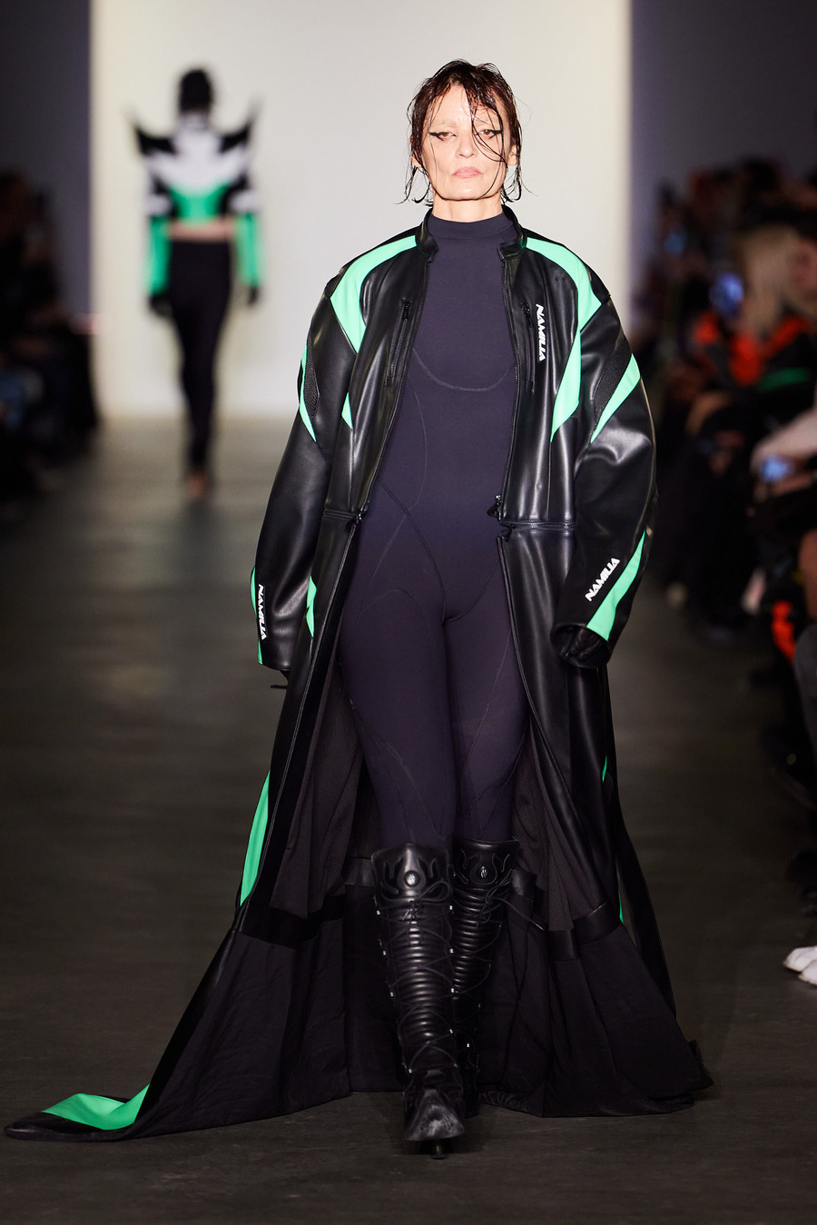 As a result, they not only correspond to the fashionable philosophy of NAMILIA: They are uncompromising, feminist, anti-racist and pro-trans. They stand for sexual freedom and celebrate the uniqueness of everyone. Nan Li and Emilia Pfohl found inspiration this season in motocross. Starting with the colour palette, which is dominated by black and broken up by signal colours such as neon orange, neon yellow and strong blue, the silhouettes also have their roots in racing and progressively play with volume. Extremes meet, such as wide and high-cut over knees, pleated mini skirts, cropped tops, XXL coats and tight-fitting overalls.