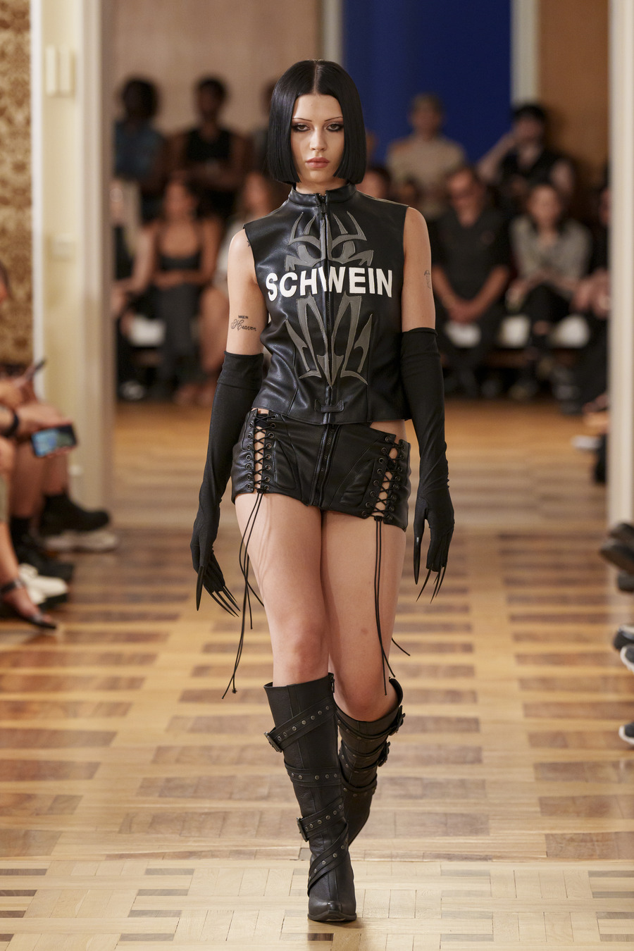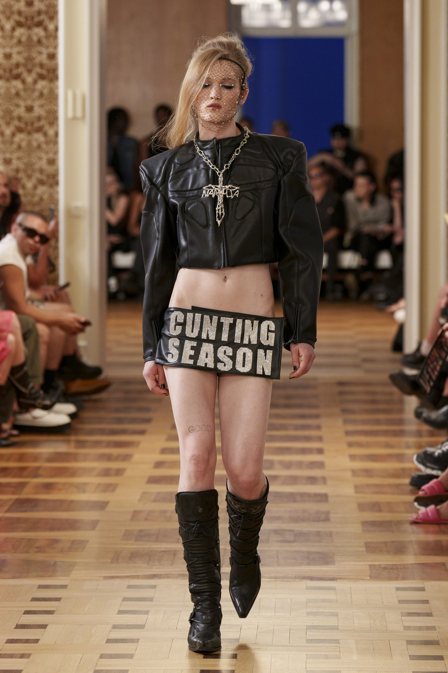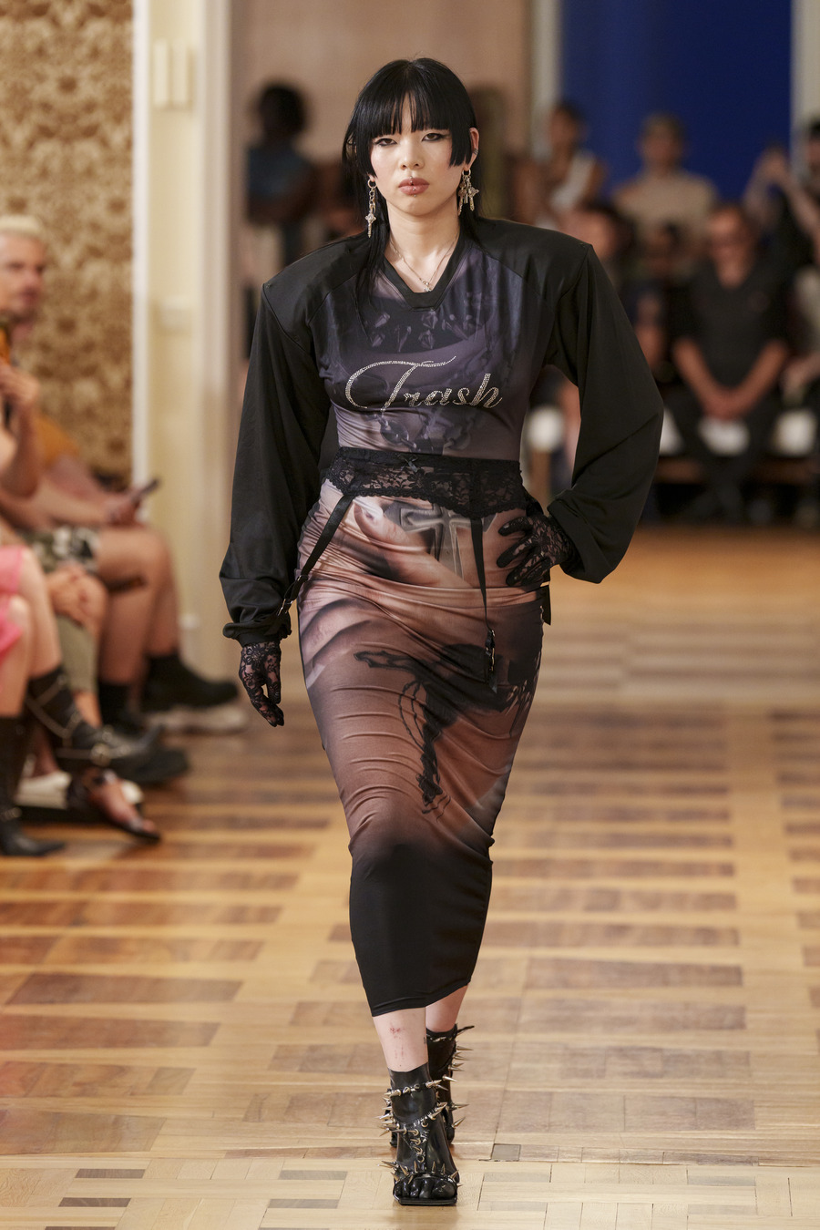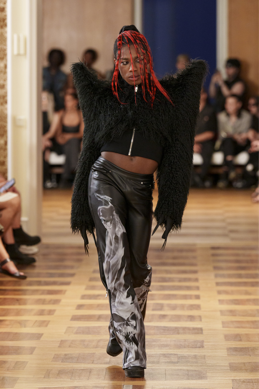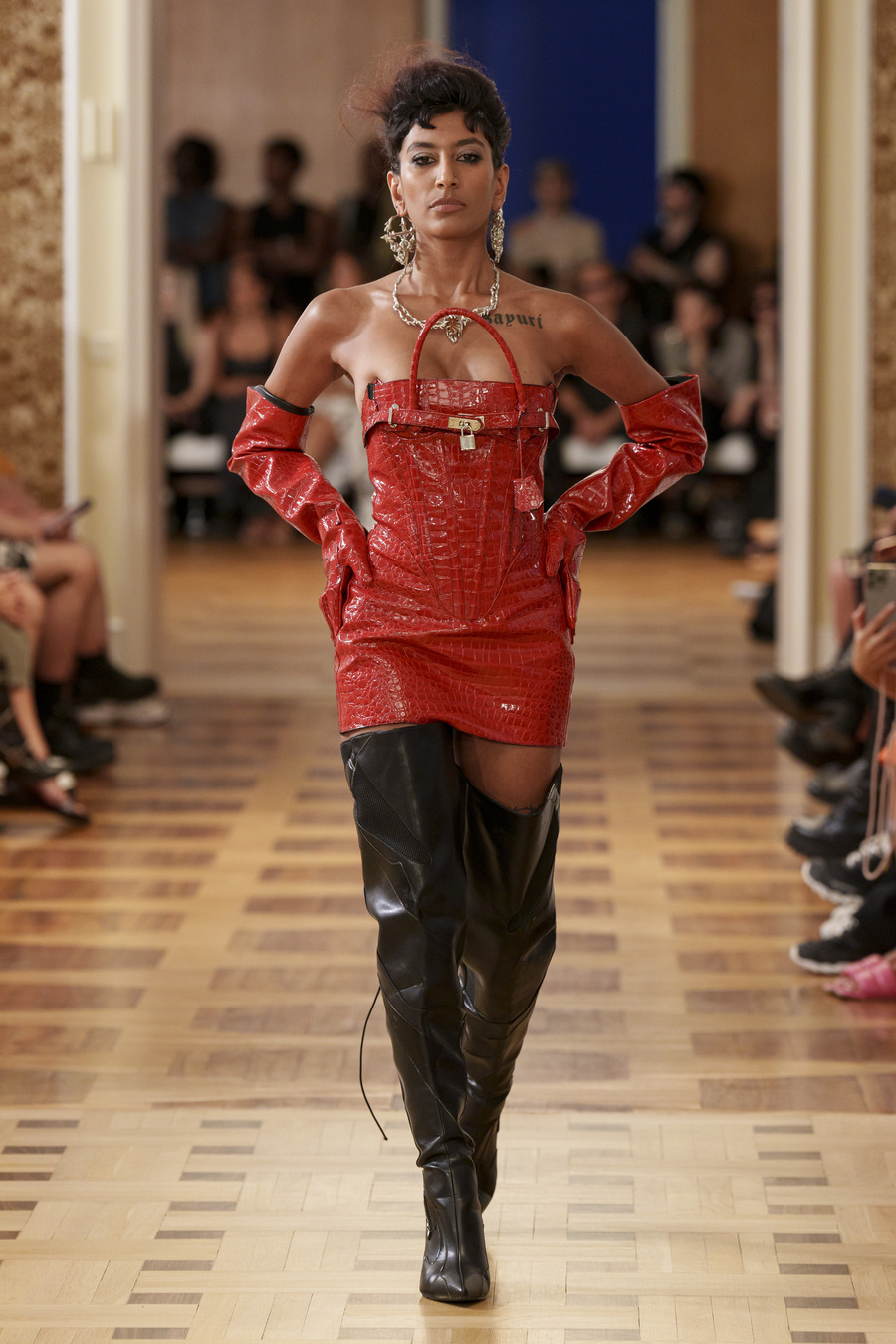 One standout design, reminiscent of 90s goth and Cher from “Clueless,” features a maxi skirt and a mesh cardigan adorned with silver crosses. Another captivating ensemble consists of a bra top paired with a vibrant pink faux leather skirt embossed with a crocodile pattern, reminiscent of a luxurious handbag. However, the absolute showstopper is a red patent leather mermaid skirt, flawlessly styled with a bra and edgy motorcycle gloves.
