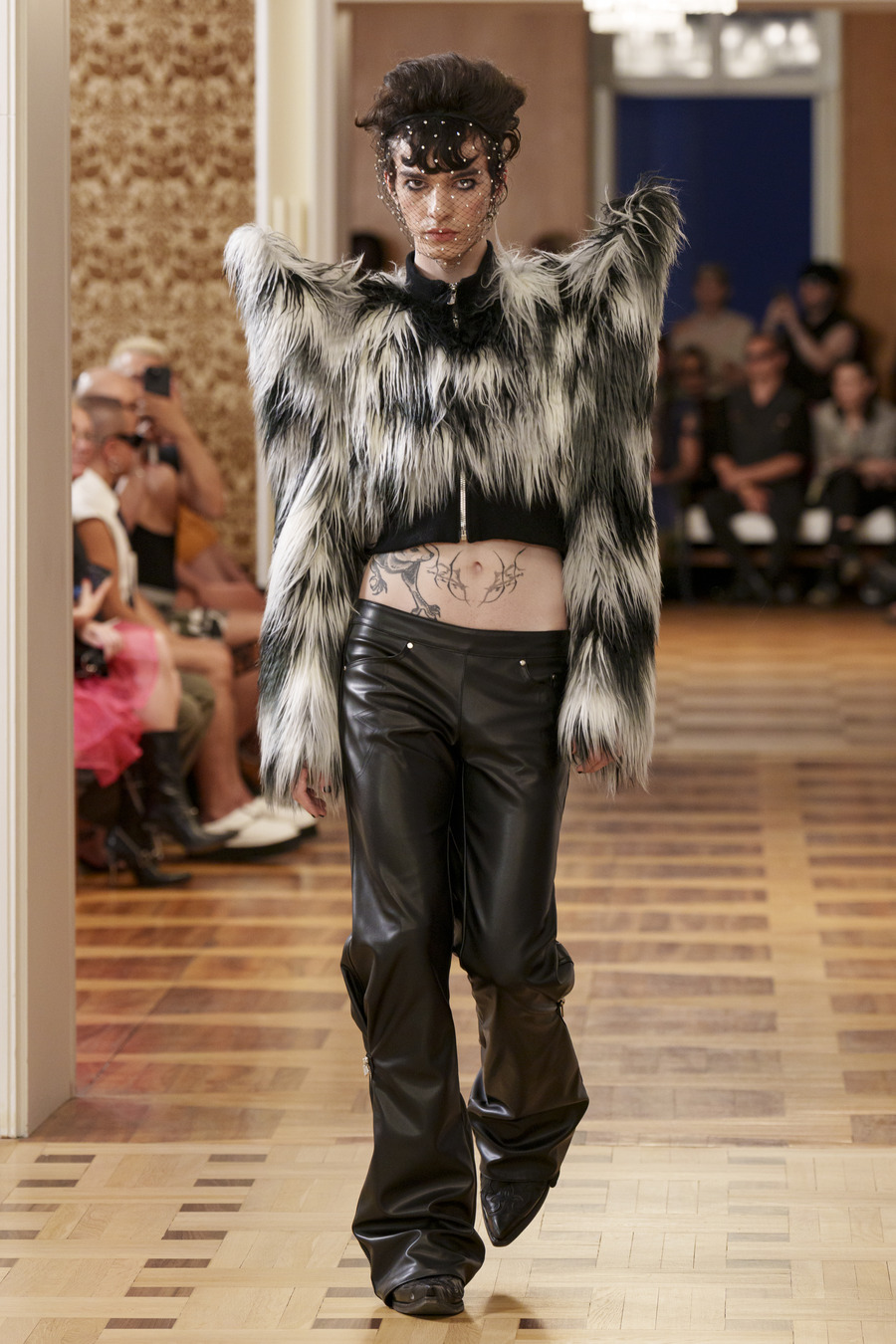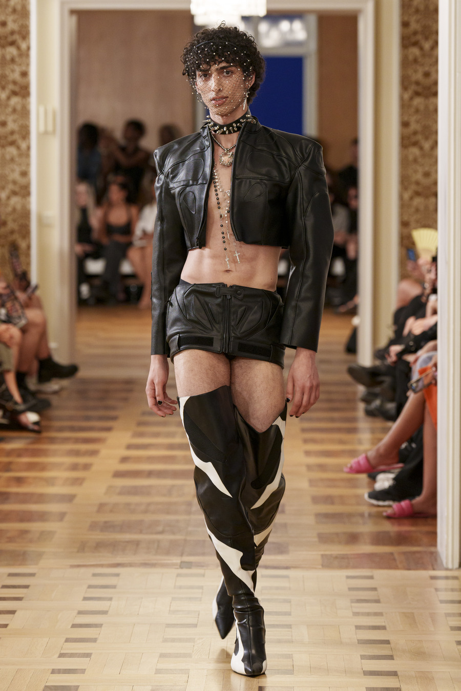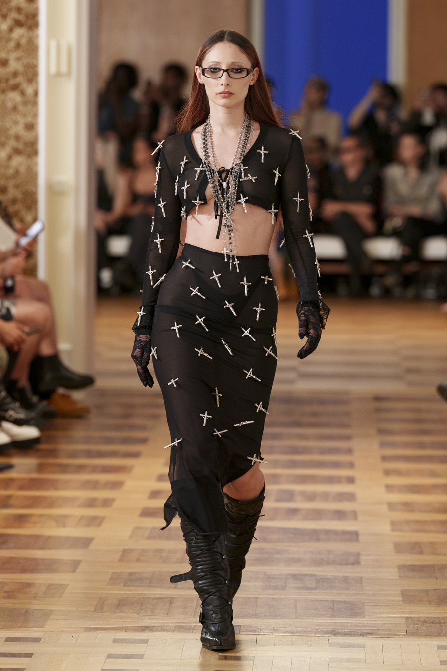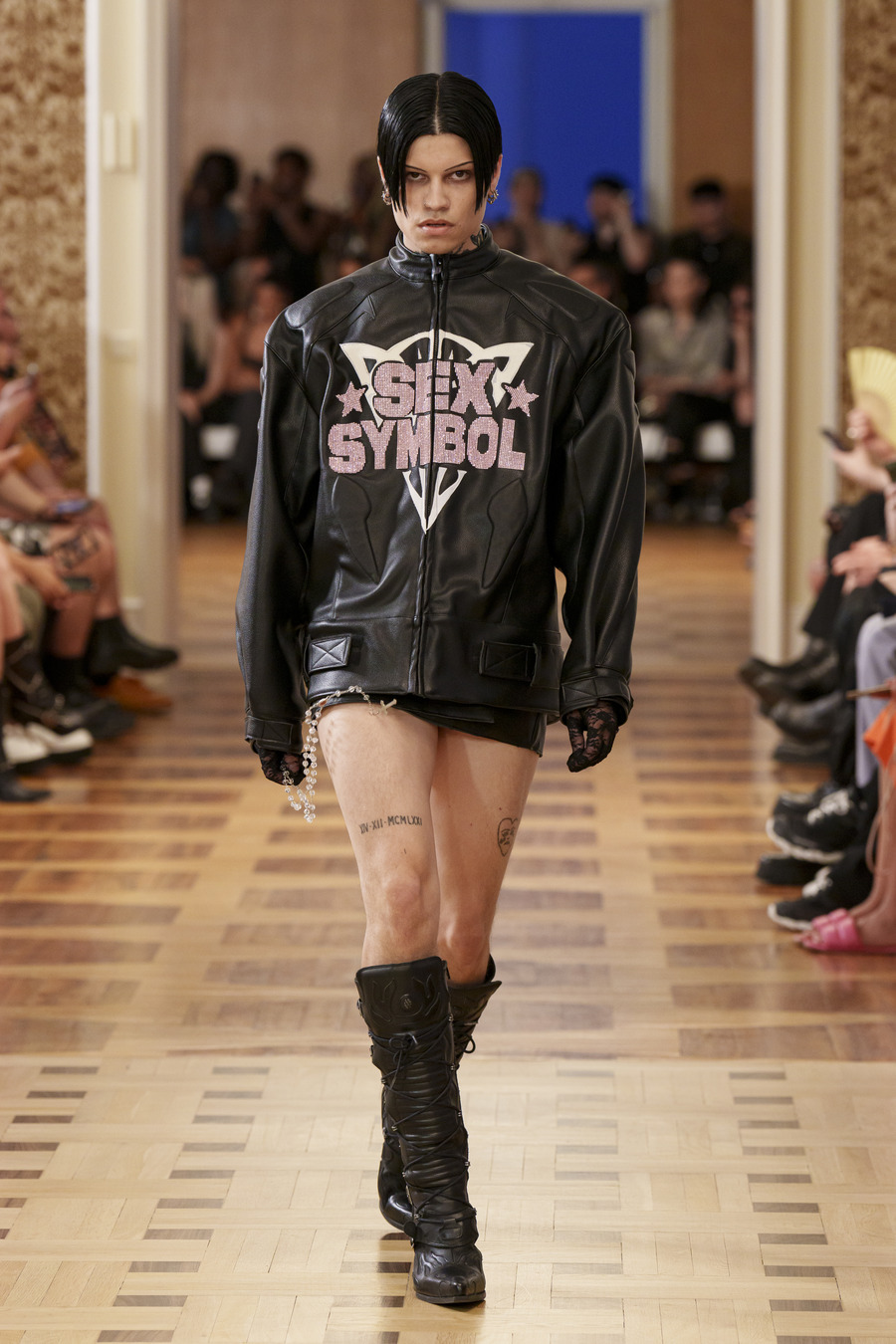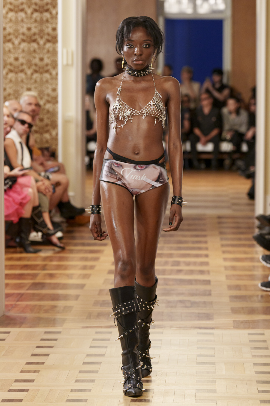One standout design, reminiscent of 90s goth and Cher from “Clueless,” features a maxi skirt and a mesh cardigan adorned with silver crosses. Another captivating ensemble consists of a bra top paired with a vibrant pink faux leather skirt embossed with a crocodile pattern, reminiscent of a luxurious handbag. However, the absolute showstopper is a red patent leather mermaid skirt, flawlessly styled with a bra and edgy motorcycle gloves.